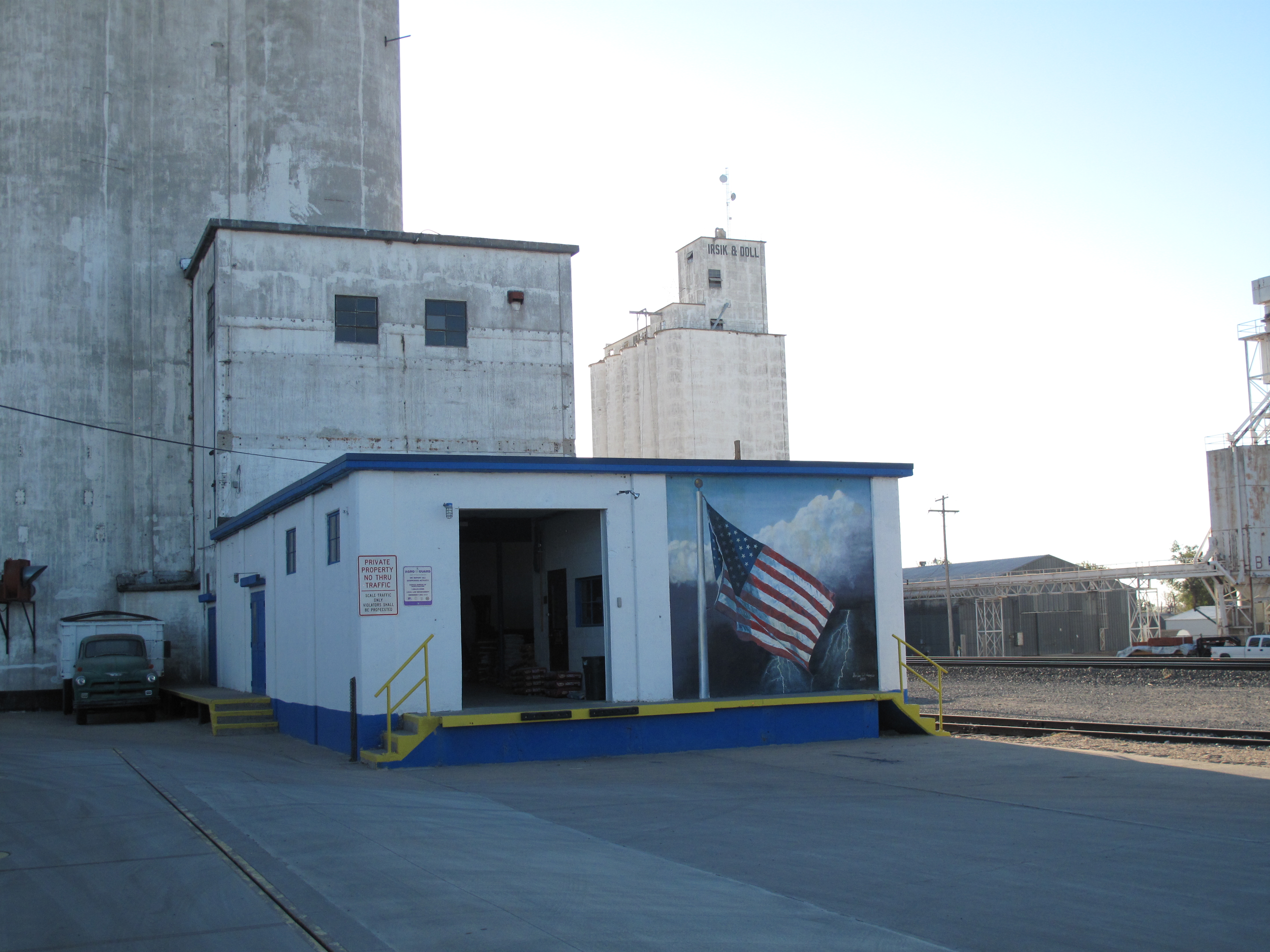At the grain elevator down the street the foreman blows the horn as I take a photo of an American flag painted on the side of his office.  This particular rendering includes bolts of lightning coming from a dark turbulent sky, reminiscent of the violent storms that rage through these plains.  Tracks of the Atchison, Topeka & Santa Fe service the grain elevators.  These are working train tracks, not like the abandoned ones I am more used to seeing.