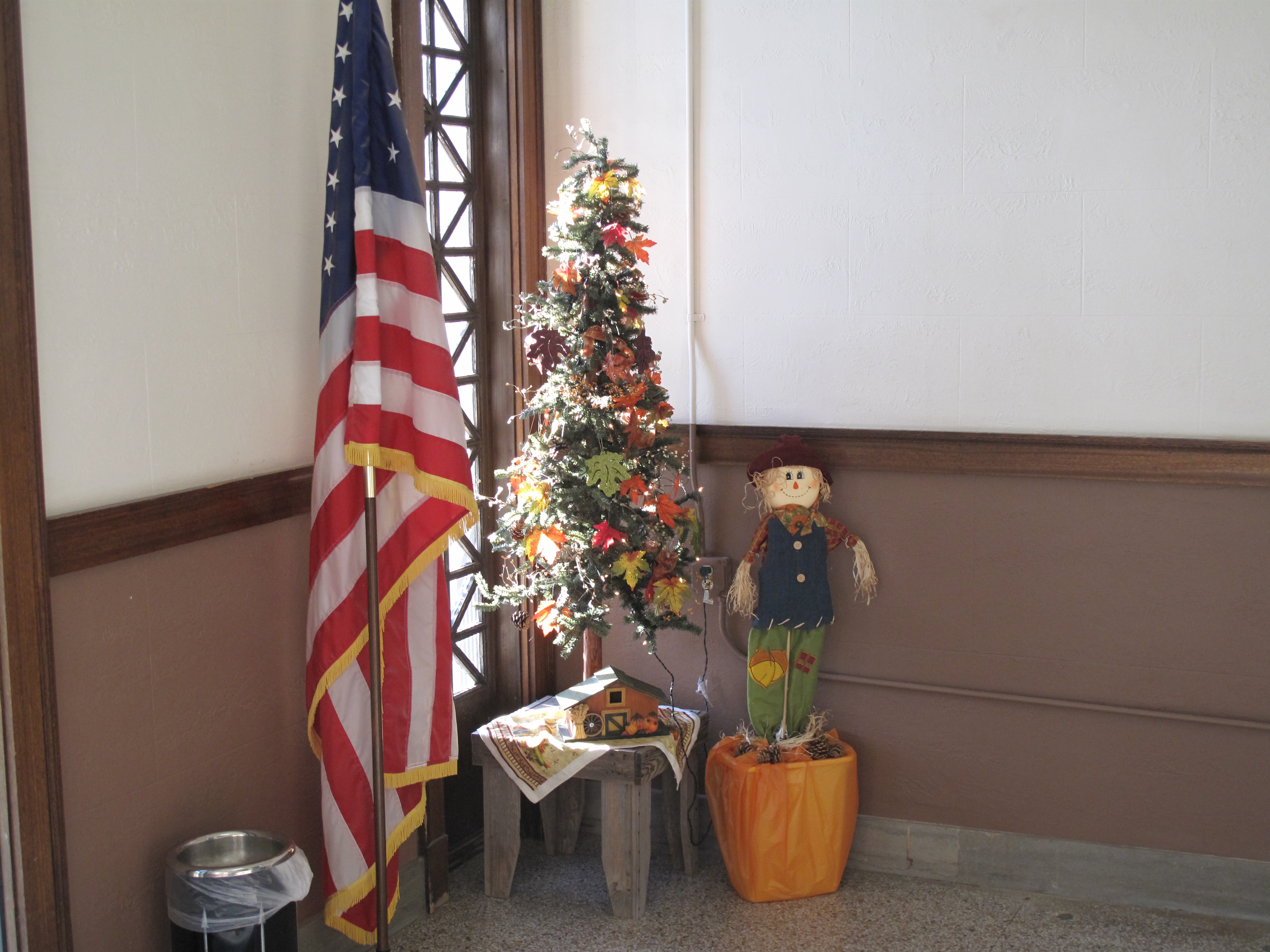 Just inside the front entrance, next to an American flag, is an Autumn tree.  (I don’t really know what it’s called because I’d never seen anything like it before so I’m calling it an Autumn tree).  Like an artificial Christmas tree, it’s supported by a central pole surrounded by green spruce fronds and decorated with Fall leaves and Halloween ornaments.  The staff must have put this together.  I hope it becomes a national trend.