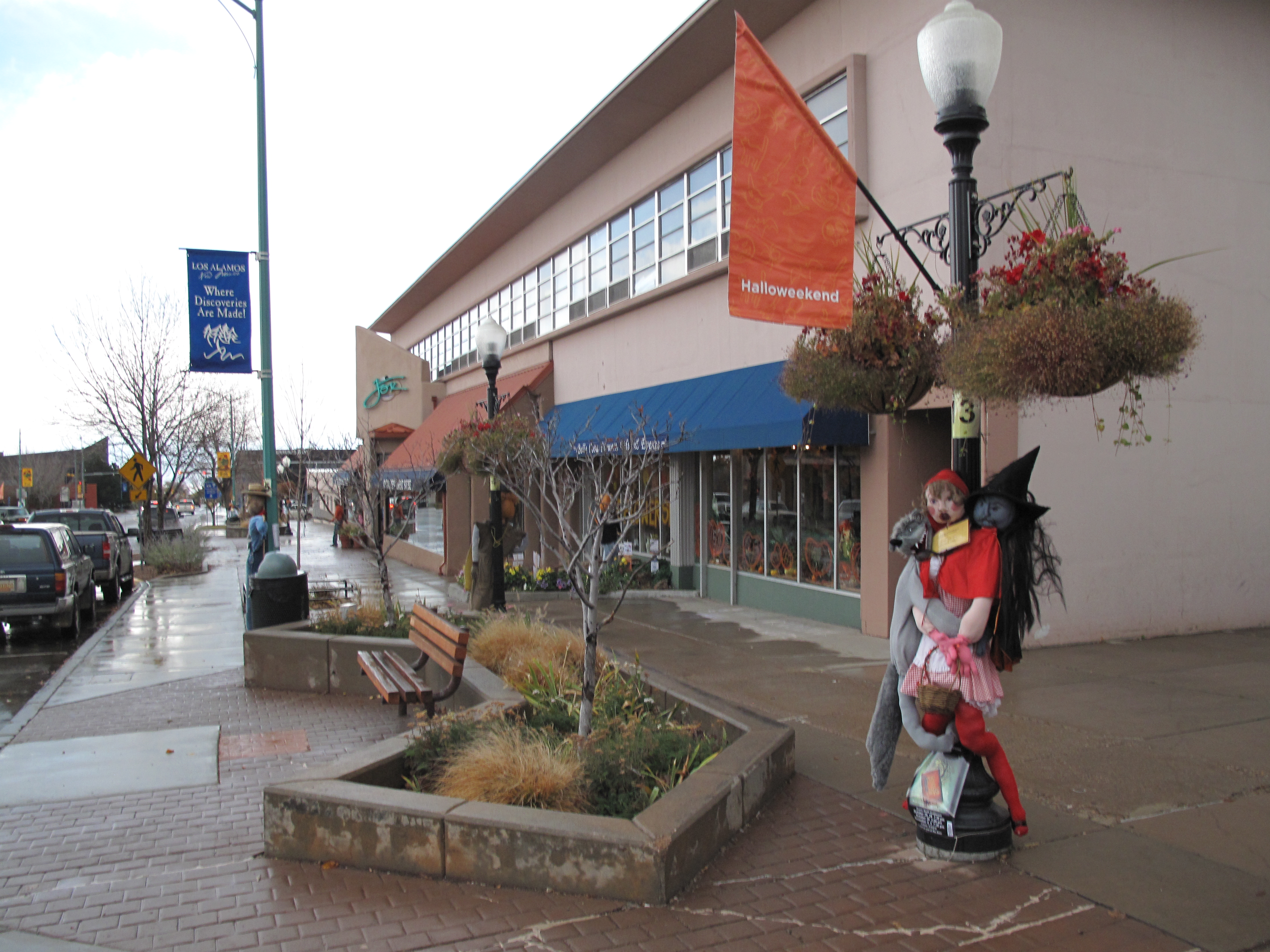 Los Alamos has a discernable business district with two wide avenues, stores, restaurants, and even a Starbucks. It is also a residential enclave for professionals with families.  I saw a lot of little children about.  With Halloween upcoming Central Avenue was festively decorated with flower baskets and straw-stuffed scarecrows tied to lampposts.