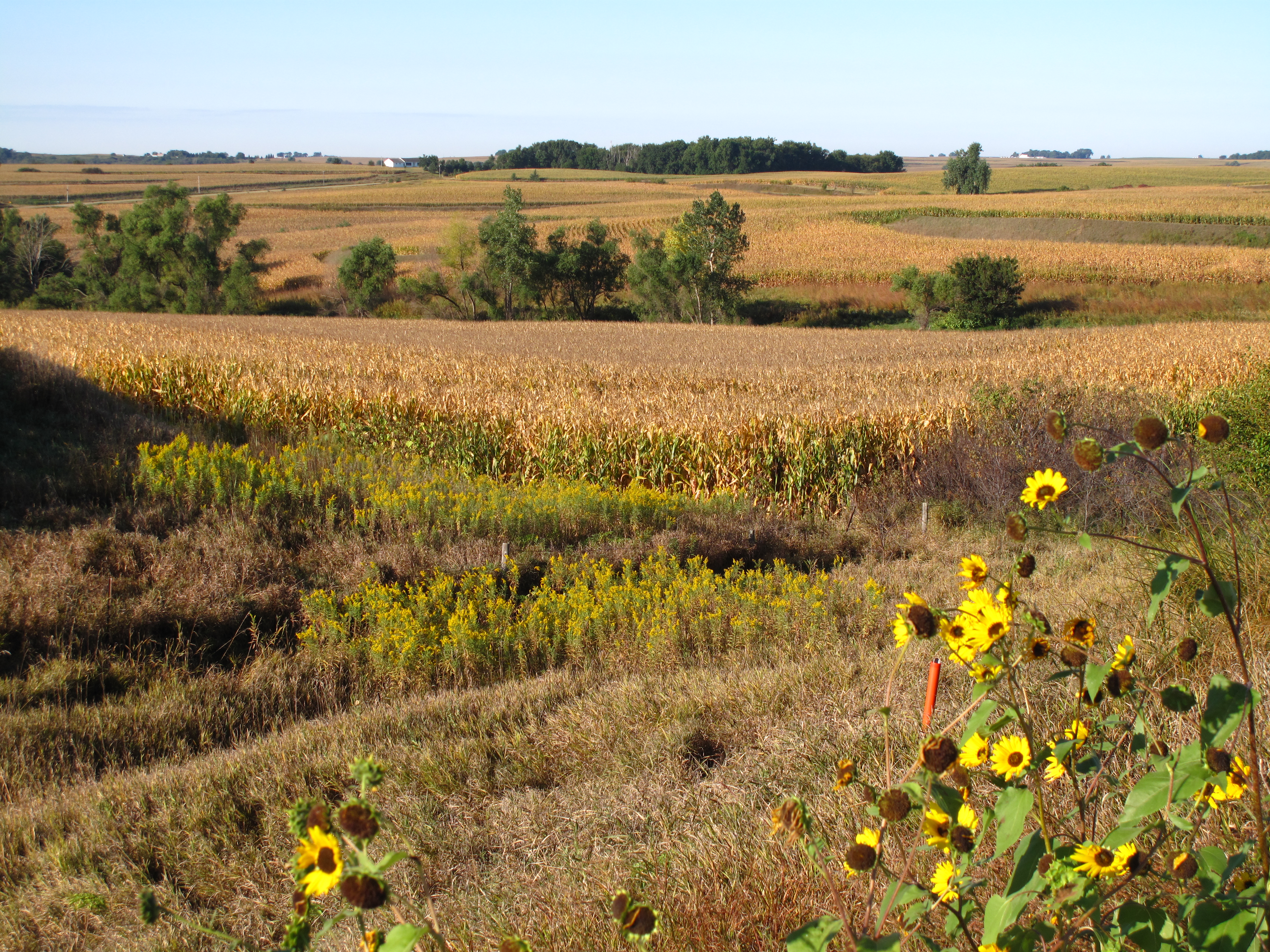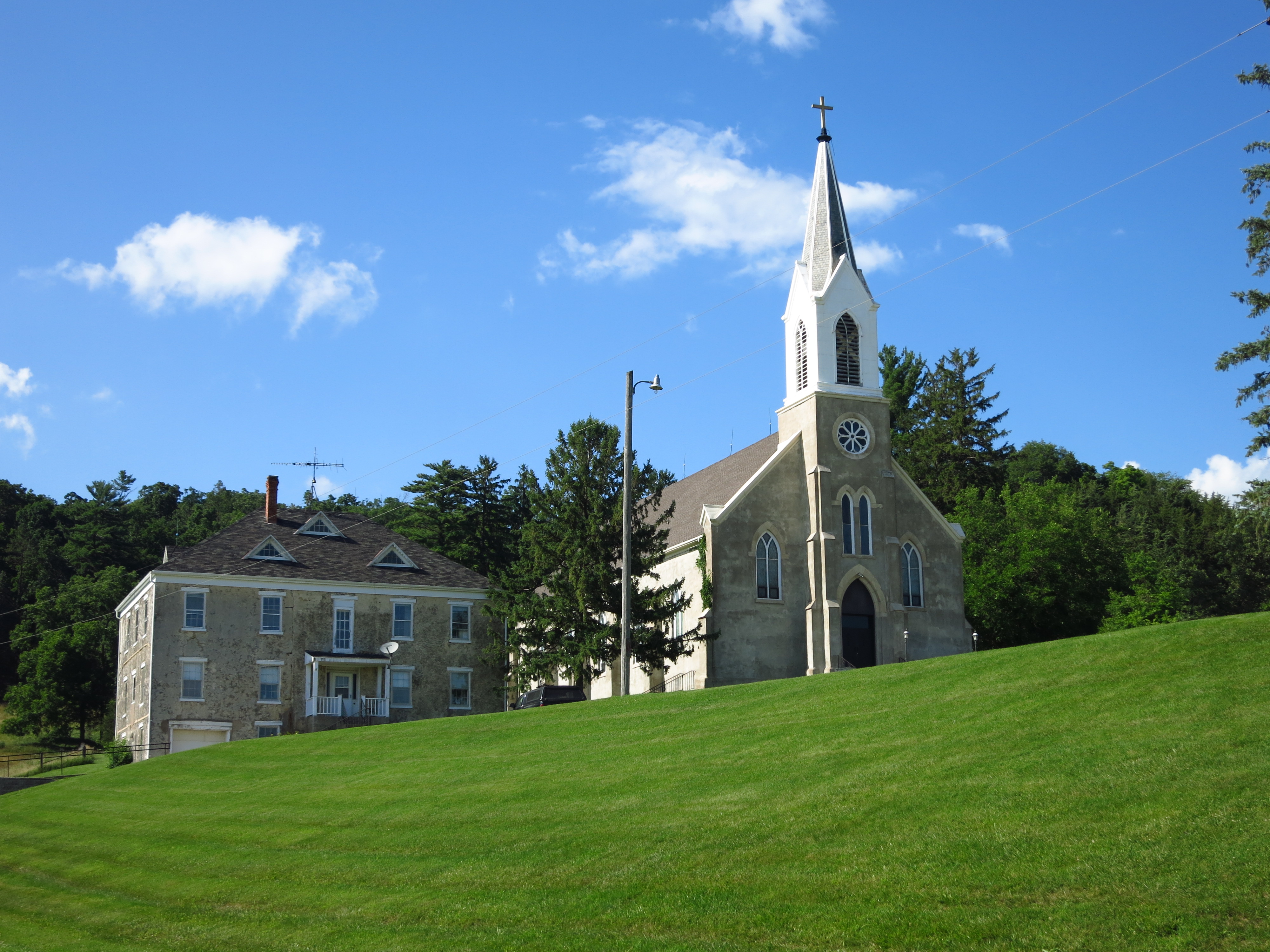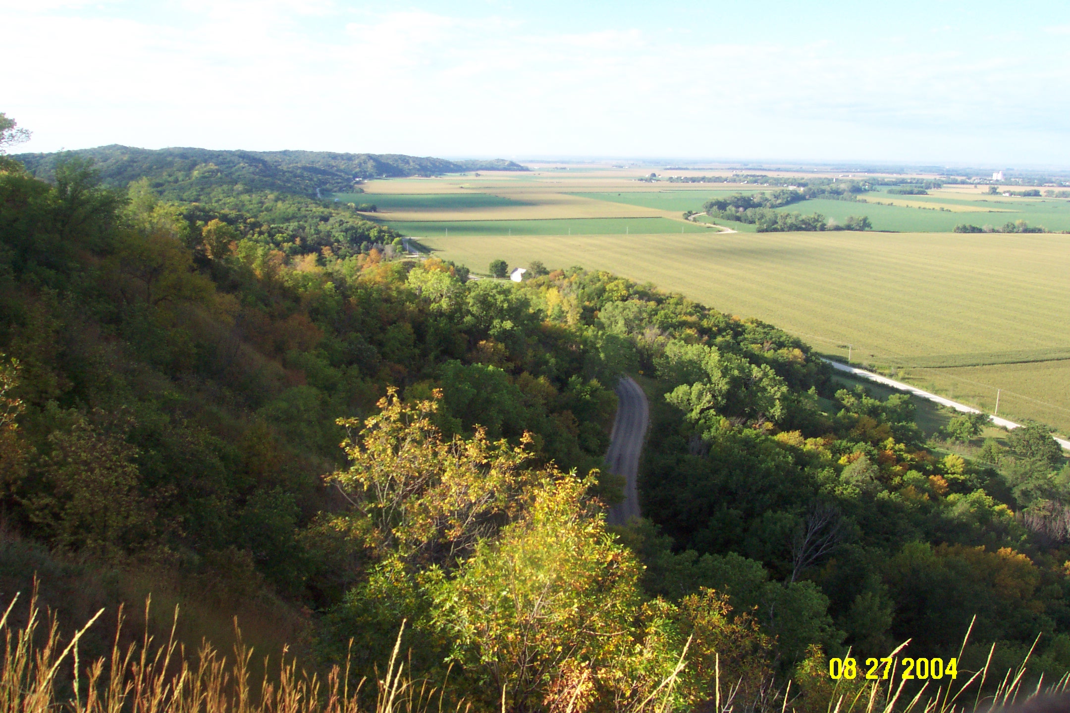 Iowa — Farmhouses, Baseball, Cornfields, Old Churches, and Loess Hills:  The first two photos are from the Field of Dreams farm/set near Dyersville; the third shows late-summer cornfields outside Sioux City; the fourth is a view of the old St. Donatus church in July; the fifth shows a country road winding through the Loess Hills (yes, hills in Iowa!) along the eastern banks of the Missouri River floodplain.  The Loess Hills are ancient accumulations of wind-borne glacial debris.
