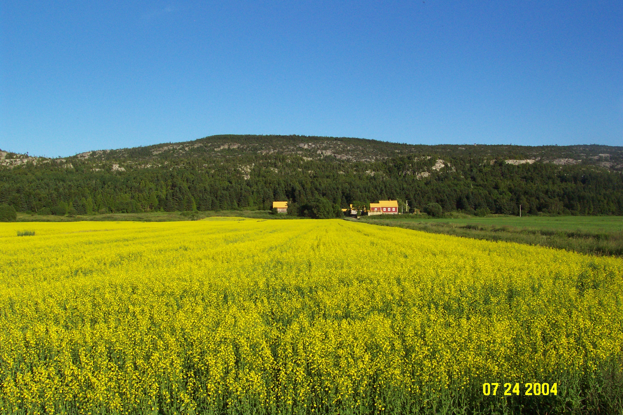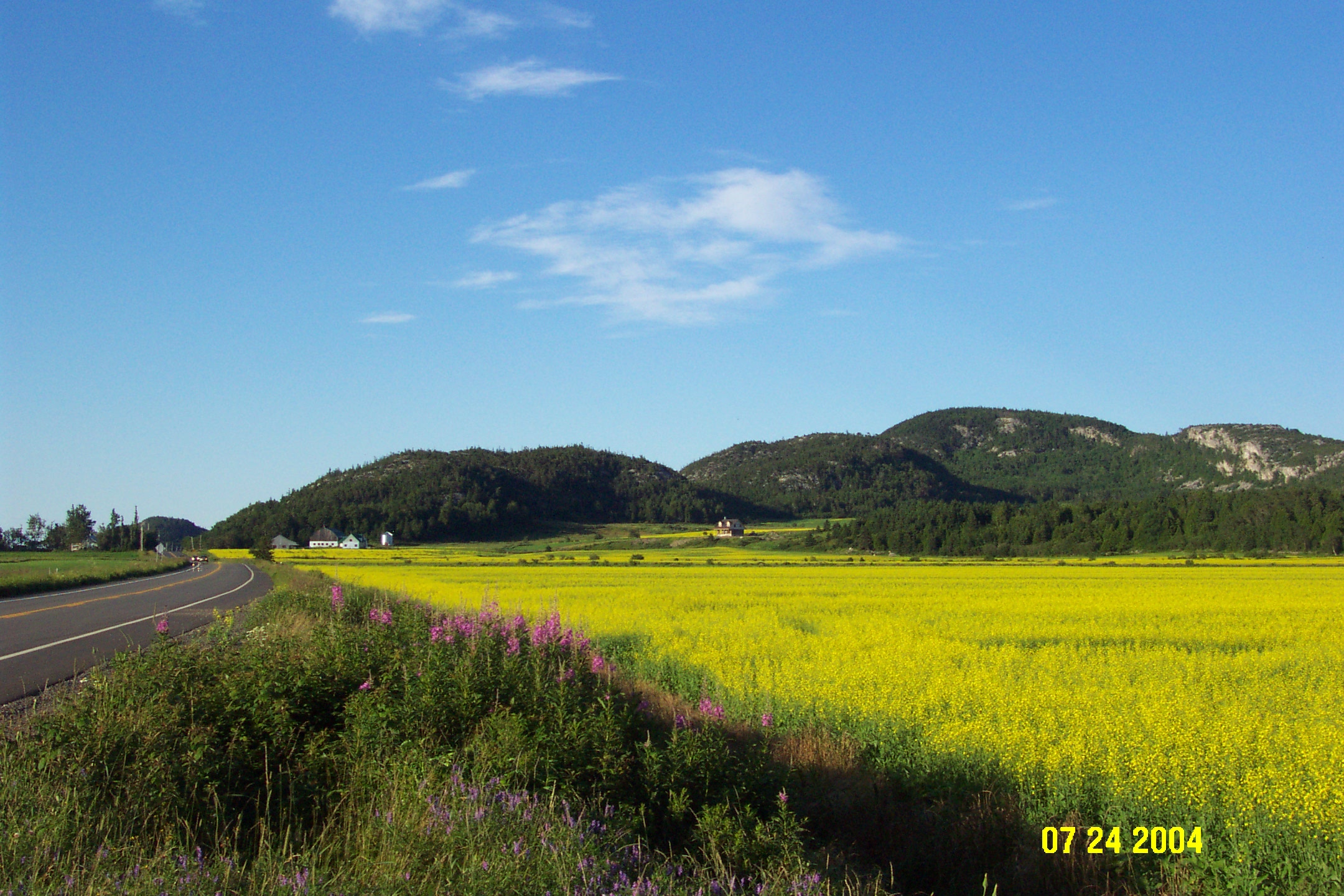 Canola Fields near St. Andre, Quebec, Canada: Bright yellow canola can turn a plain field into an impressionist landscape.  Nice of them to add the purple flowers along the roadside, though I imagine the more stolid types would call those weeds.  The rocky hills in the background are probably glacial deposits; they form the boundaries of the St. Lawrence River Valley.