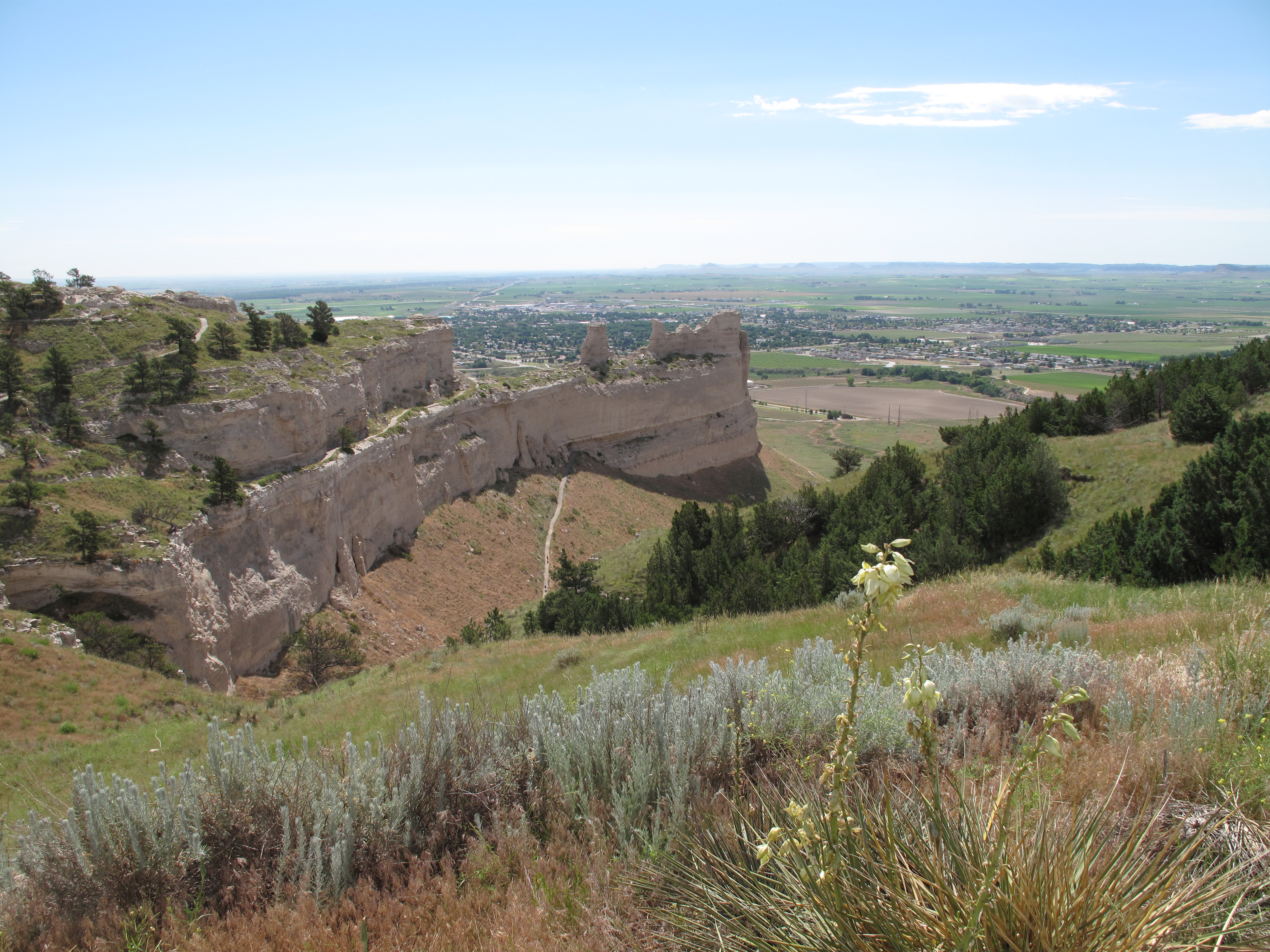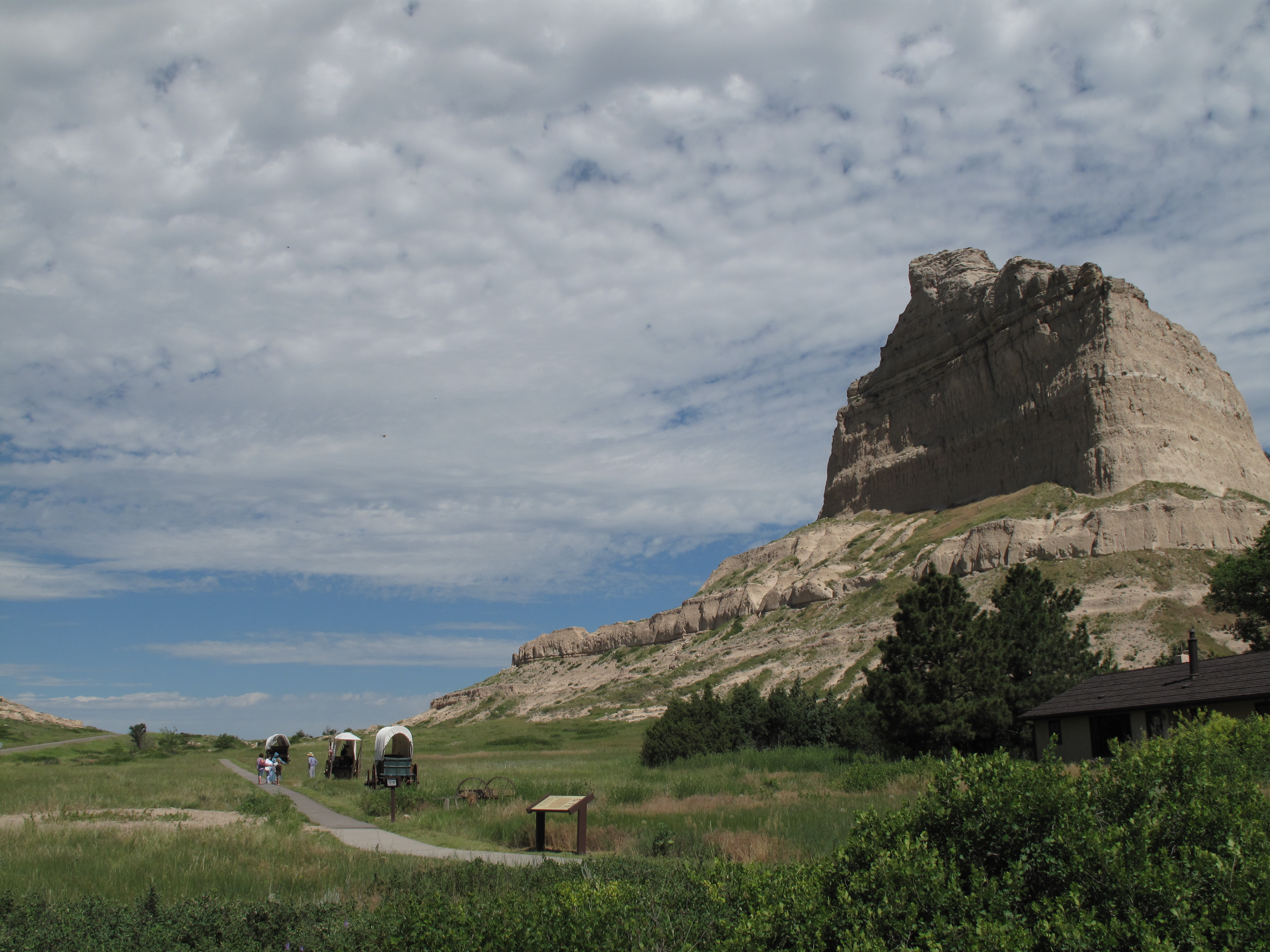 The Hot Summer Sun near Scottsbluff, Nebraska:  Scotts Bluff was an important landmark along the Oregon Trail. It rose so suddenly out of the Nebraska prairie that Oregon-bound wagon trains could see the rock formations for days before reaching them.  These photos to me epitomize the summer heat.  Bugs, dust, sweat, sunburn, biting insects, and rattlesnakes enhanced the experience.  In winter the bluffs are subject to blizzards and covered in snow.