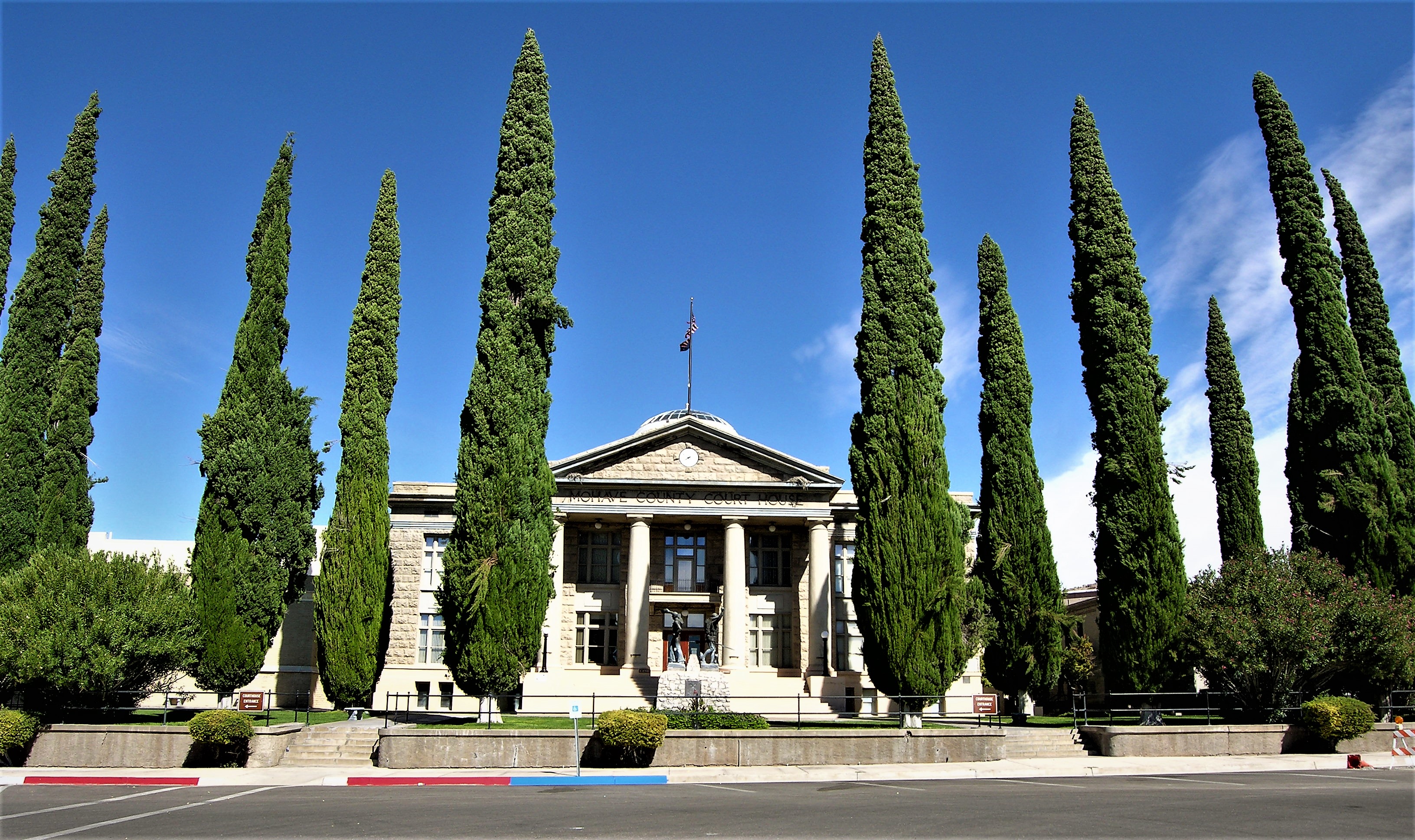 A few blocks off Beale Street the Mohave County Courthouse stands like a Roman temple above the forum.  Built in 1914 of local gray stone, it emerges behind a line of tall, thick juniper trees.  The trees are three stories high; the courthouse is only two, but the cupola adds maybe another story and a half.  The building stands at the top of Fourth Street, looking down on Kingman from above – a good place from which to administer Justice.