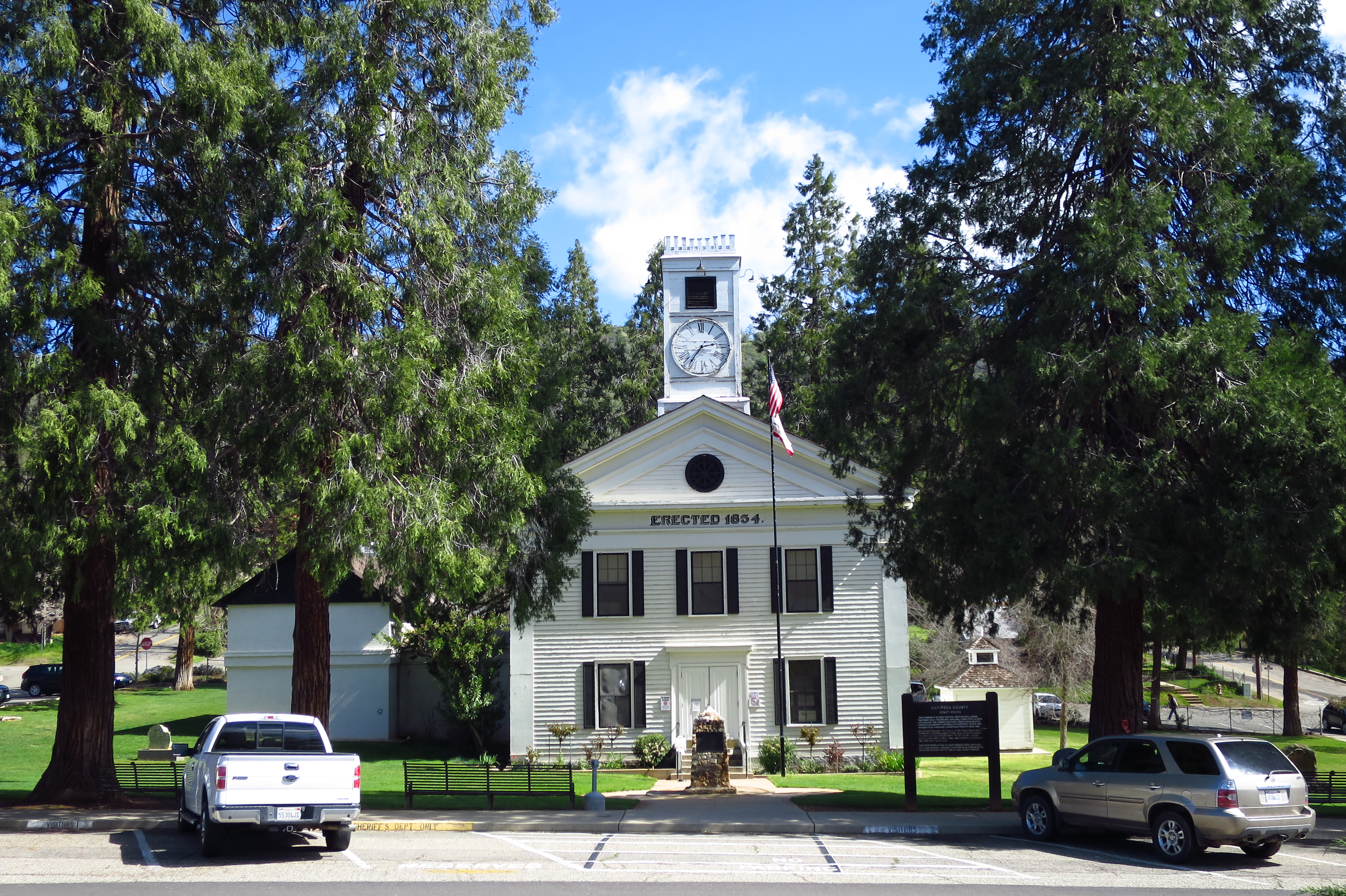 Mariposa is an old gold mining town and the seat of Mariposa County. The old courthouse was built in 1854, was the scene of some landmark mining cases, and is still in use today. It’s the oldest county courthouse in the state of California. It may be even older than the two Sequoia trees which guard the front entrance.