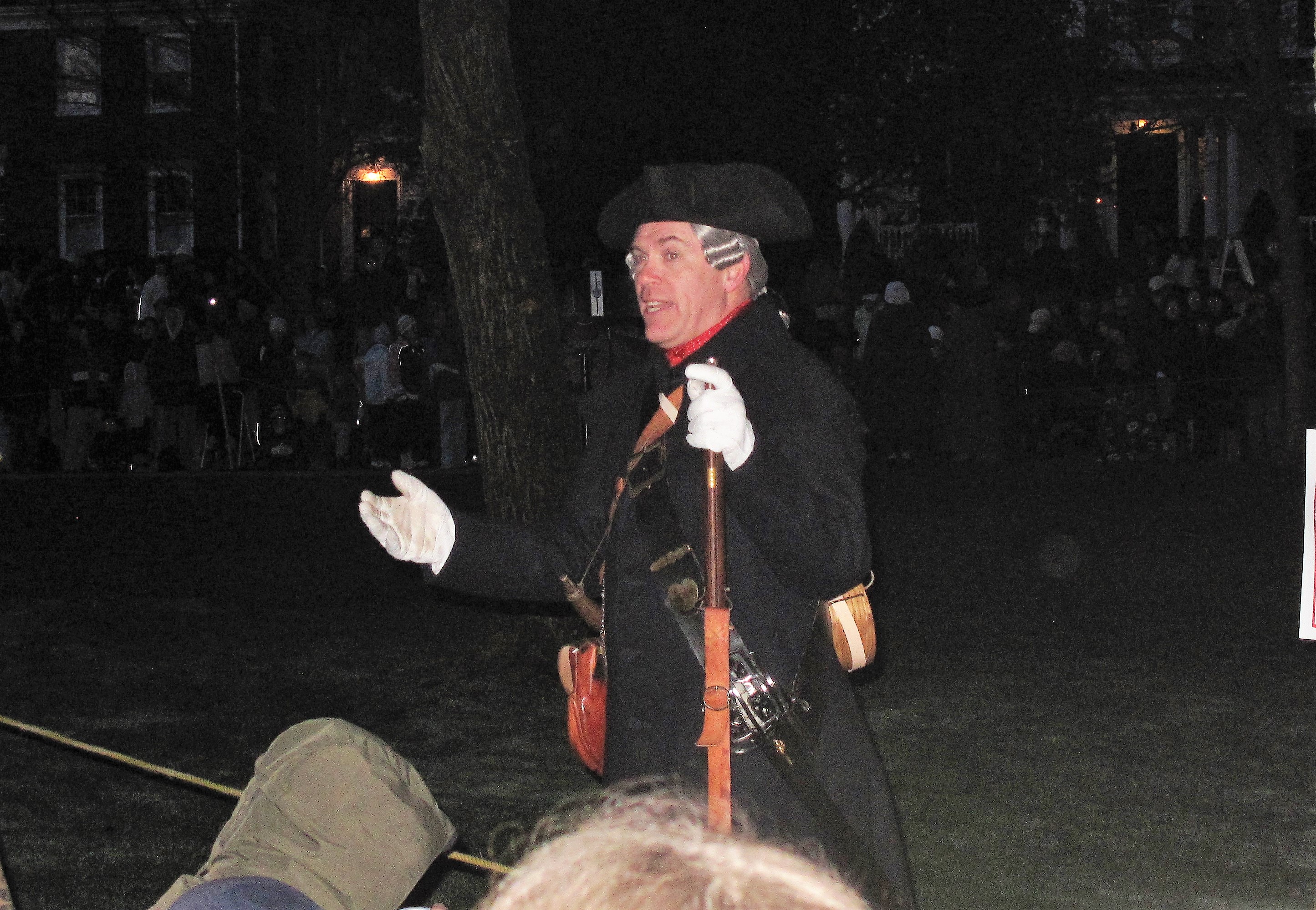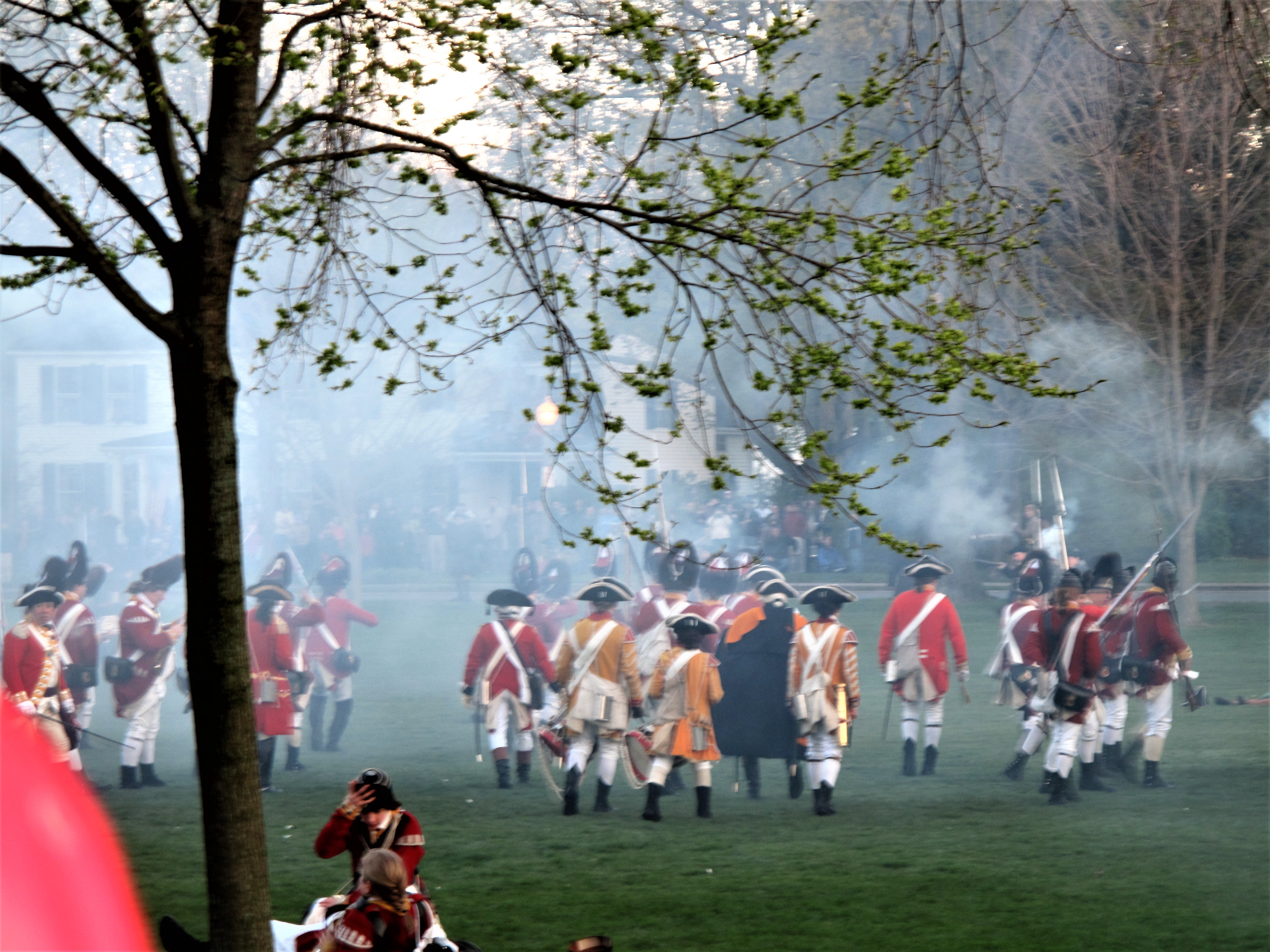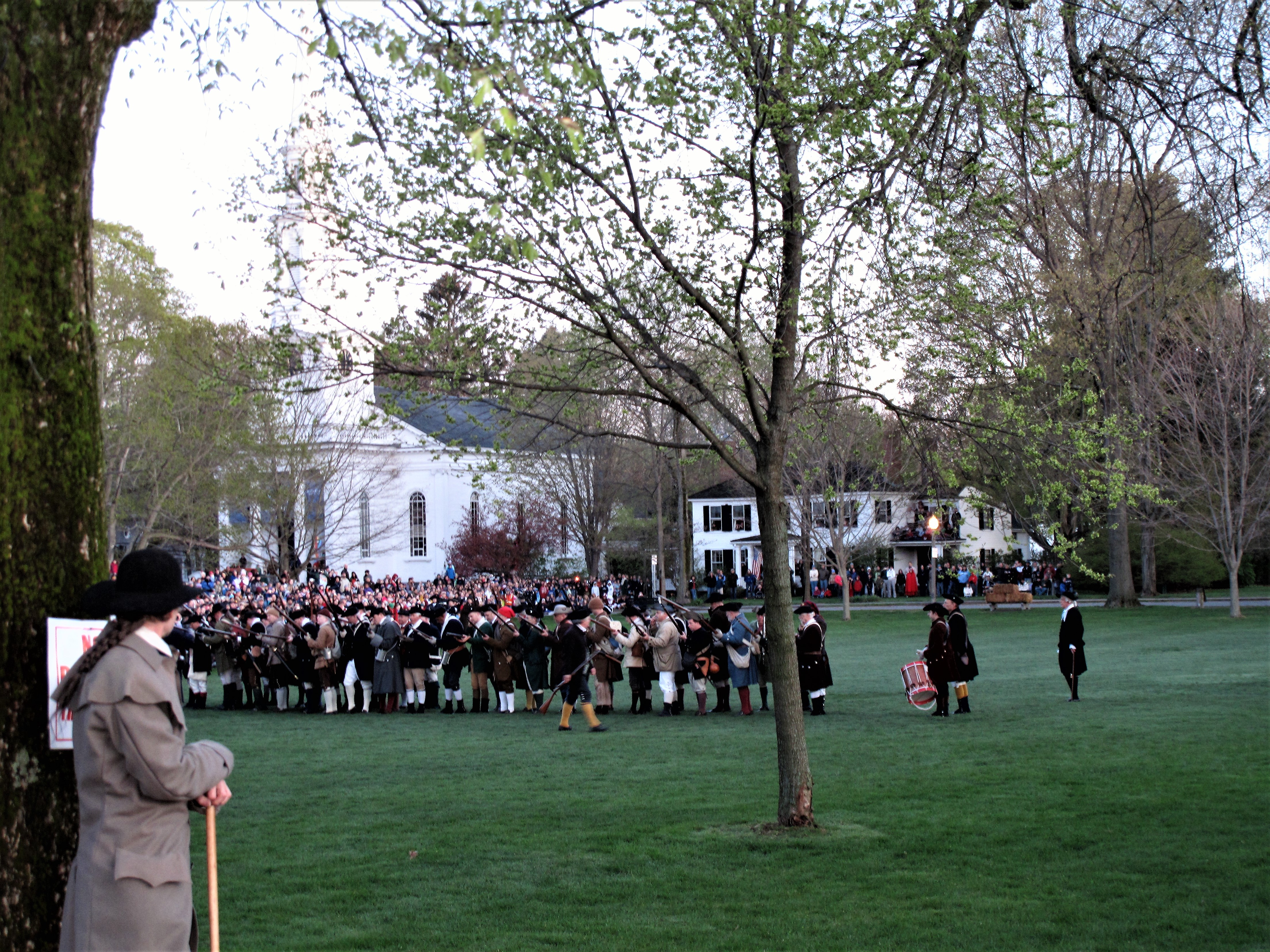 The crowds gathered before dawn on Lexington Green. About half were tourists while the other half were classes of schoolchildren, ready to watch history. Local guides dressed in period costumes explained to the crowds what is about to happen. I watched with keen interest.