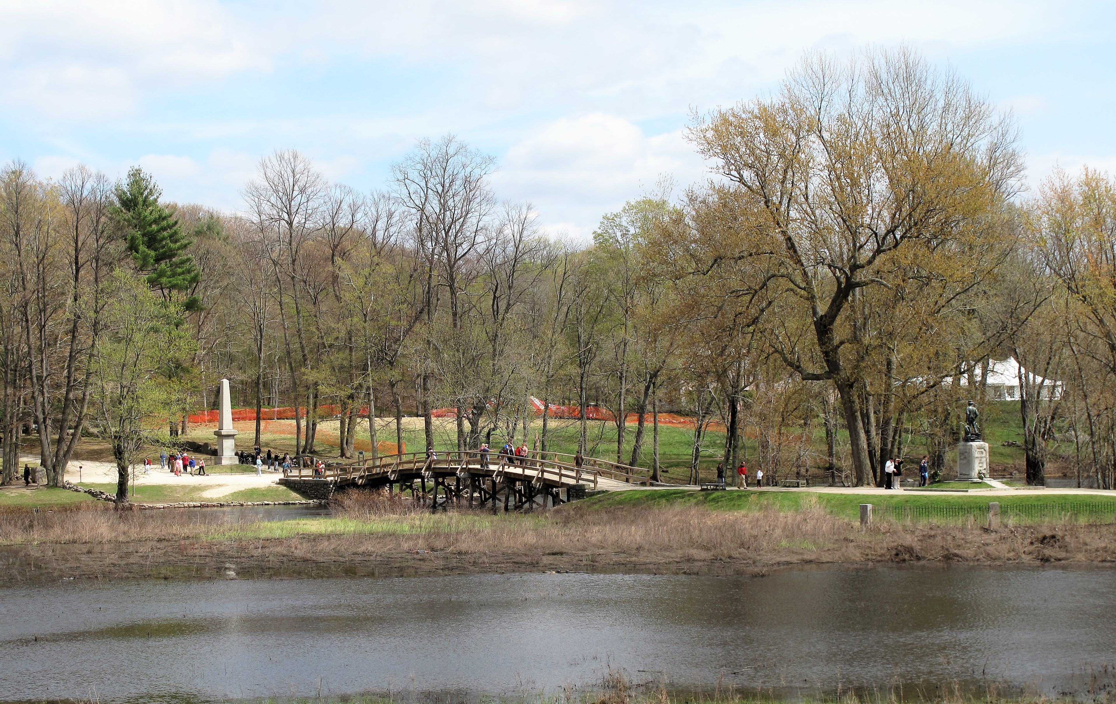 Old North Bridge, site of the Battle of Concord. Memorial obelisk is on the left; Minuteman’s statue on the right