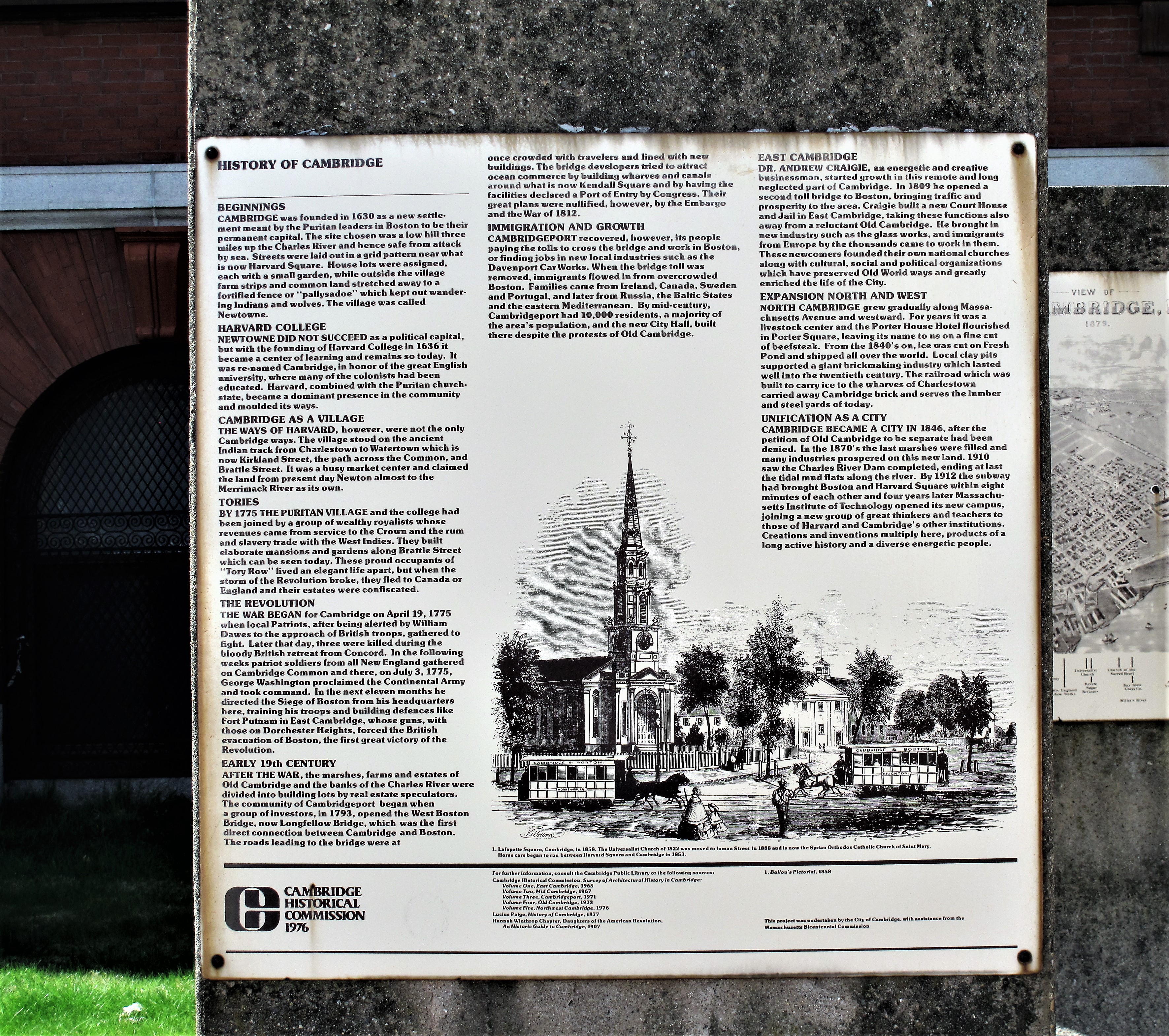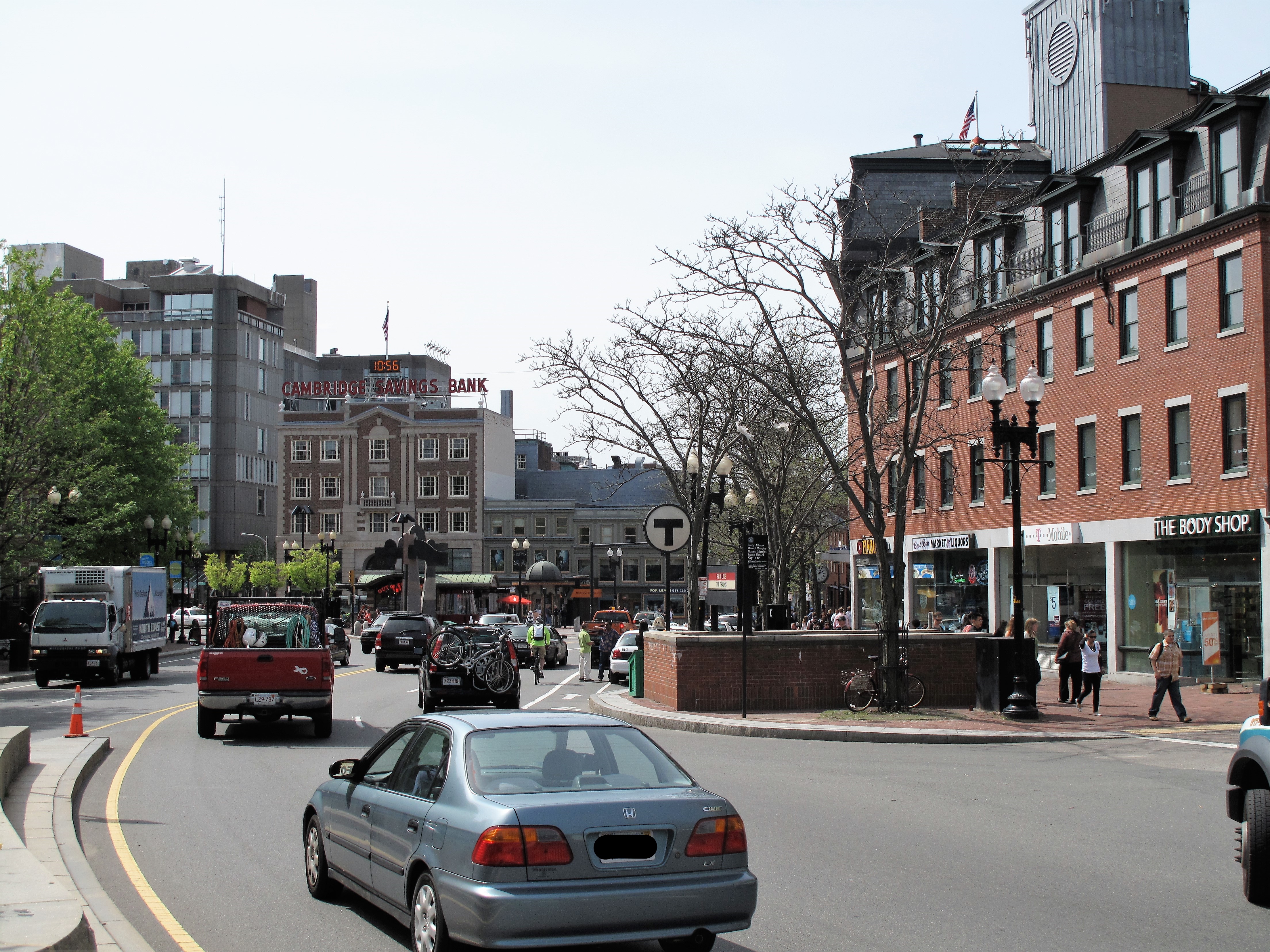 From East Cambridge, I drove down Main Street, up Massachusetts Avenue, around Harvard Square, and back down Broadway.  Cambridge is a college town but usually isn’t thought of in the same way as Lawrence, Kansas, or Athens, Georgia.  Yet I was amazed at how much Massachusetts Avenue looks like a college town’s main street.  Shops are in single-story buildings with a few large brick two-story buildings nearby.  Little restaurants and fast-food places predominate.  I saw several Middle Eastern eateries.  However, the pedestrians seemed to be not so much the college crowd as ethnic workers of all types.  So downtown Cambridge seems more of an ethnic neighborhood than a college hang-out.