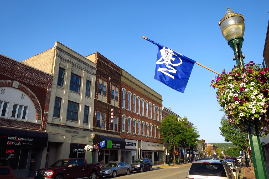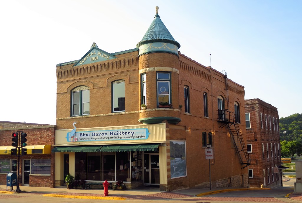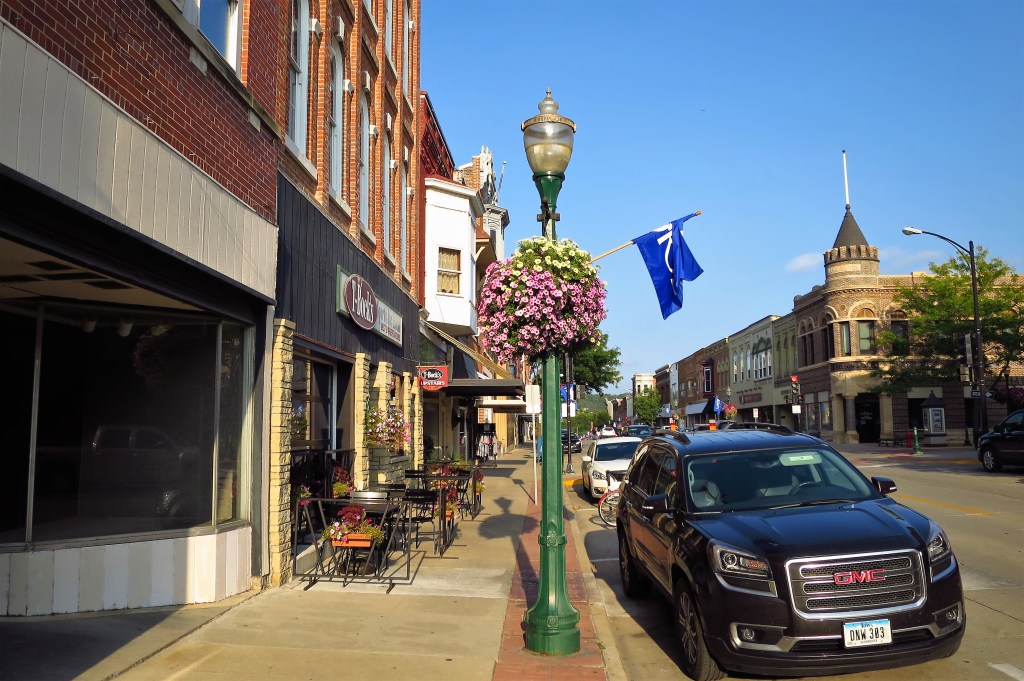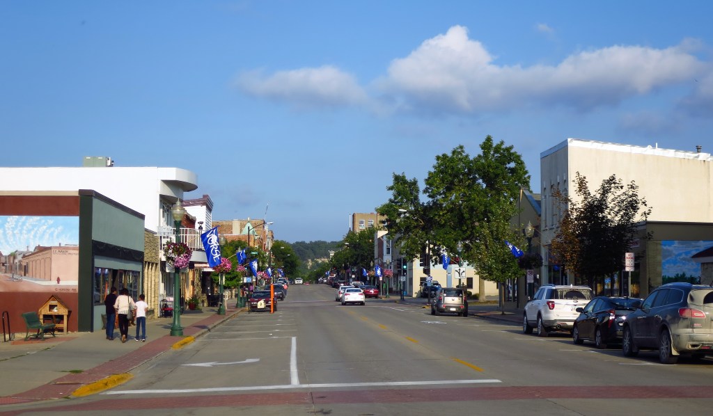 A few blocks below Broadway, Water Street is the business district in Decorah. The street is full of 19th-century architecture and reminders of the town’s Norwegian heritage. The royal blue flags lining the street say “Norse” and are probably a reference to Decorah’s Nordic Fest, held annually the last weekend of July, often drawing crowds of 50,000 or more.