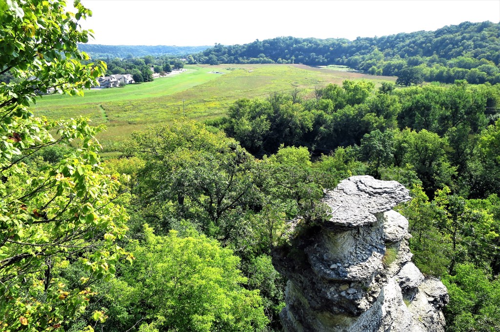 Decorah lies in the valley of the Upper Iowa River in the “driftless” region of northeastern Iowa, meaning that the landscape was never leveled by glaciers during the Ice Ages. As a result, the area landscape features old limestone cliffs and ravines forming natural caves and viewpoints. One of these is known as Pulpit Rock, which I visited the next morning and climbed for the view: