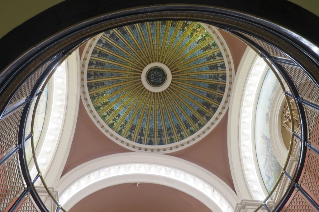Once inside I quietly wandered around the ornate hallways of the old courthouse, hoping that I could avoid any security guards chasing away occupants before closing up. The interior walls of the courthouse are lined with brown granite. Glass designs adorned the underside of the courthouse cupola; gold leaf designs accented wall decorations.