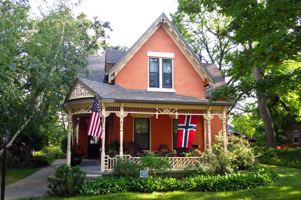 Many of these houses displayed Norwegian flags. Norwegian immigrants came to Decorah starting in the 1850s, prospering smartly.
