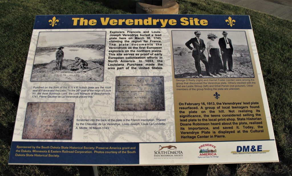 Two French explorers, Francois and Louis-Joseph Verendrye arrived here on March 30, 1743, during an expedition from French-held Quebec. Claiming the region for the King of France, the Verendrye brothers left a lead plate buried in a hill above the river to mark their claim. The Verendryes are thought to be the first Europeans to have crossed the Great Plains to see the Rocky Mountains. In 1803 the United States would purchase this claim from France as part of the Louisiana Purchase.