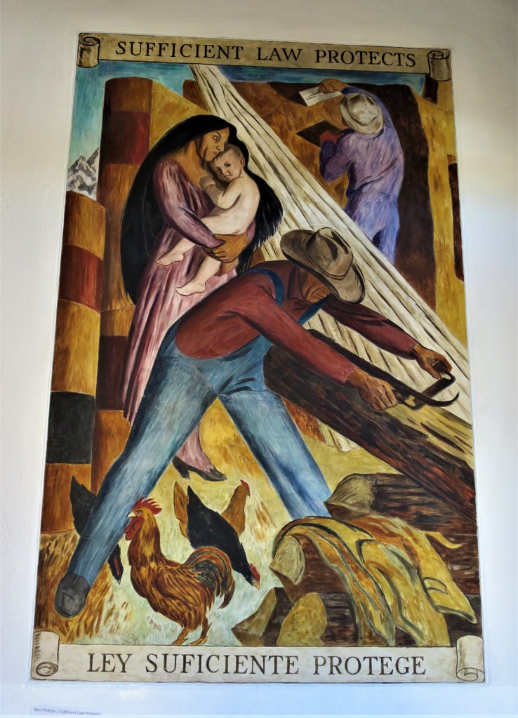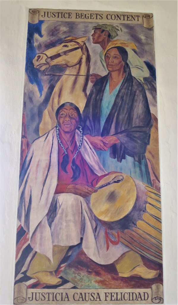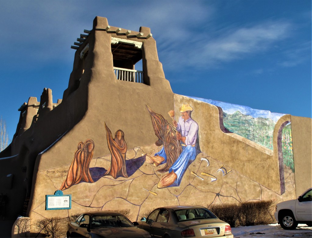 In bygone days the Taos County Courthouse was adjacent to the plaza, but a new facility was built a half-mile away in 1979. The old structure still stands and holds some fascinating wall murals. Murals include both English and Spanish titles, reflecting the many centuries of Spanish influence in Taos: