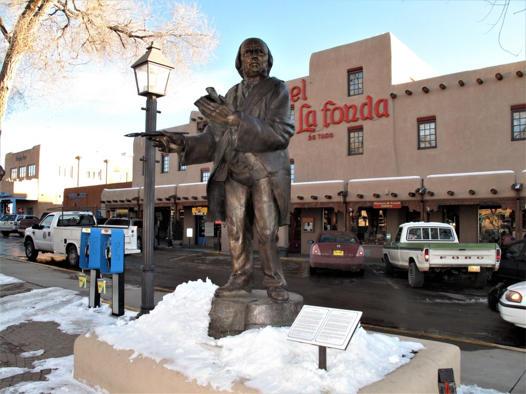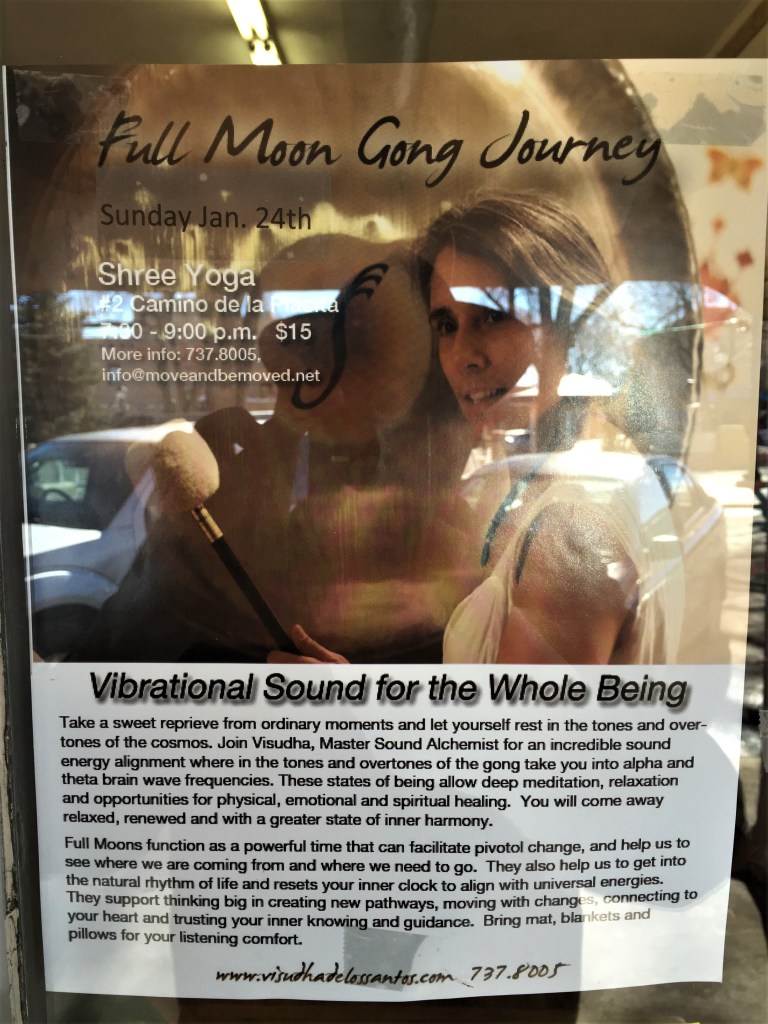 Taos Plaza is like most town squares around America, except with a Hispano flair. Here one can find shops, cafes, park benches, statues and memorials, and even a hotel. You can also find posters and advertisements for local events. One such event was advertised by the photo below: “Full Moon Gong Journey” as presented by Shree Yoga. Vibrational Sound for the Whole Being. Only $15. Yes, Taos was “New Age” long before there was anything like “wokeness.” (Sorry about the quality of the photograph. My I-phone did the best it could to remove my reflection.)