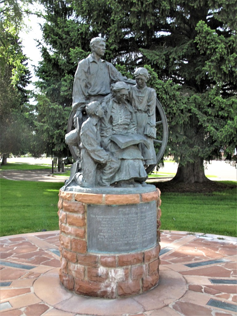 The monument’s foundation symbolizes the eternal nature of the family. The plow represents the industry of man. The wheat is the fruit of honest labor. The wheel represents progress; through effort we move forward. The father provides direction for the future with his hand on the wheel. The mother, located at the center, provides teaching and nurturing of the family. The son kneels at his mother’s knee which reminds us that the greatest lessons are taught in the home. The daughter standing with a book in her hand suggests the need for continued education.