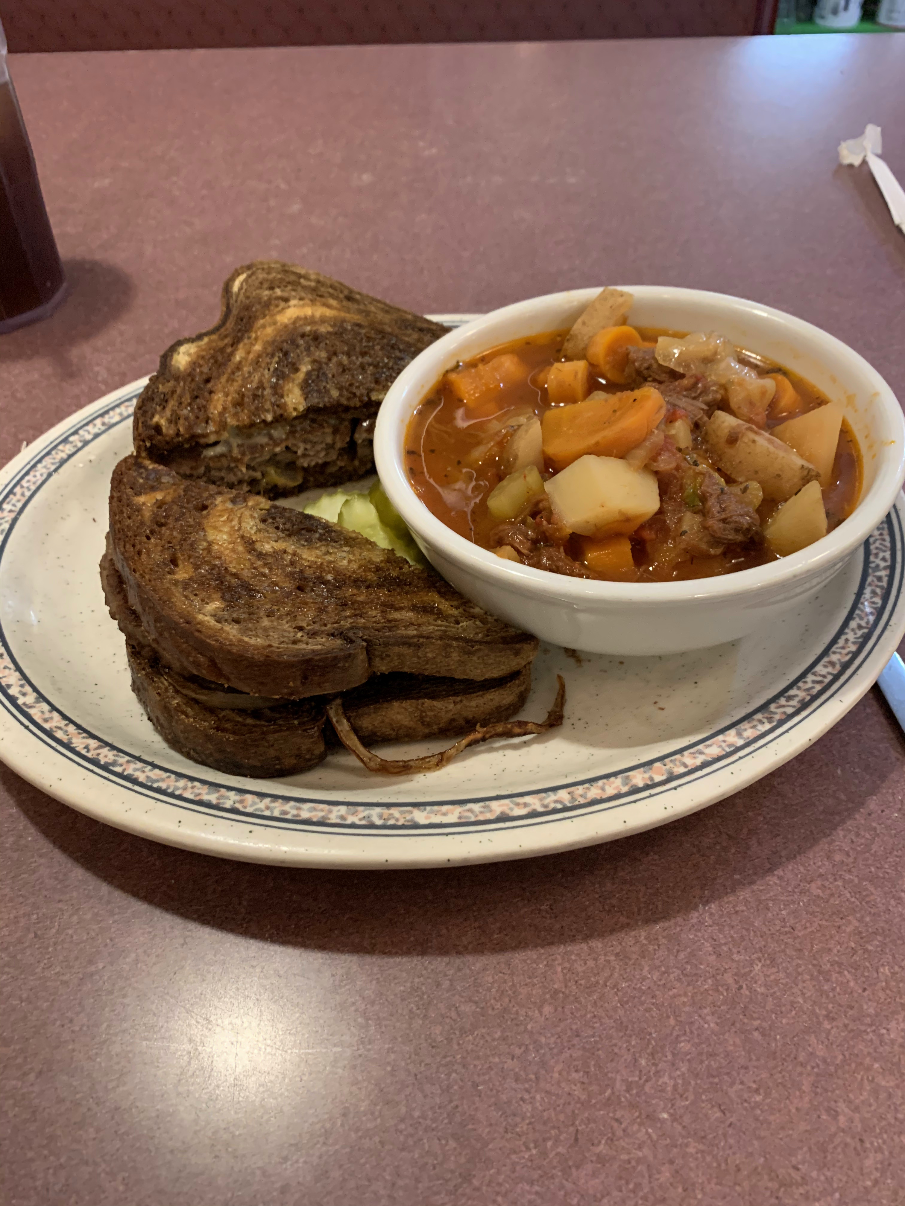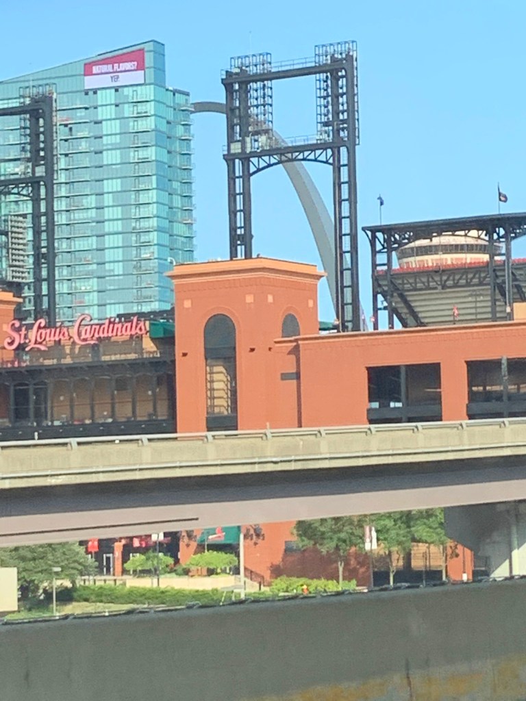 Meat-lovers omelet and raisin toast at Robin’s Nest Cafe in Clarinda. Hashbrowns are off to the side.Lunch from a gas station in eastern Missouri.Taken from the driver’s seat on Interstate 64 while passing Busch Stadium in St. Louis. The Gateway Arch is in the background and the Mississippi River Bridge is just ahead.Dinner in Paducah, Kentucky. The house chili, a baked potato, veggies, and bread.