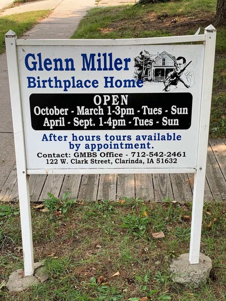 Reuben sandwich plus the best vegetable beef soup I’ve ever tasted!Autumn colors starting to show on the tall shade trees in Clarinda.Glenn Miller’s birthplace and boyhood home. Clarinda, IowaGlenn Miller home hours of operation.A steak and potato dinner at J. Bruner’s in Clarinda, Iowa