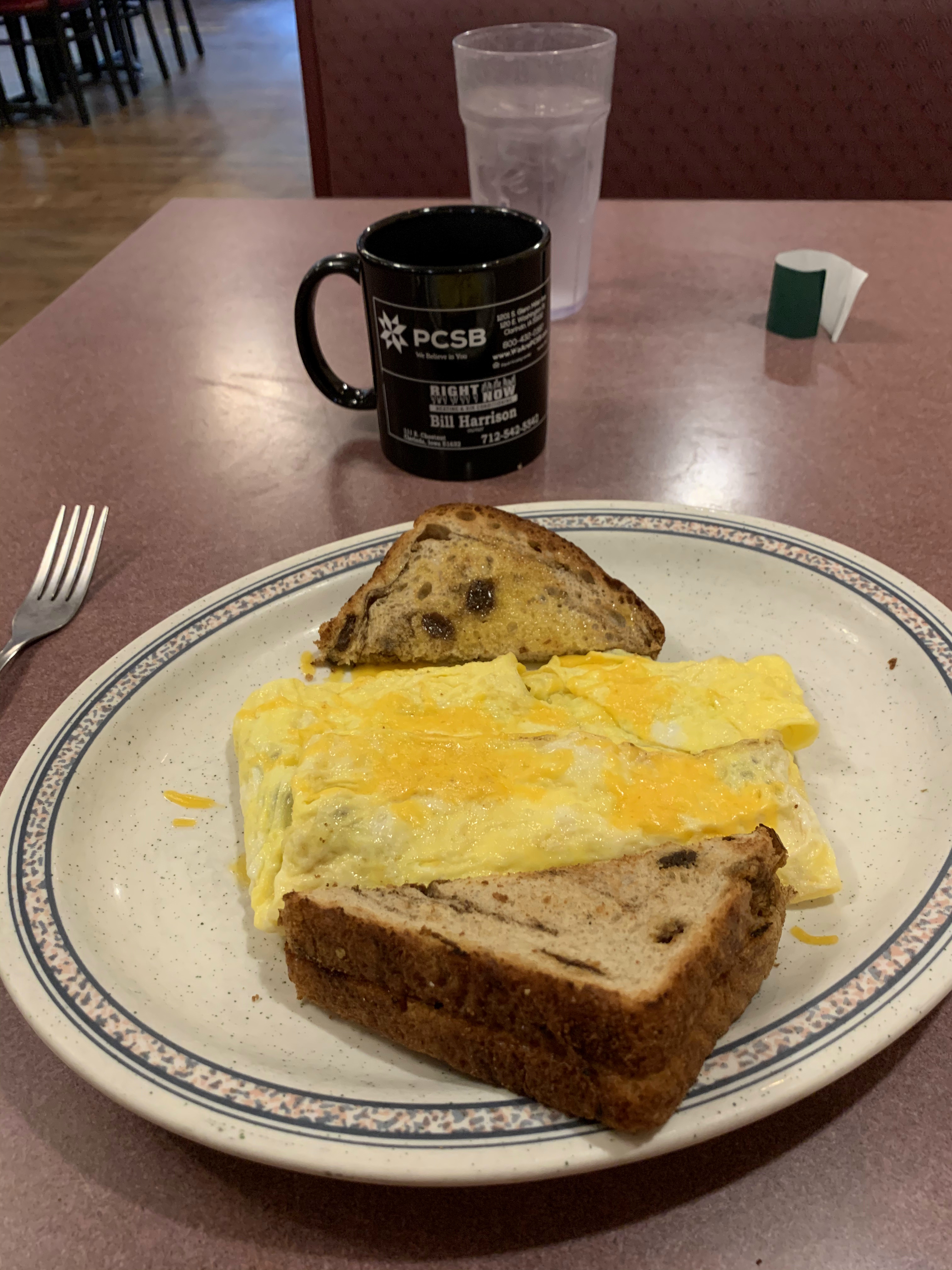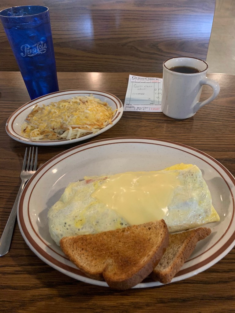 That’s a 3-egg omelet with bacon, sausage, ham, onion, peppers, tomatoes, and swiss cheese with a plate of cheesy hash browns on the side. No one needs to consult a Michelin guidebook to eat well.