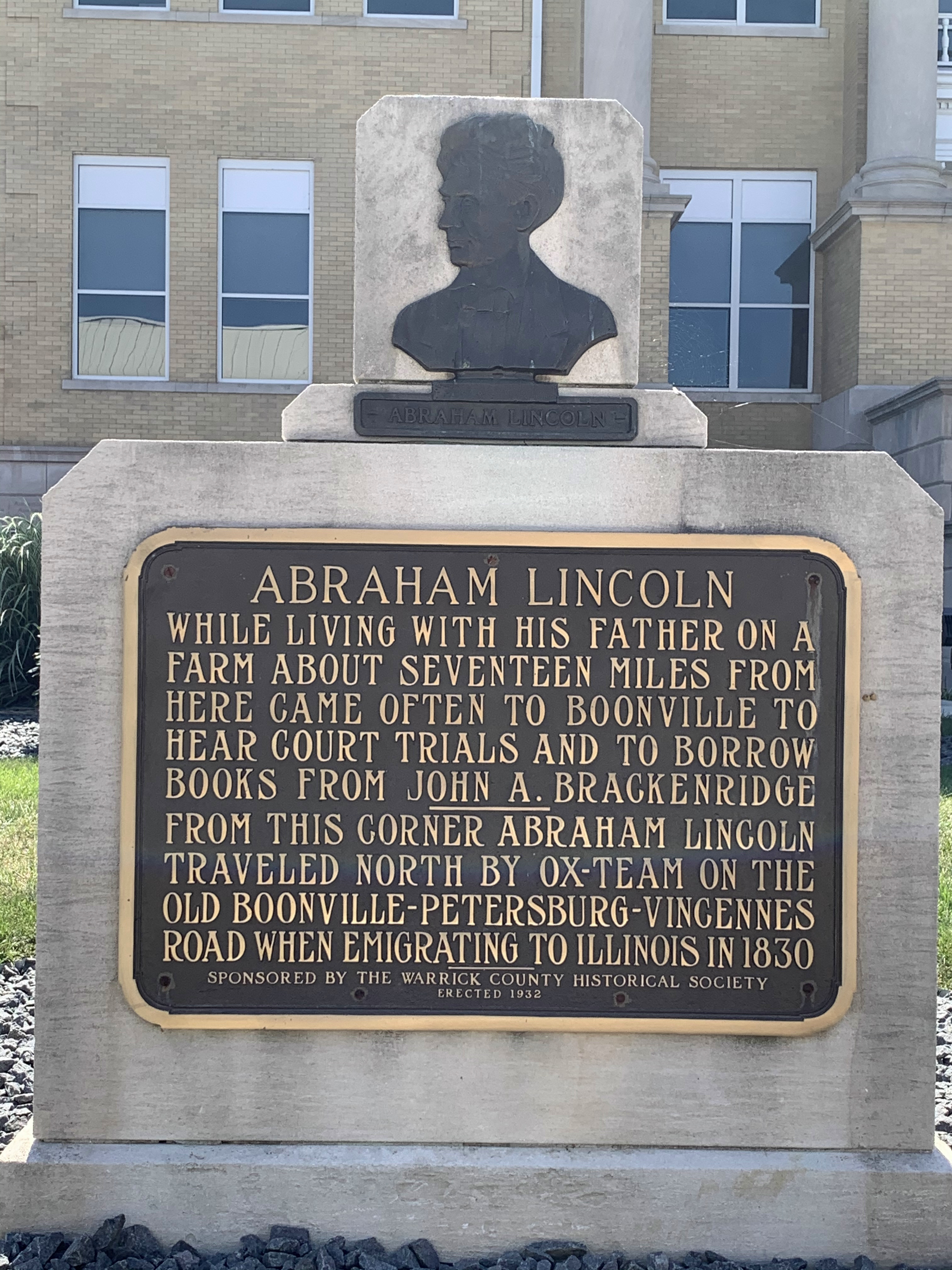 The Lincoln Boyhood Home National Memorial is 20 miles east of Boonville in Spencer County, Indiana. Lincoln spent his childhood years on his father’s farm here before going off to Illinois as a young man to be on his own.