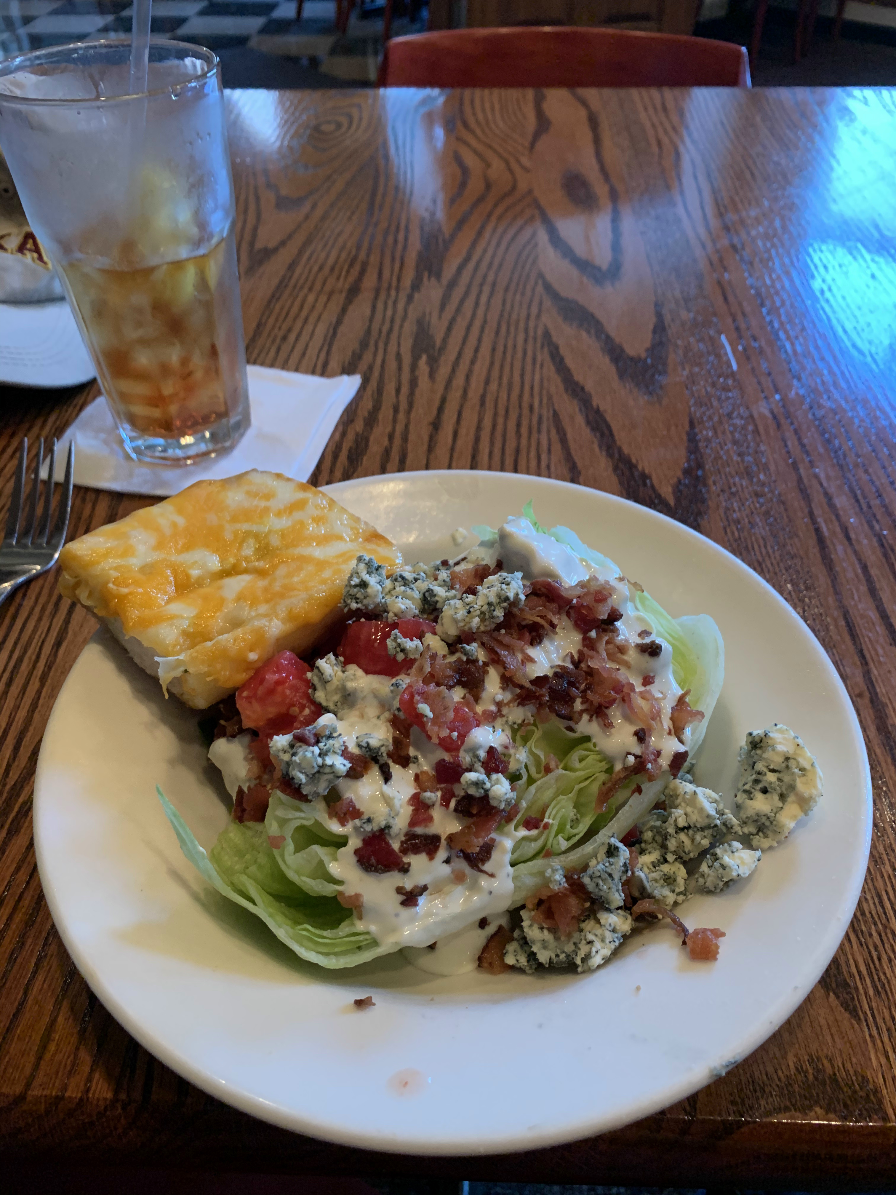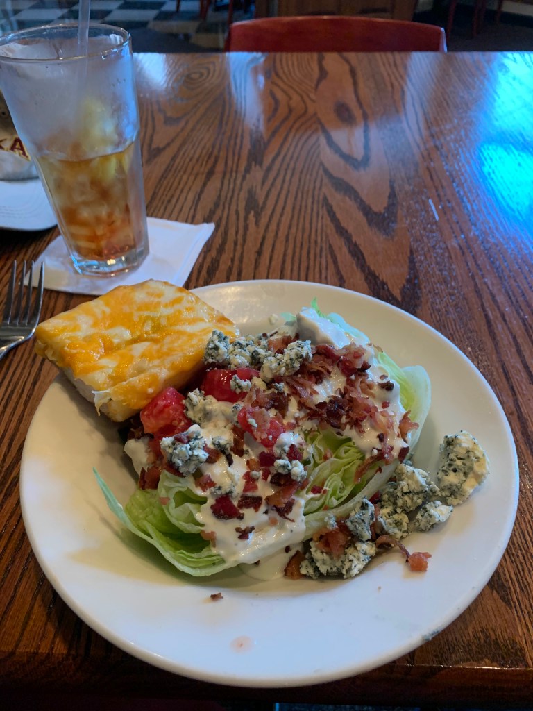 Wedge salad for startersPecan pie topped with ice cream then whipped cream and then chocolate sauce for dessert.