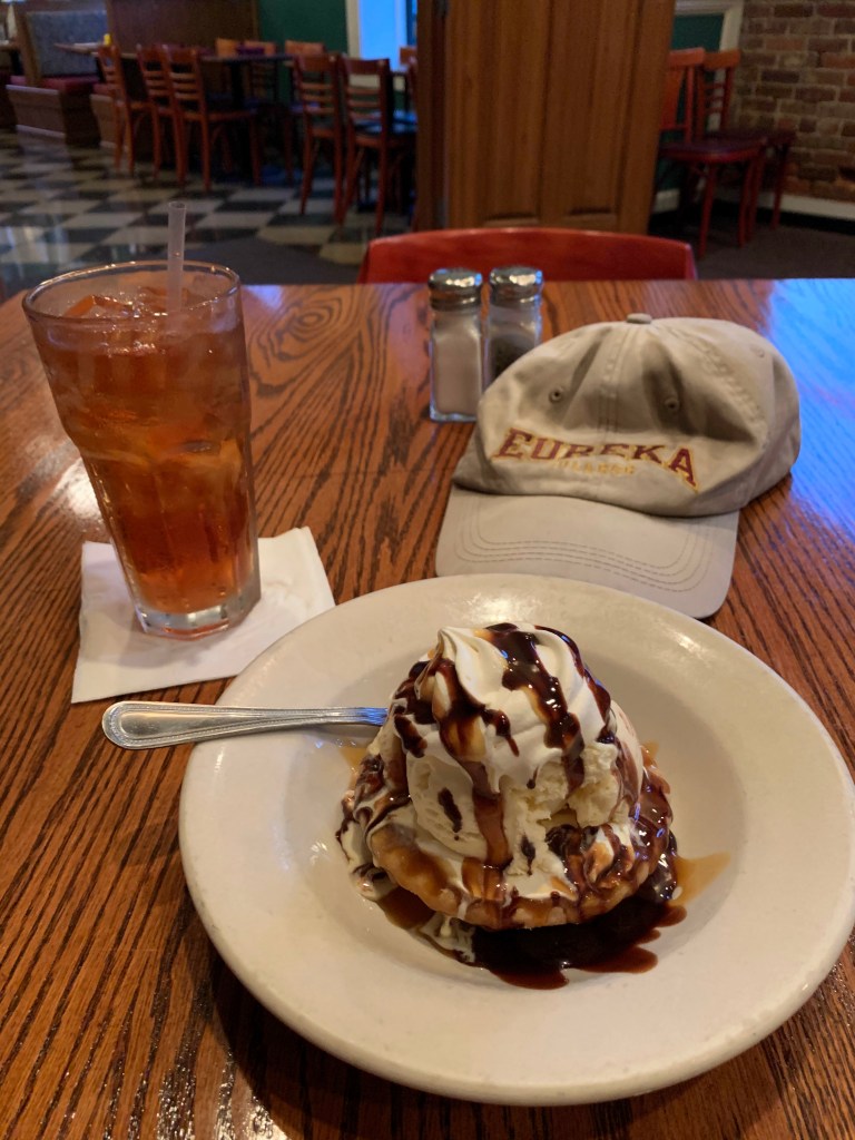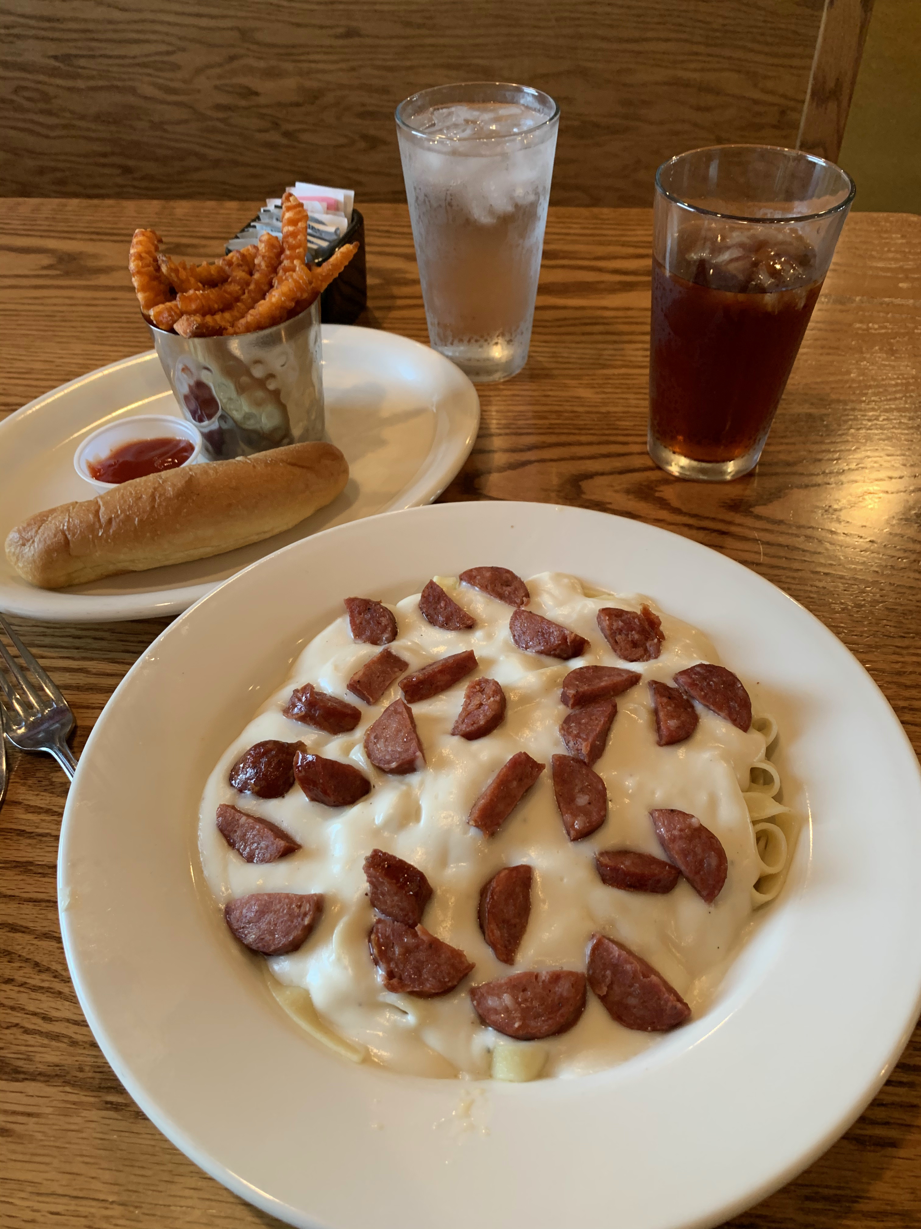 I got into Seneca an hour or so later. Dinner tonight is at the Willows Restaurant and Bar. I have their fettuccine alfredo — with andouille sausage instead of chicken — and a side of sweet potato fries and tea.