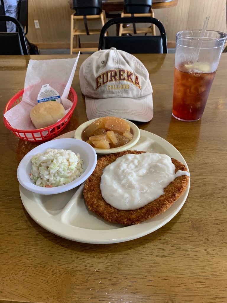 The lunch special of chicken fried steak, gravy, coleslaw, and sliced apples