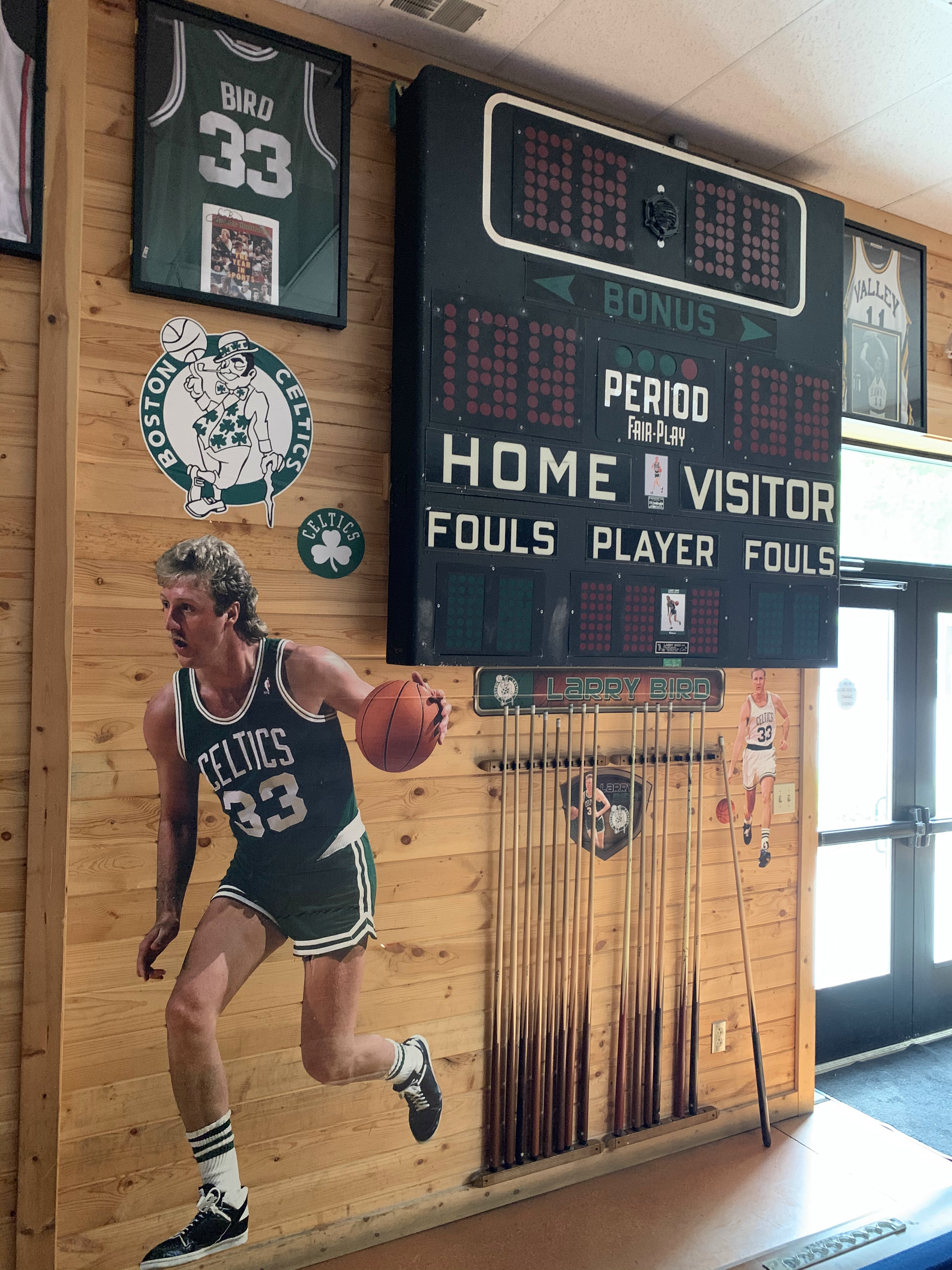Larry Bird poster in the pool room inside Legendz Sports Bar & Grill in French Lick, Indiana