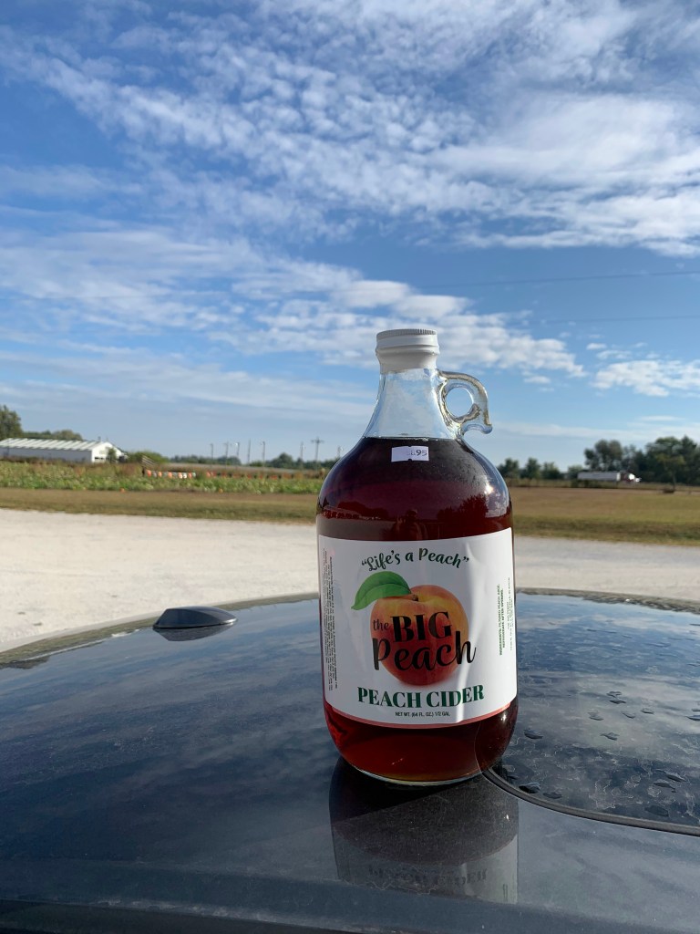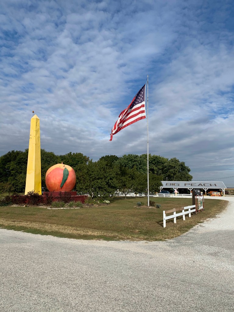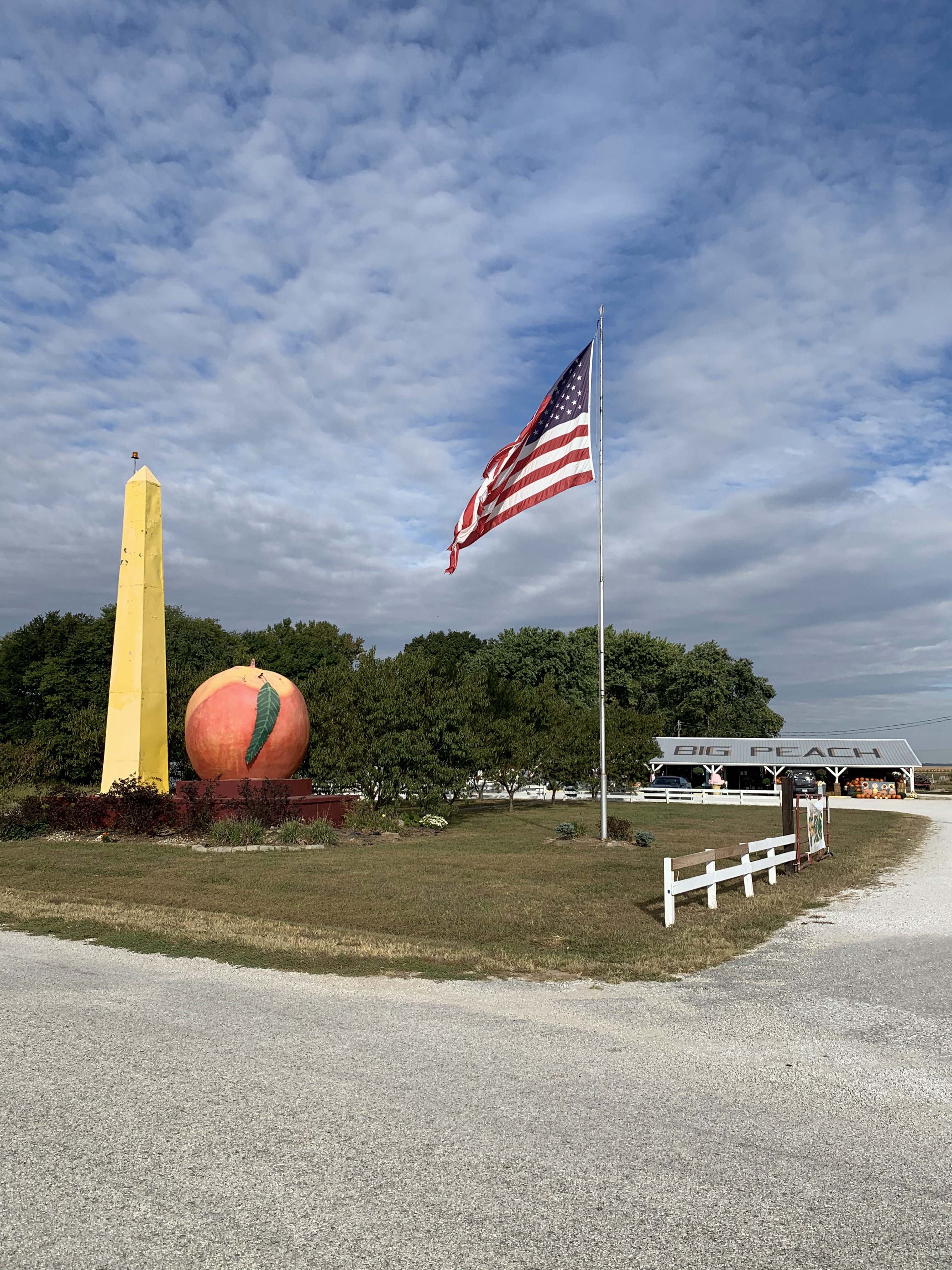It’s a bright sunny morning and I’m off early, driving north through the farms and fields of western Indiana. I was making good time until I saw a roadside establishment called “The Big Peach,” and couldn’t help but stop for some “supplies.”