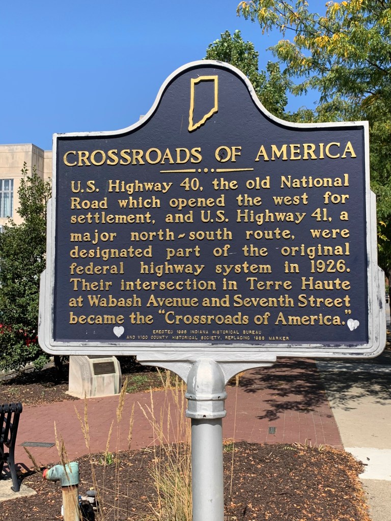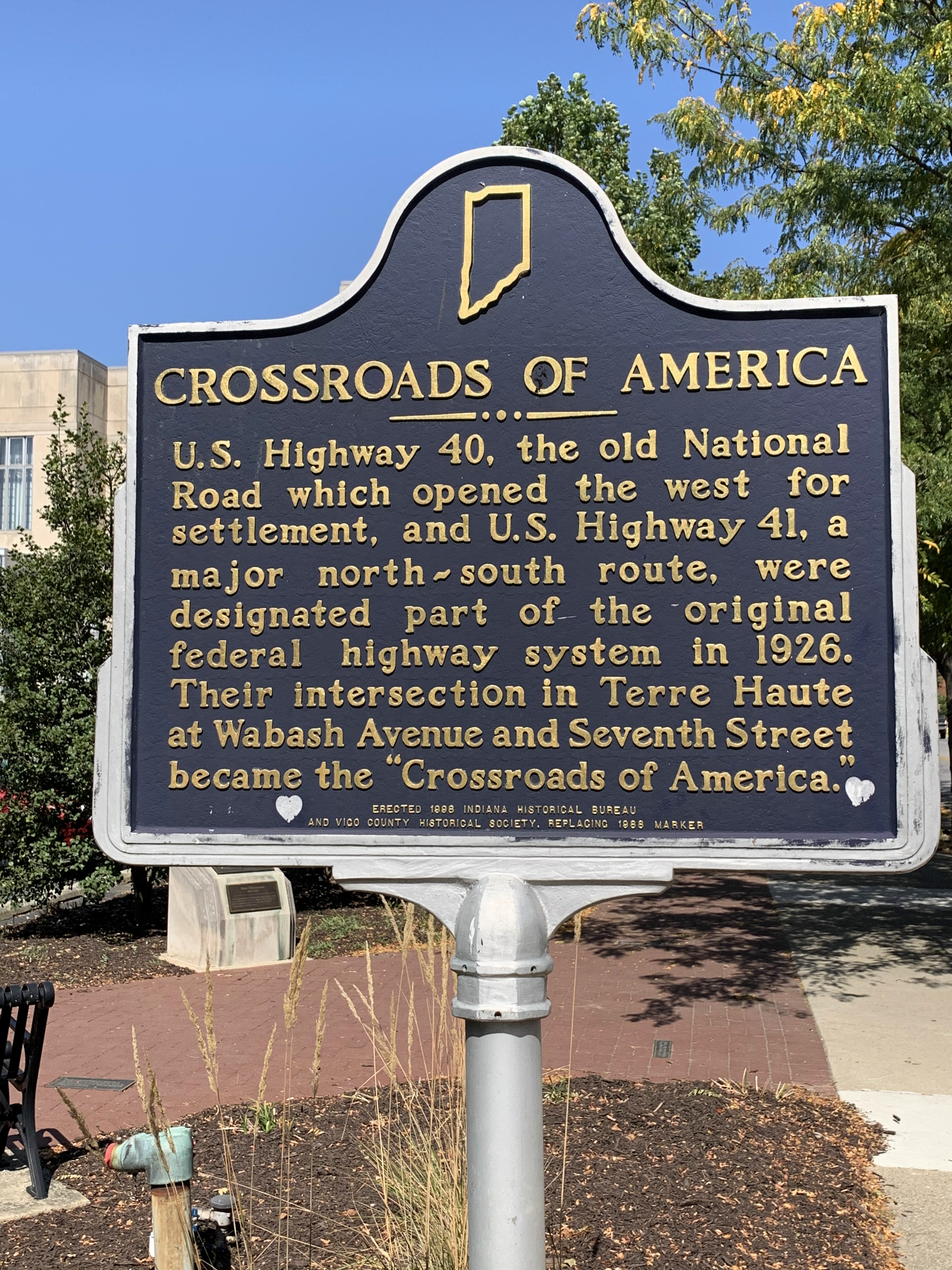 Terre Haute is sometimes referred to as the “Crossroads of America” since the intersection of 7th Street and Wabash Avenue was also the intersection of U.S. Routes 40 and 41 — both are cross-country routes. The roadsign will explain the details: