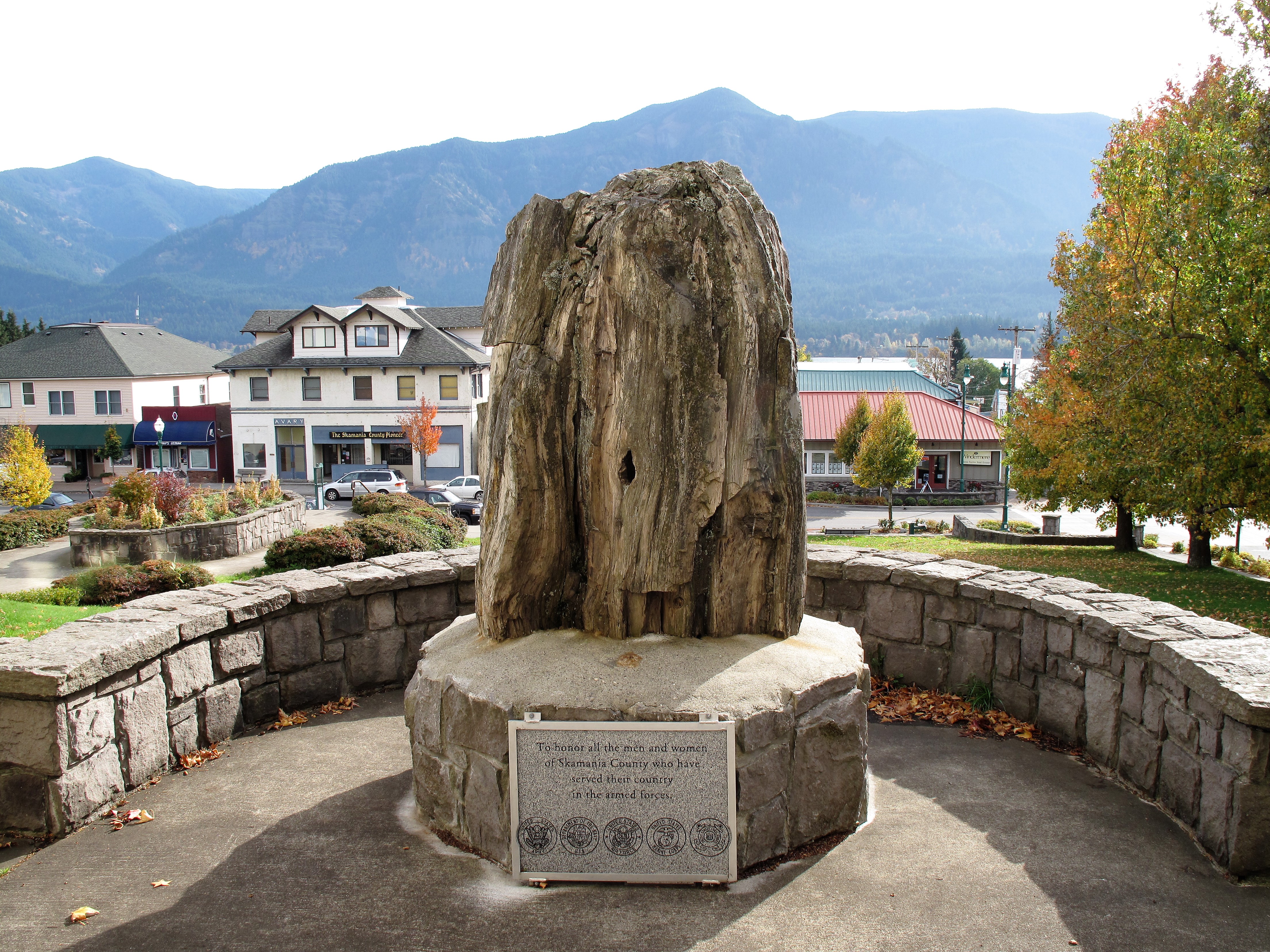A large tree stump from Skamania County’s logging days serves as the county veterans’ memorial. The best view of the Columbia River Gorge has been reserved for the veterans’ memory.