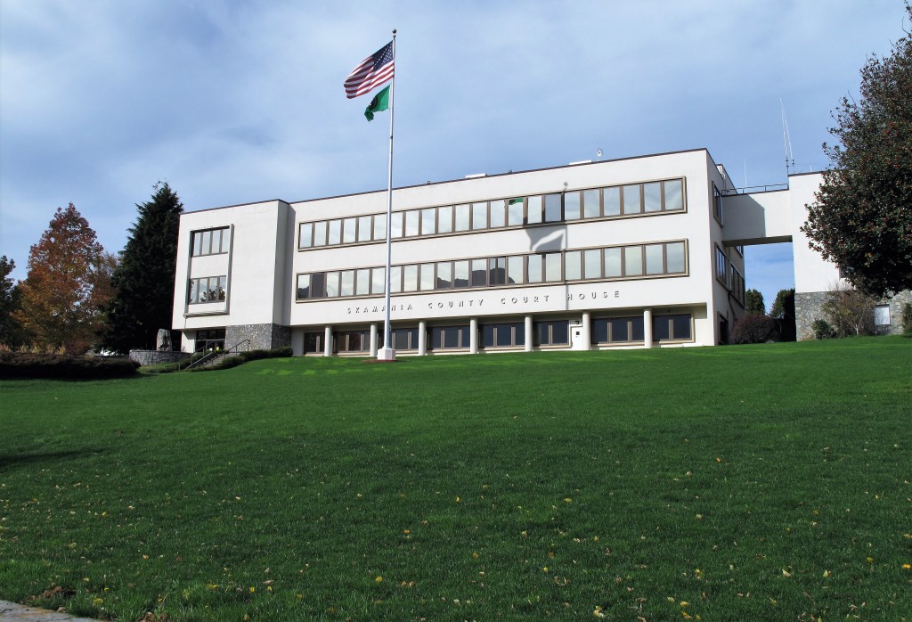 The Skamania County Courthouse is a 1970s-style building three stories tall with a wide front lawn sloping down toward the Lewis and Clark Highway below. The bright green of the Washington state flag reflects off the courthouse’s front glass windows. Views from the building could be sold as real estate; they look up and down the Columbia River and include the steep green cliffs of the Columbia River Gorge on the Oregon side.