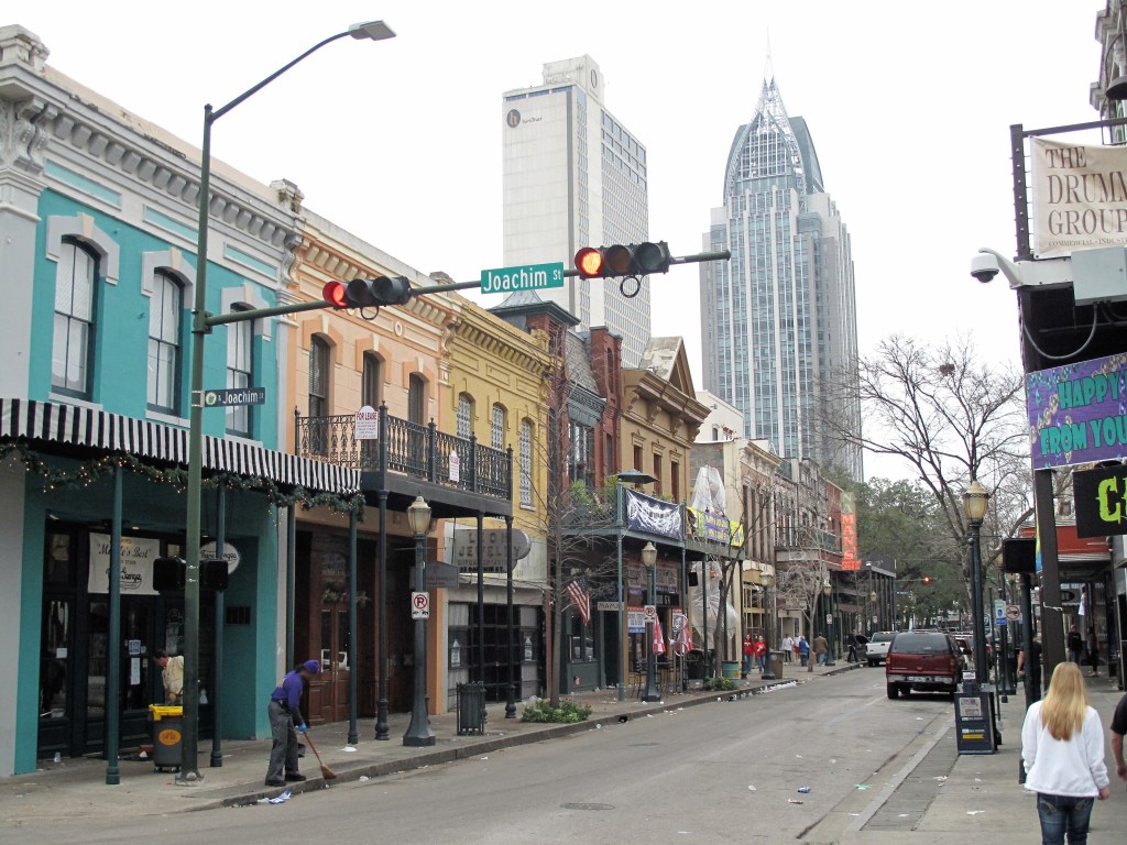 Dauphine Street is Mobile’s Bourbon Street, lined with bars and second-story patios for looking down on the party below.  It’s still morning but the street is busy with drinkers. Rain is expected today; sorry for the gray-sky photos but it couldn’t be helped.