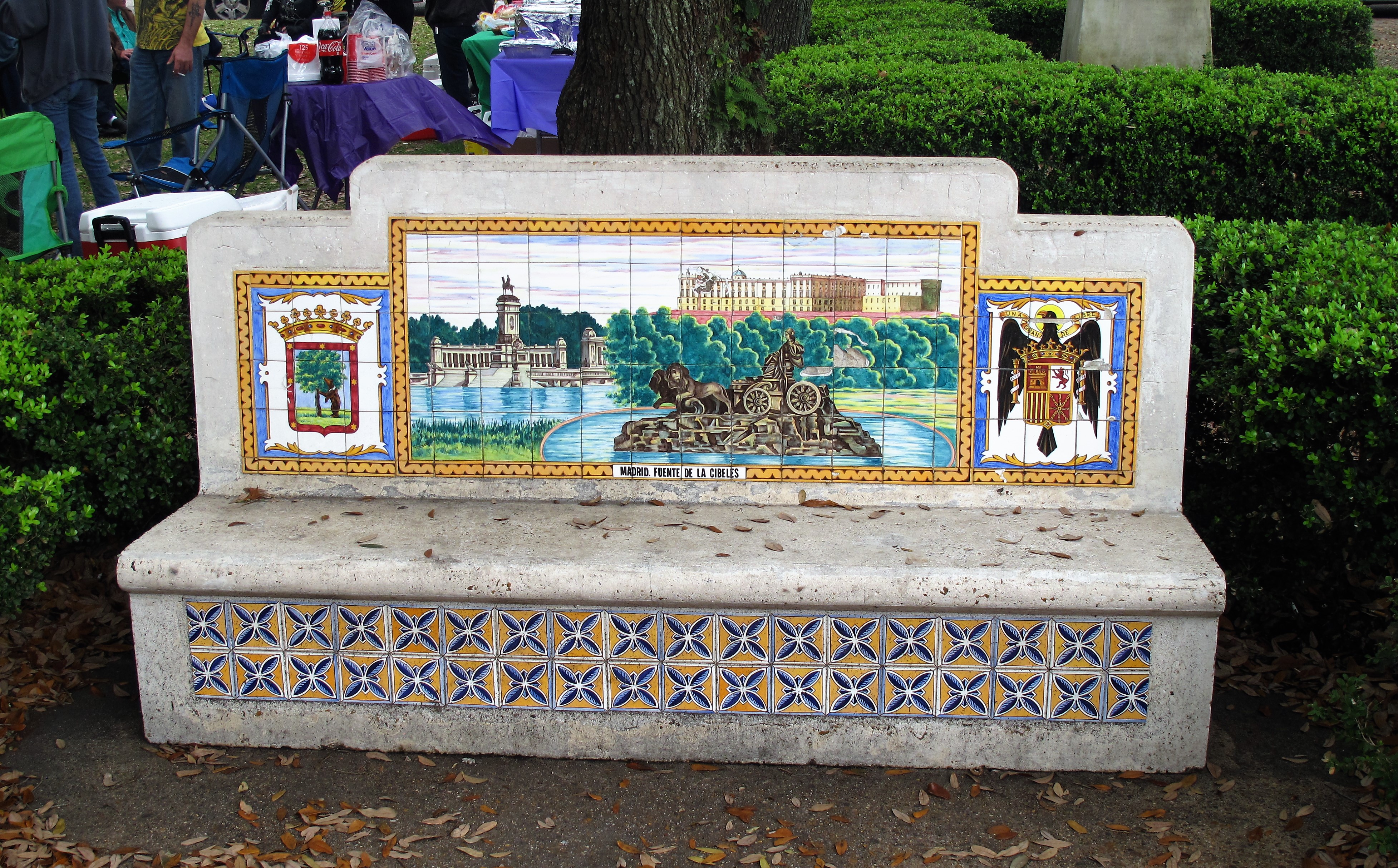 The Spanish controlled Mobile after the French. They’re remembered in Spanish Plaza, a few blocks from Bienville Square. These beautiful porcelain park benches must have been gifts from the Spanish cities named on the benches.