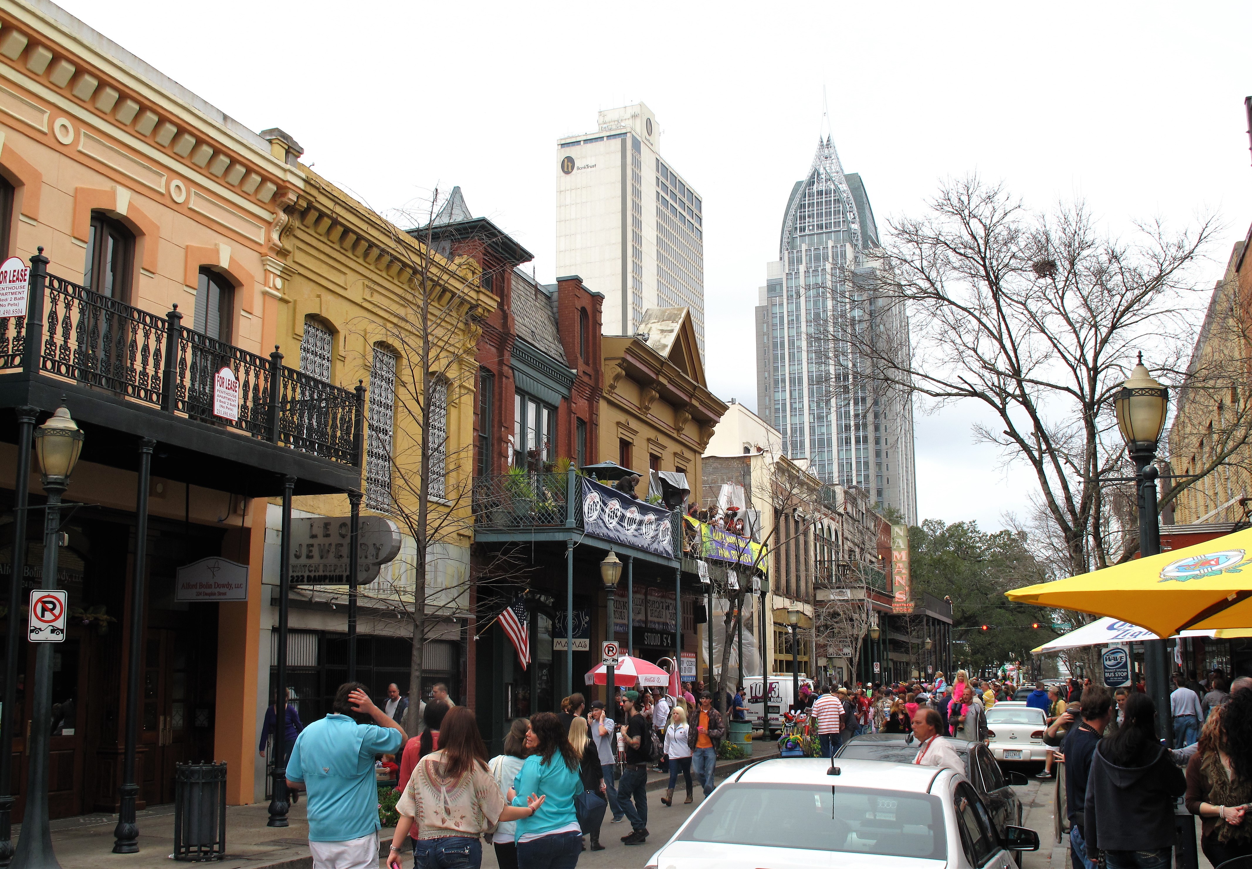 Dauphine Street with the Mobile skyline in the backdrop. Waiting for the Joe Cain Day parade to start.