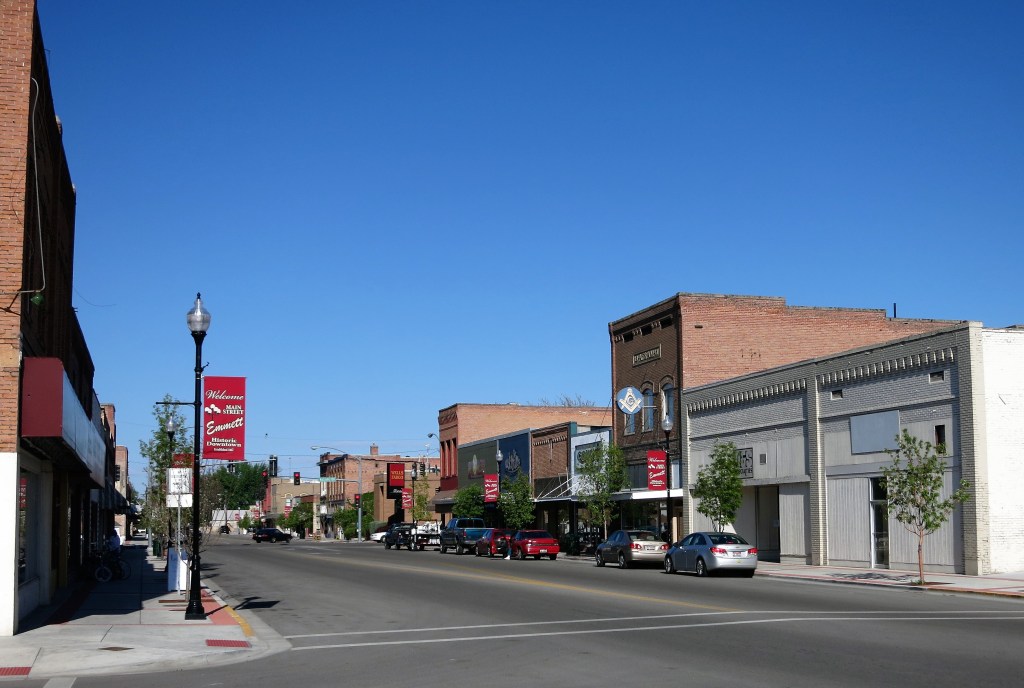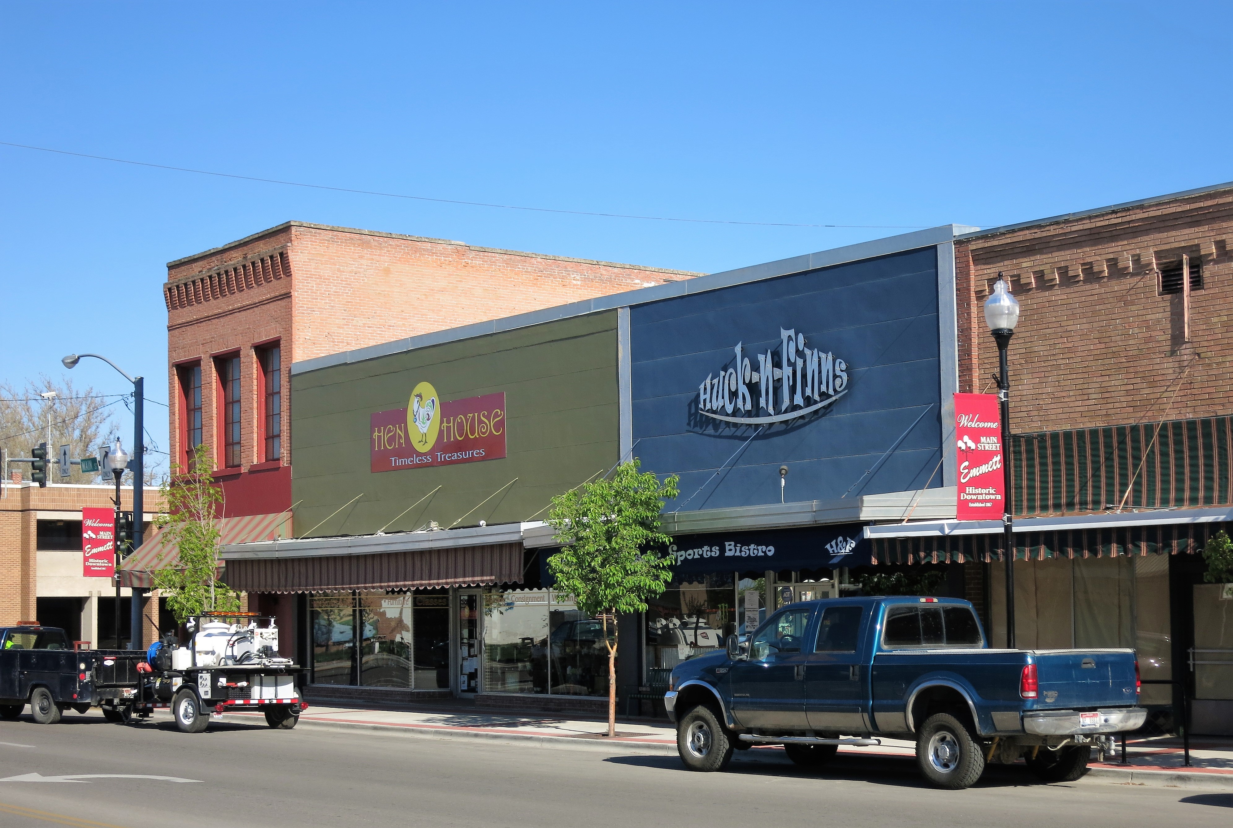 Down in the valley below, the little town of Emmett (population 6,500; Wikipedia entry here) provides both basic services and a small-town home. The Hen House Home & Gift can be found on Yelp here.