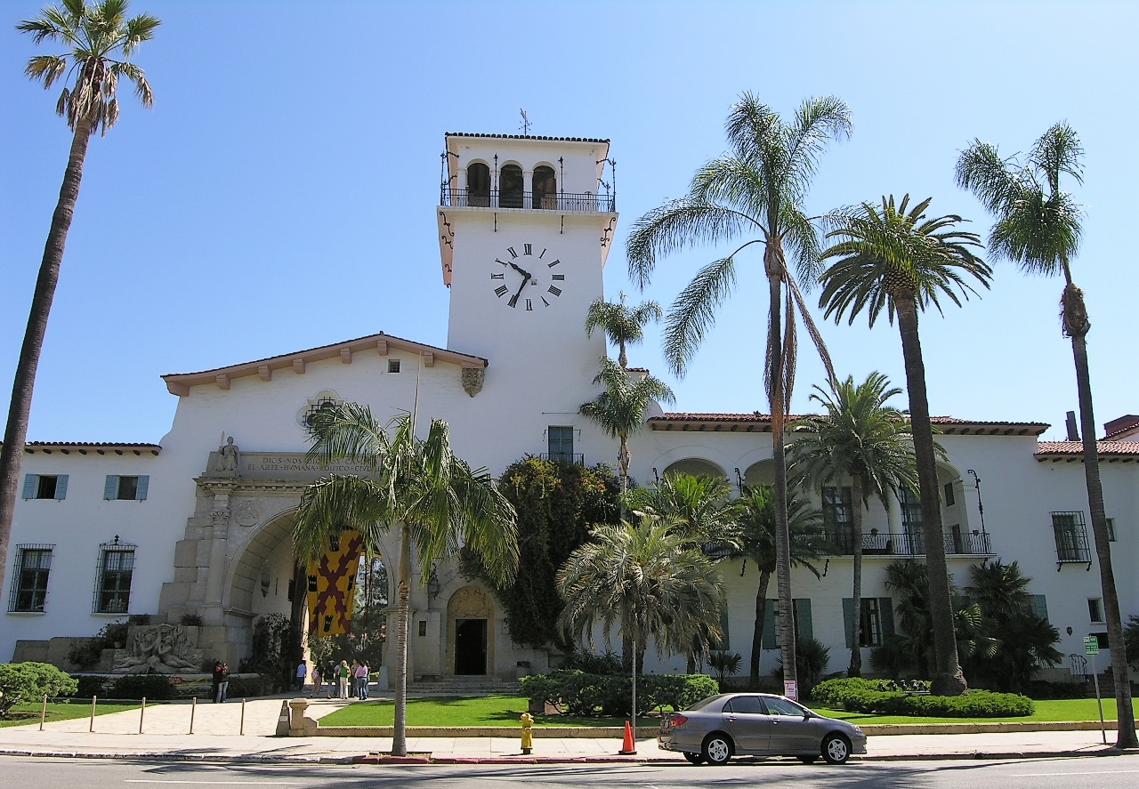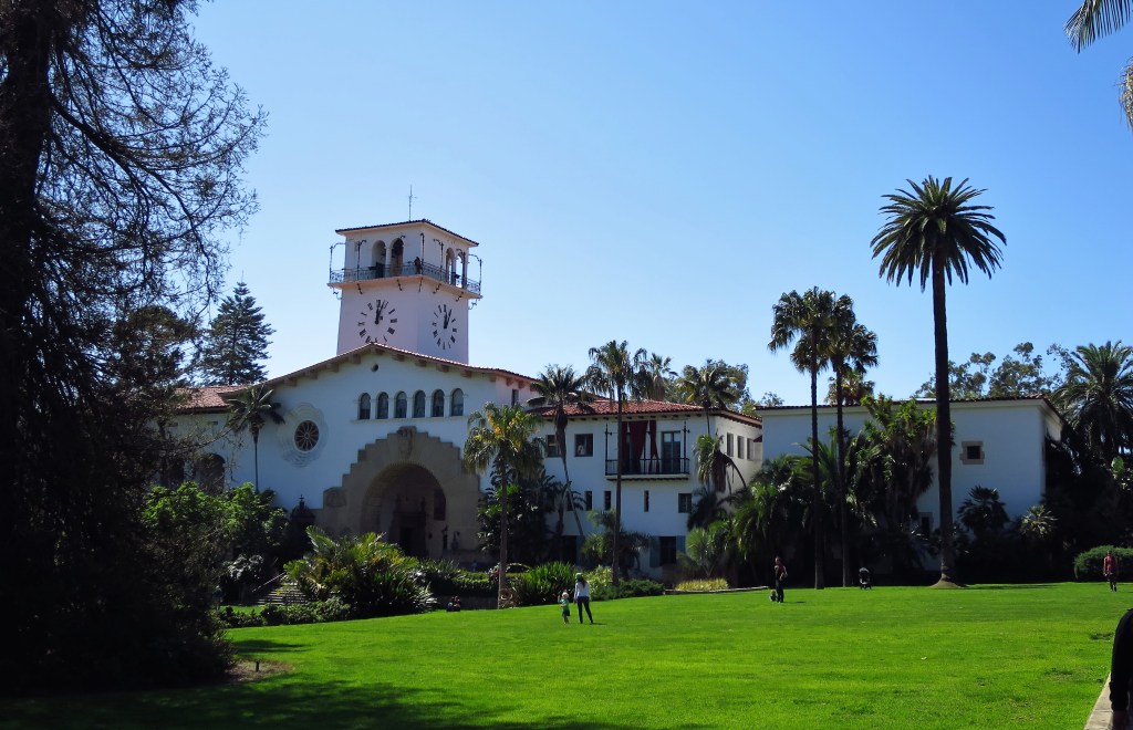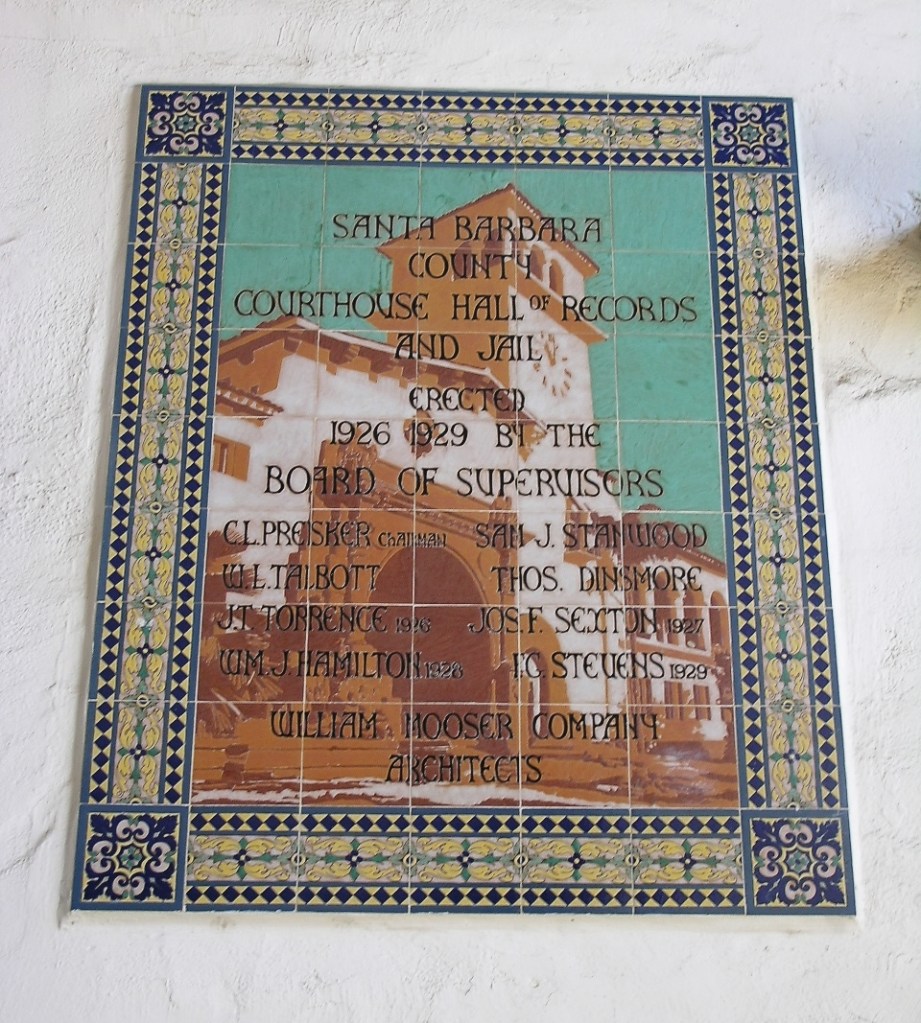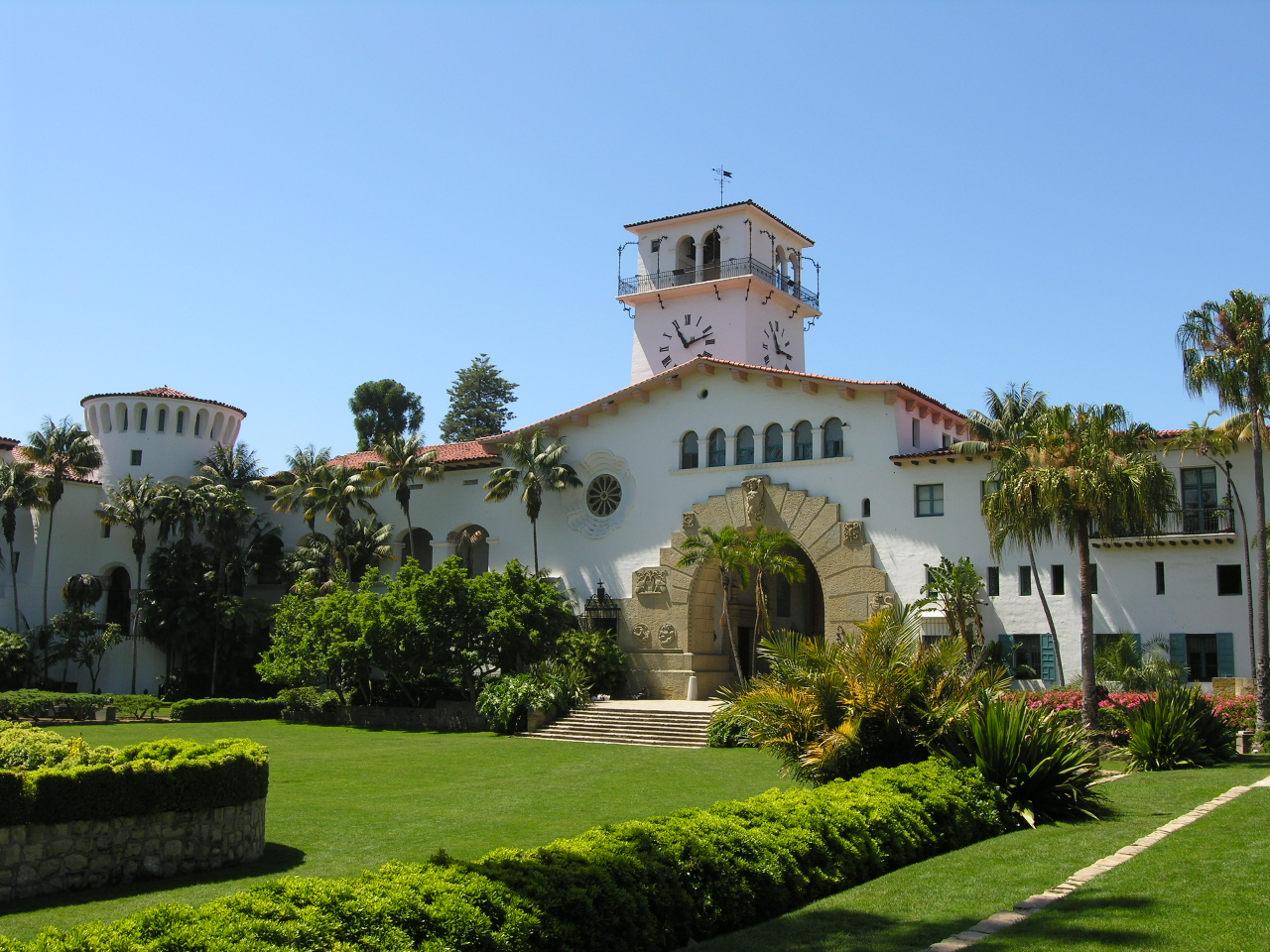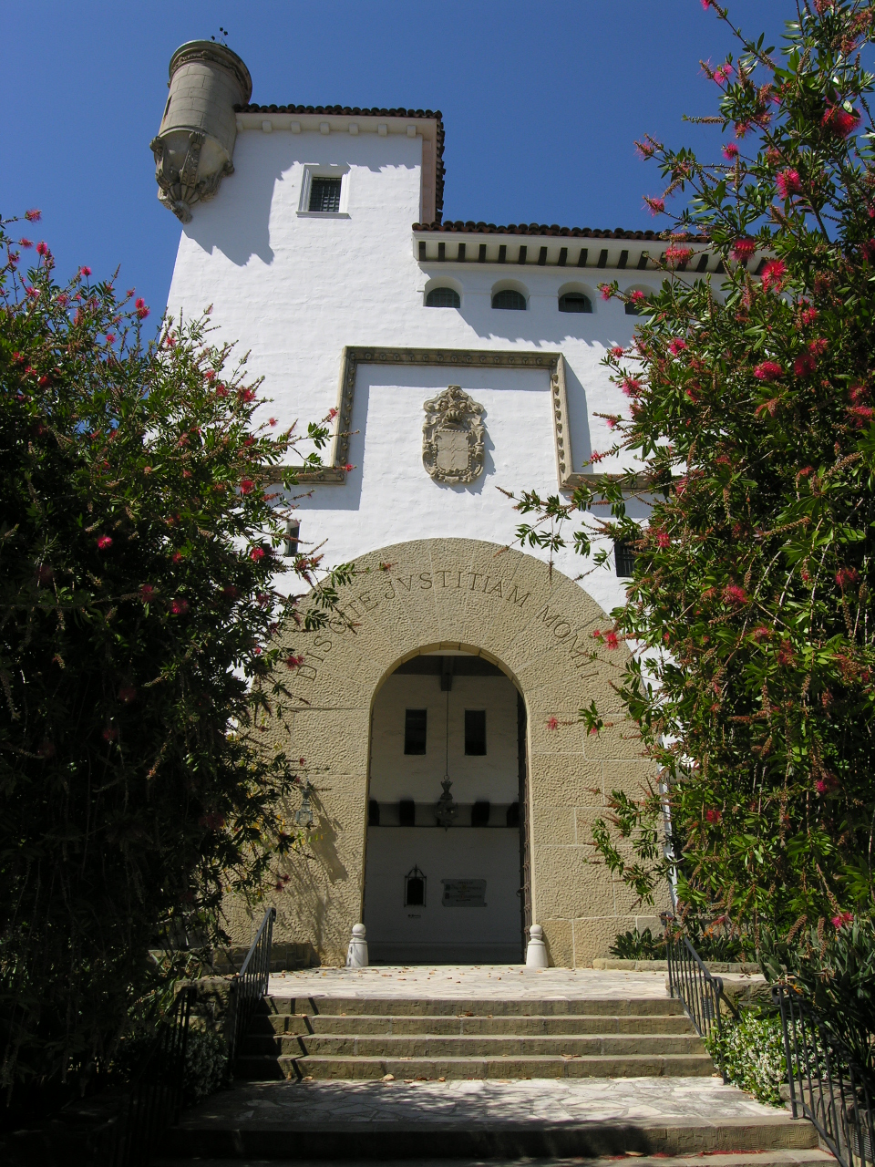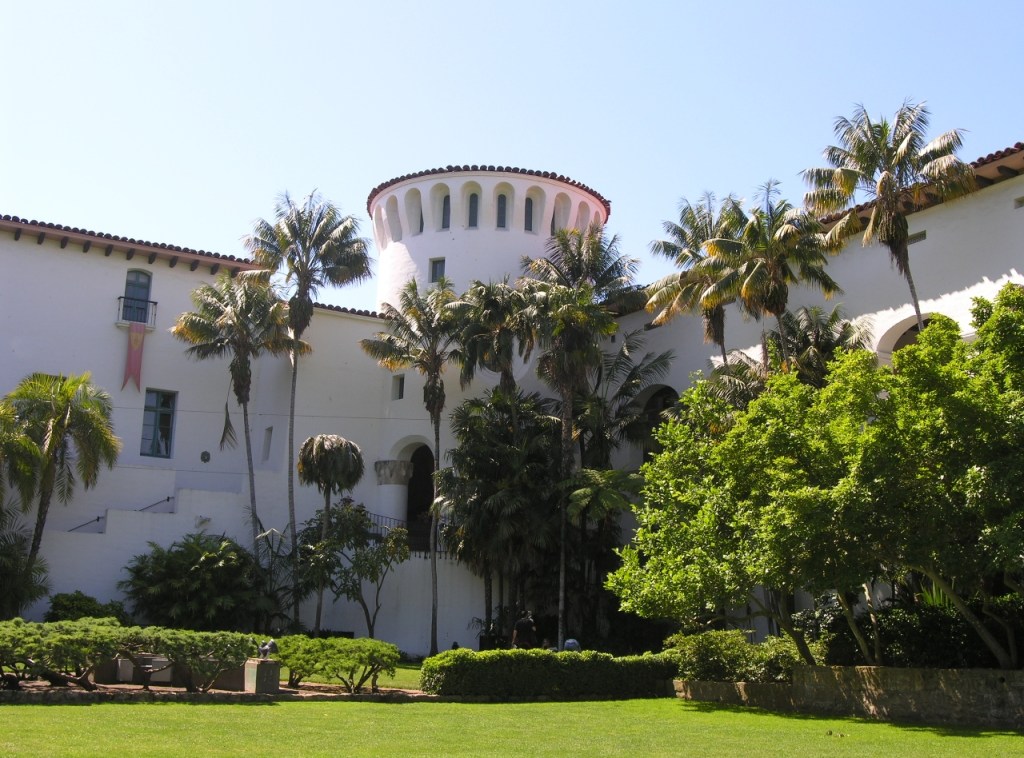 A few blocks below the Mission, on Anacapa Street, stands the magnificent Santa Barbara County courthouse. Constructed in 1925 to replace a building damaged by earthquakes, this courthouse is a classic of design and style.  Well-known and often photographed, it was designed in the mode of a Spanish castle and includes a prominent corner tower and turrets, red tile roofing, a courtyard, and open patios and porches for natural cooling.