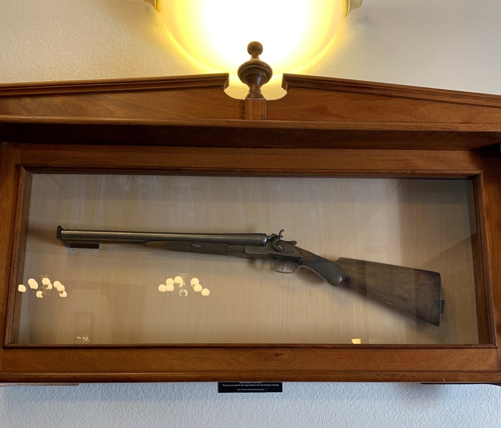 This shotgun is on display in the courtroom. Stagecoach drivers used this weapon to guard the stage line between Eureka and Ely, Nevada. Good at close range. The genesis of the term “riding shotgun.”