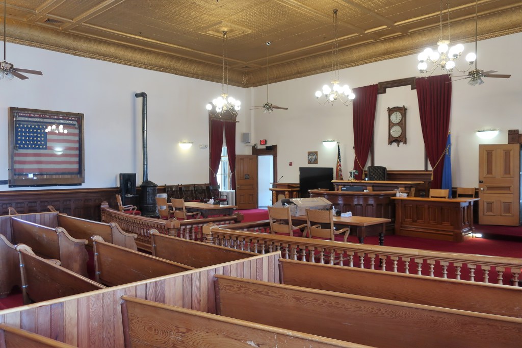 This is the District Courtroom in the Eureka County courthouse. Beneath chandeliers and a metal-plated ceiling, an old wood stove stands on one side of the courtroom while a flat-screen TV stands on the other. Built in 1879 and is still in use today.