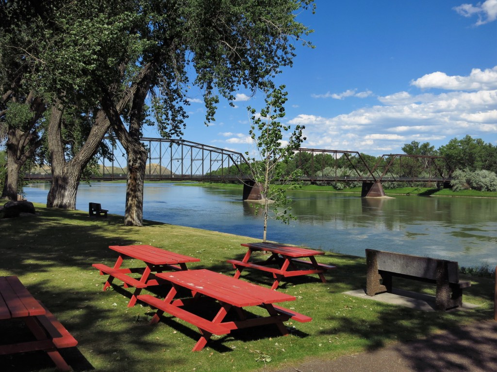 Picnic tables along the banks of the Missouri River, near the Grand Union Hotel. Fort Benton, Montana.