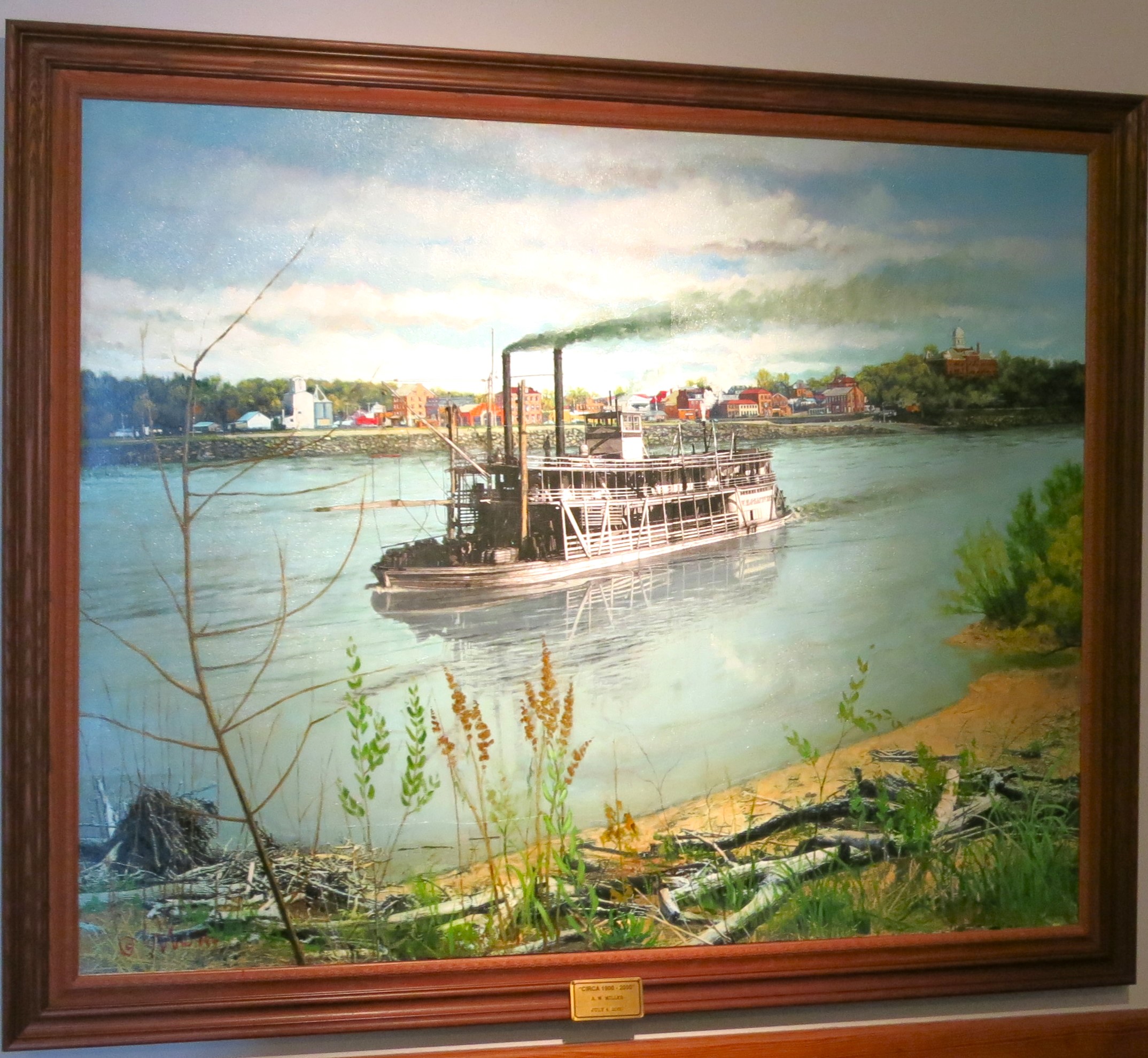 Here are some photos from inside the courthouse: the main courtroom, a chandelier hanging above the ground floor lobby, and a painting of a paddle-wheeler plying the Missouri River below the courthouse.