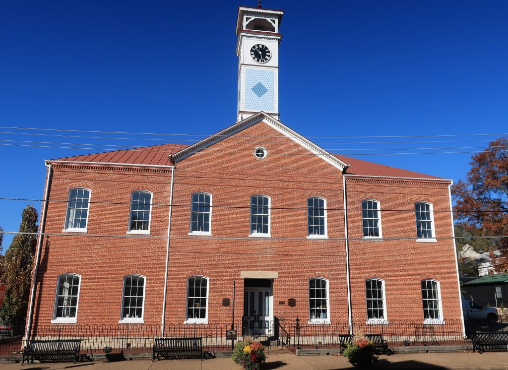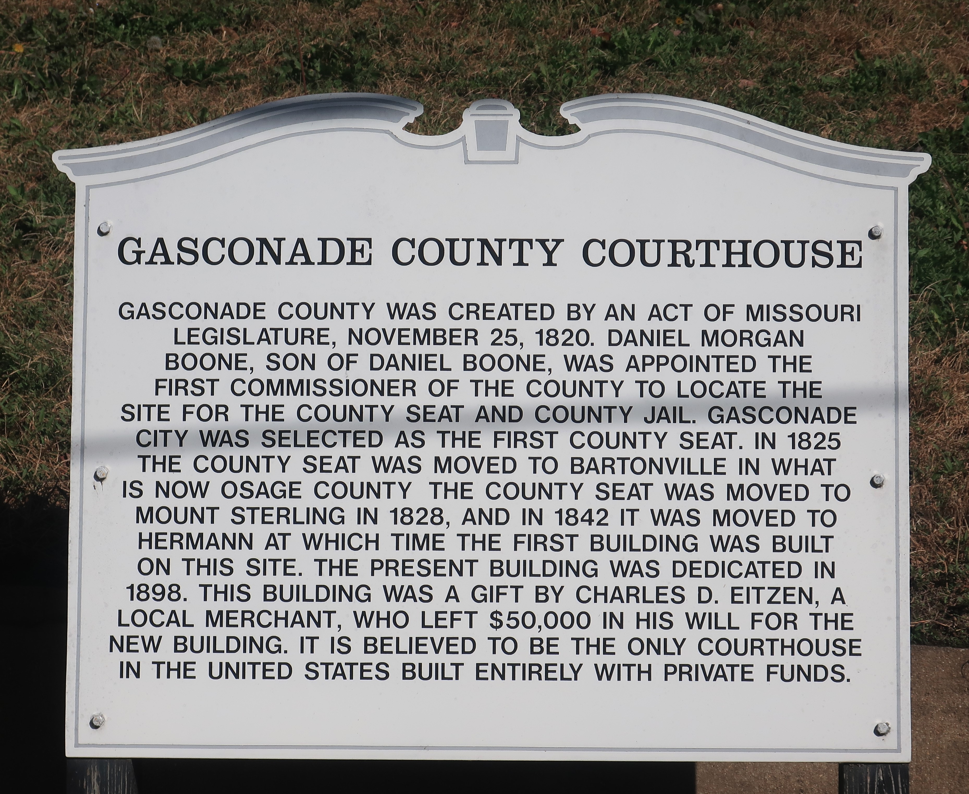 The Gasconade County Courthouse was built in 1889 on a bluff overlooking the Hermann town center and the Missouri River. A historical sign outside the building explains that the courthouse was funded entirely with private money and may be the only example of a public building in the United States that was financed in such a manner.