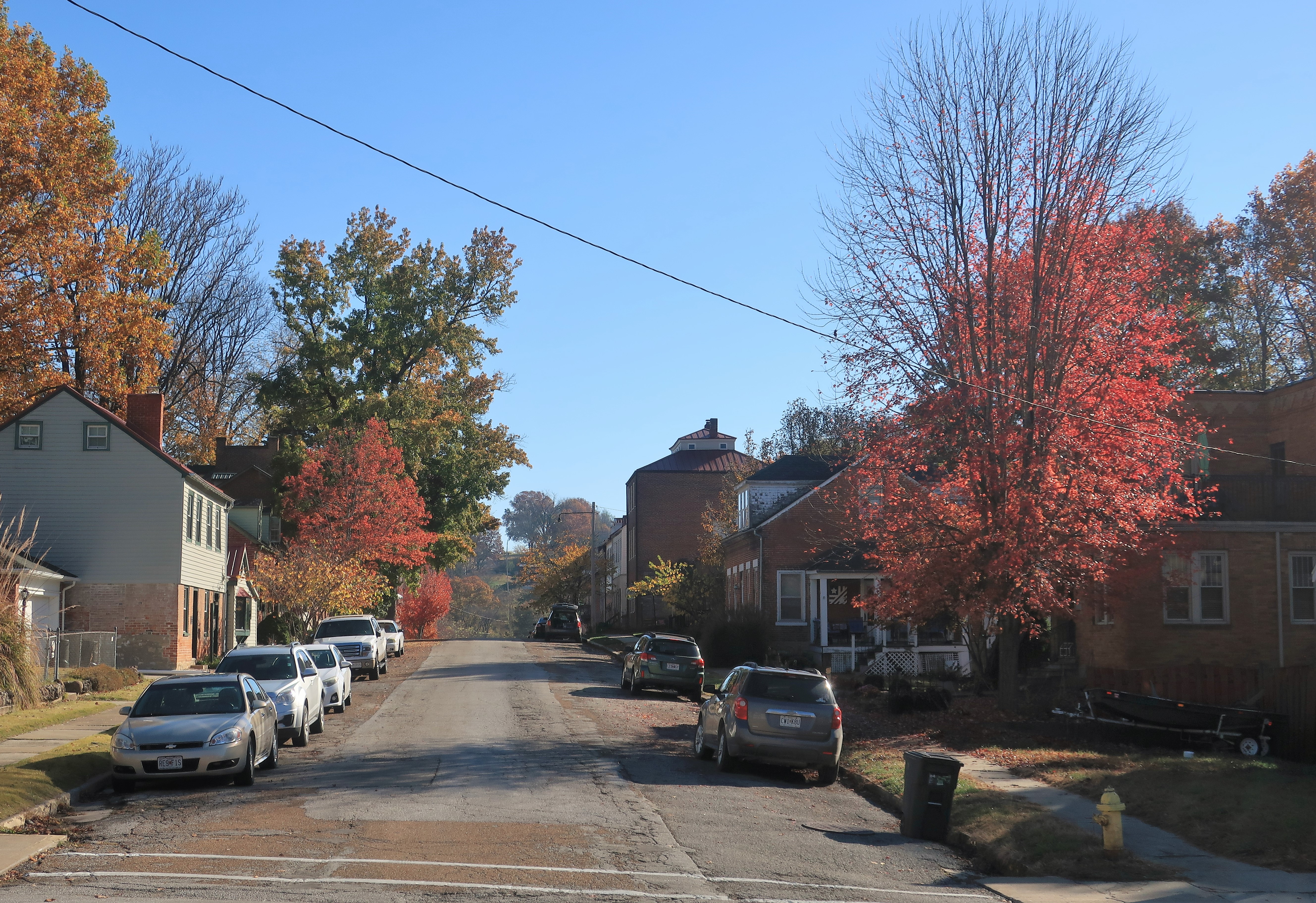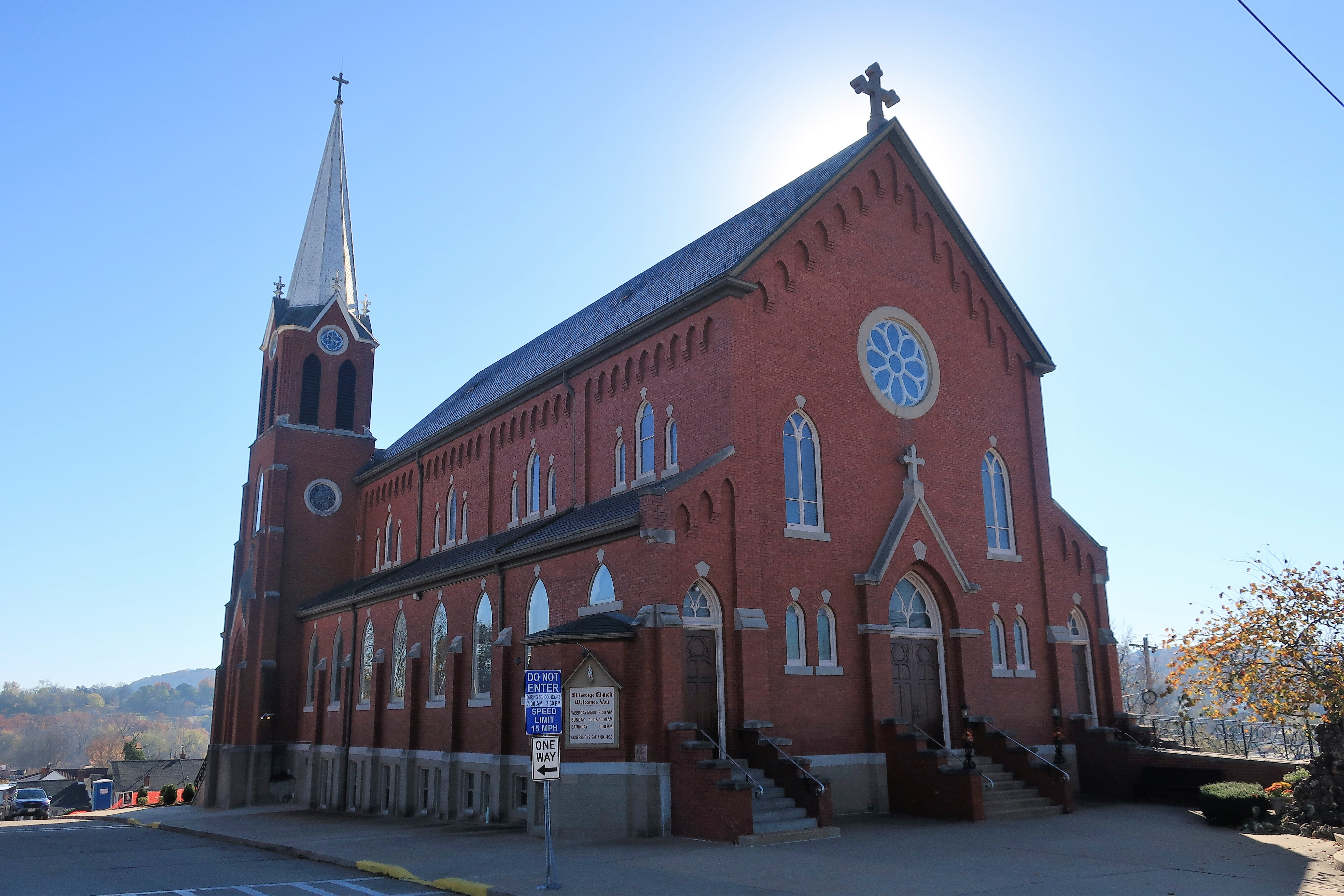 Looking west up 4th Street toward St. George Catholic Church at the top of the hill.