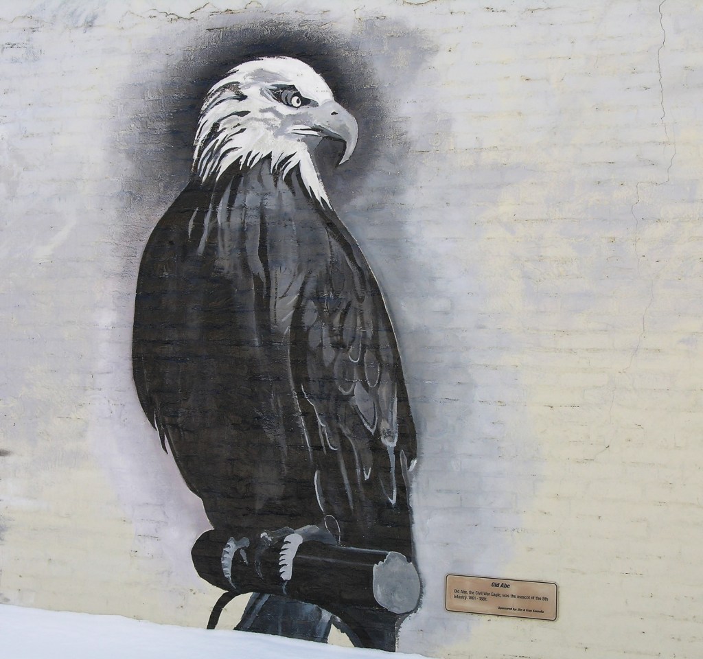 The drawing of Old Abe has an exciting story behind it. Old Abe was the mascot of the 8th Wisconsin Infantry regiment during the Civil War. Old Abe served with his company in over 42 battles, and it was said that “the louder the noise of battle, the louder were his screams.”