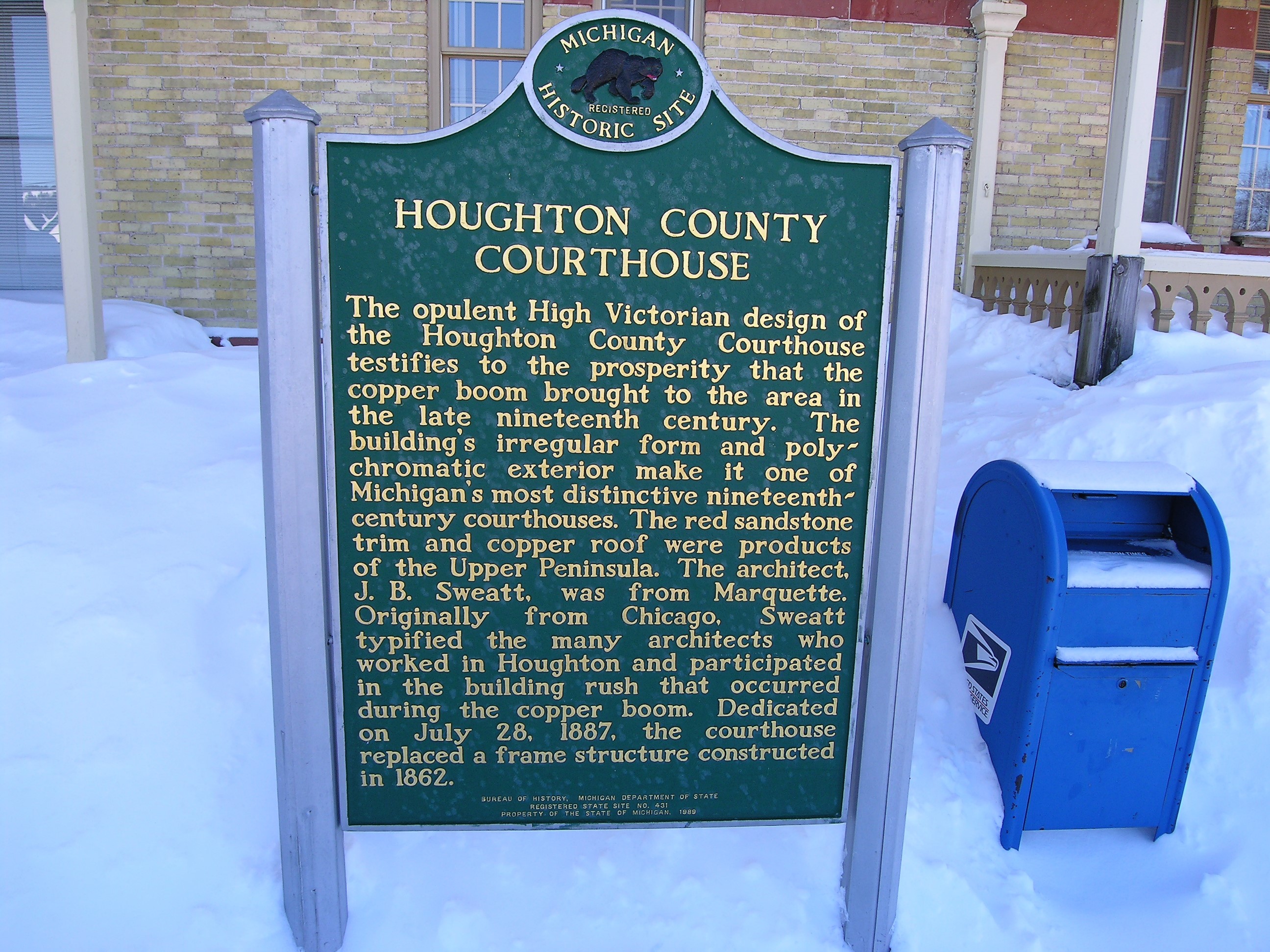 A historical sign peeks out above feet of snow to explain the history of the 1887 “High Victorian” Houghton County Courthouse.