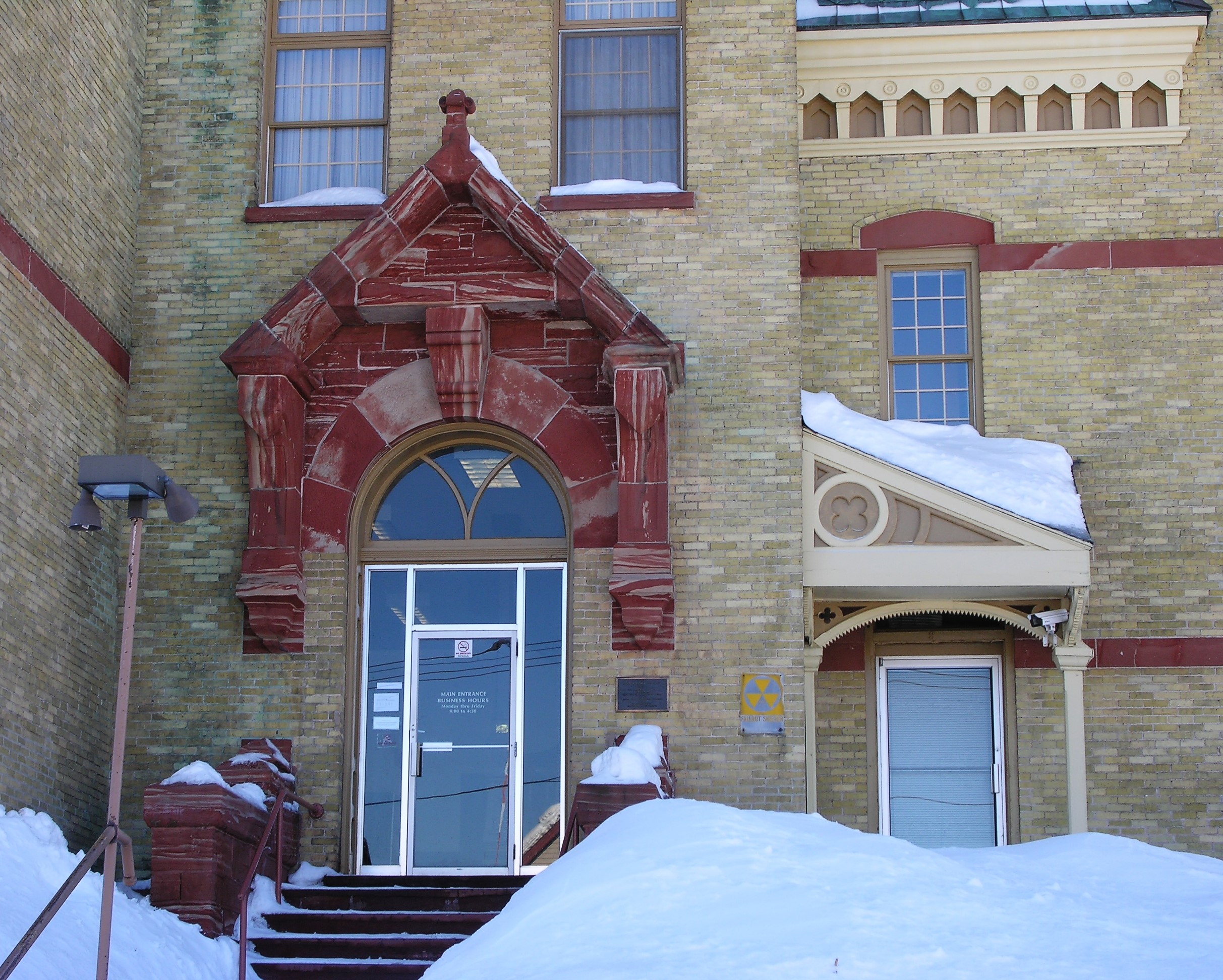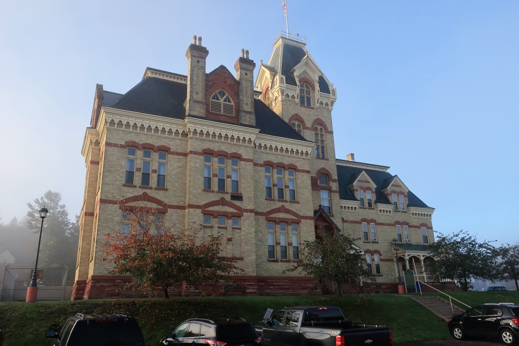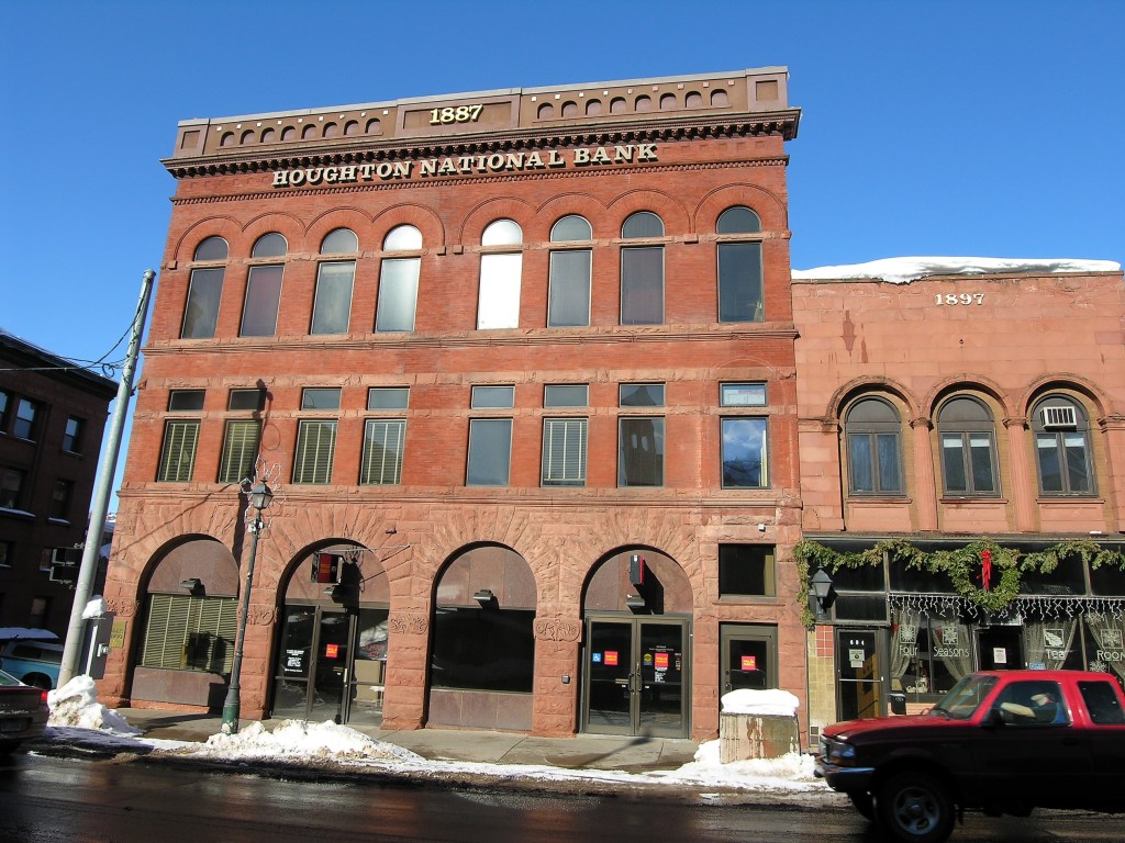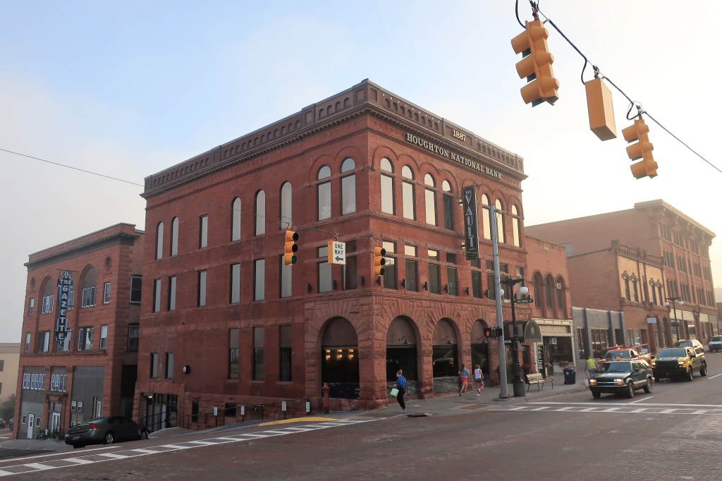 Along with the Douglas House (above), the Richardson Romanesque Houghton National Bank Building (below) dominates Houghton’s downtown. The structure was built in 1889 with locally quarried Jacobsville Sandstone and includes arched windows and first-floor stone carvings. Jacobsville Sandstone was in great demand, like Upper Michigan copper, in the late 19th and early 20th centuries. It was used in many prominent buildings throughout the United States, including the original Waldorf-Astoria Hotel in New York City. The use of red sandstone diminished as it gradually went out of fashion among architectural firms, replaced by a preference for white marble construction.