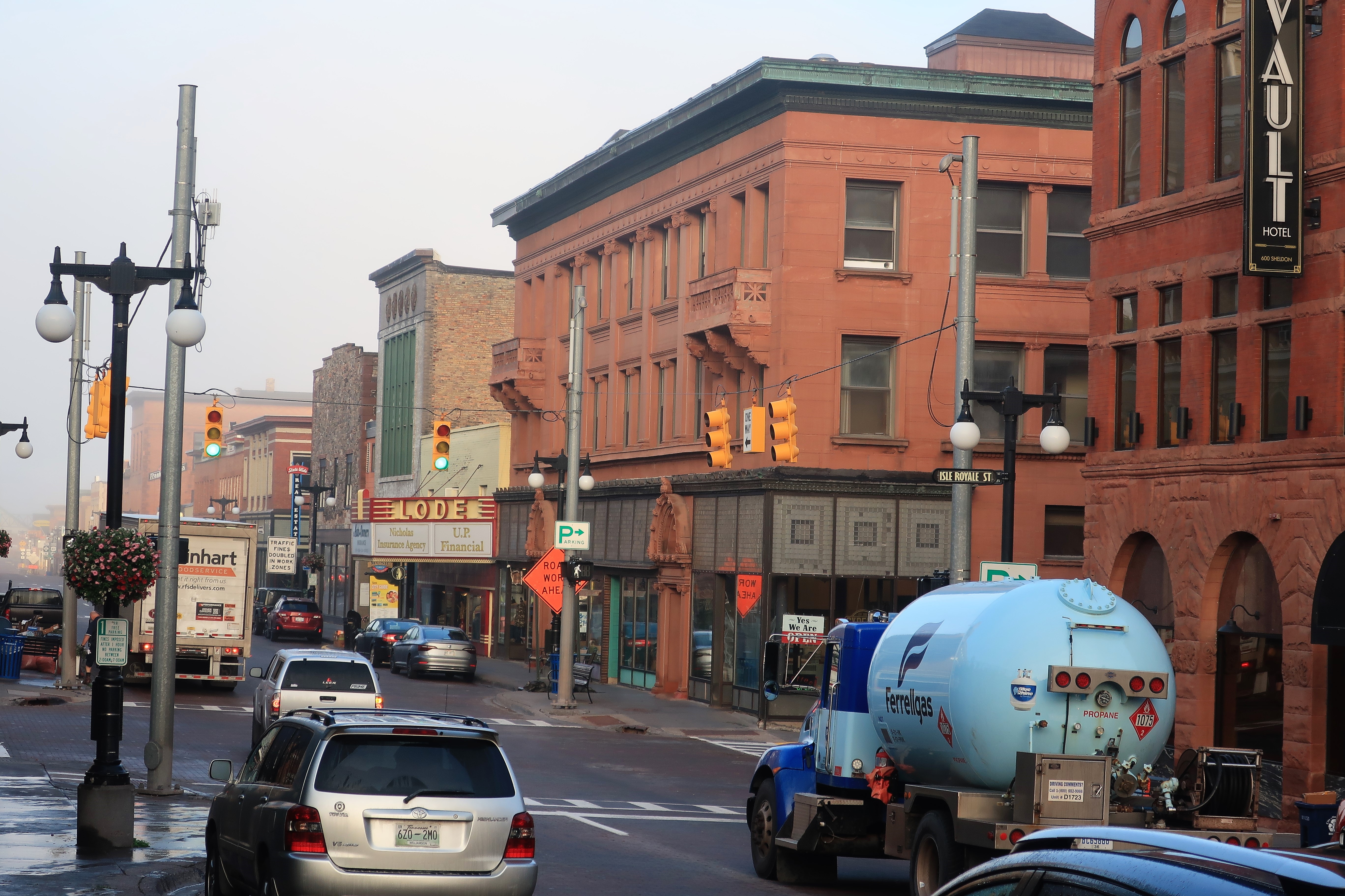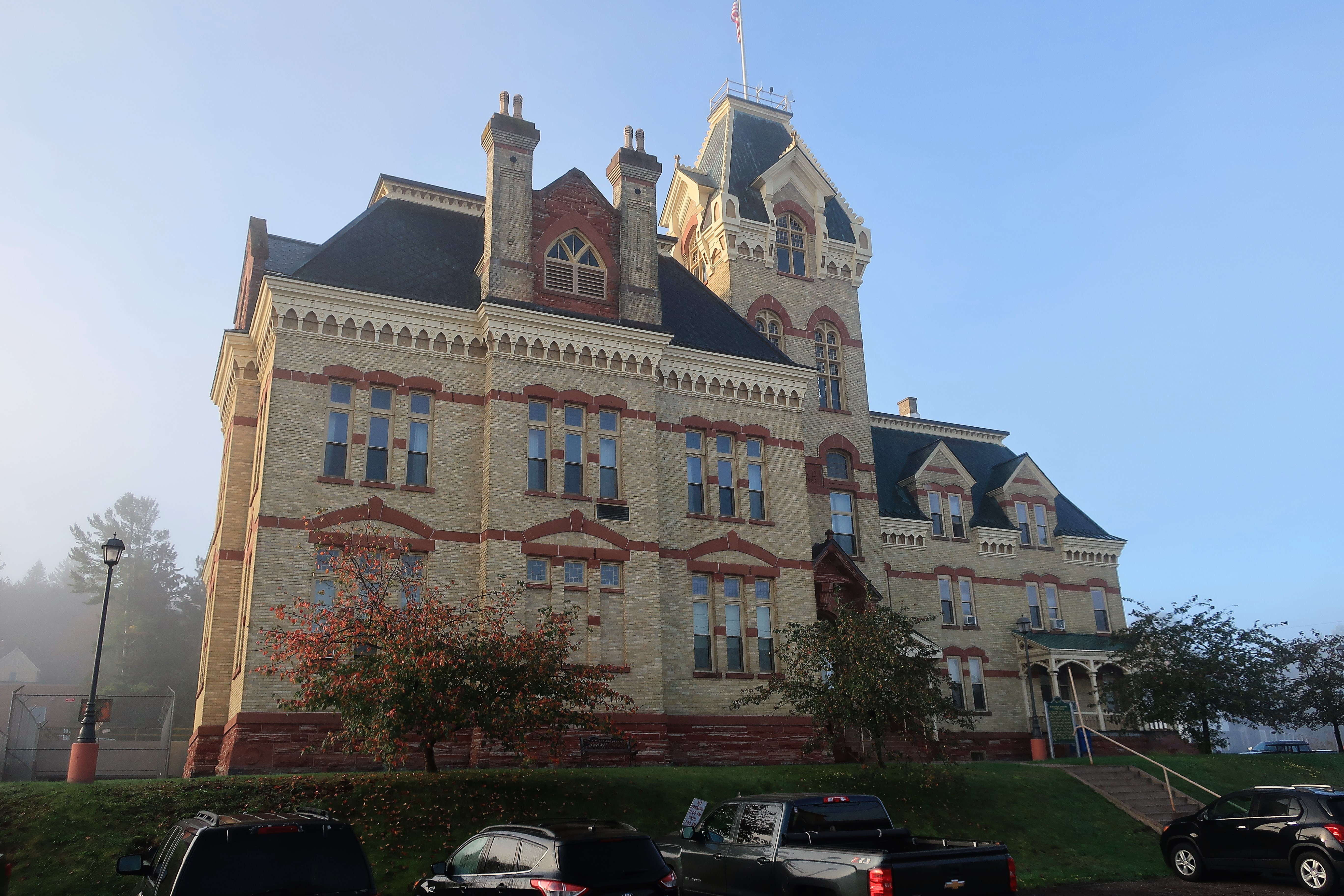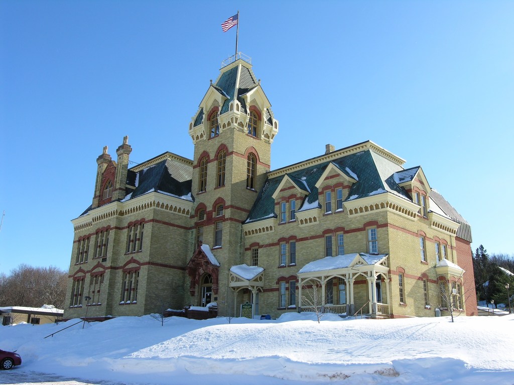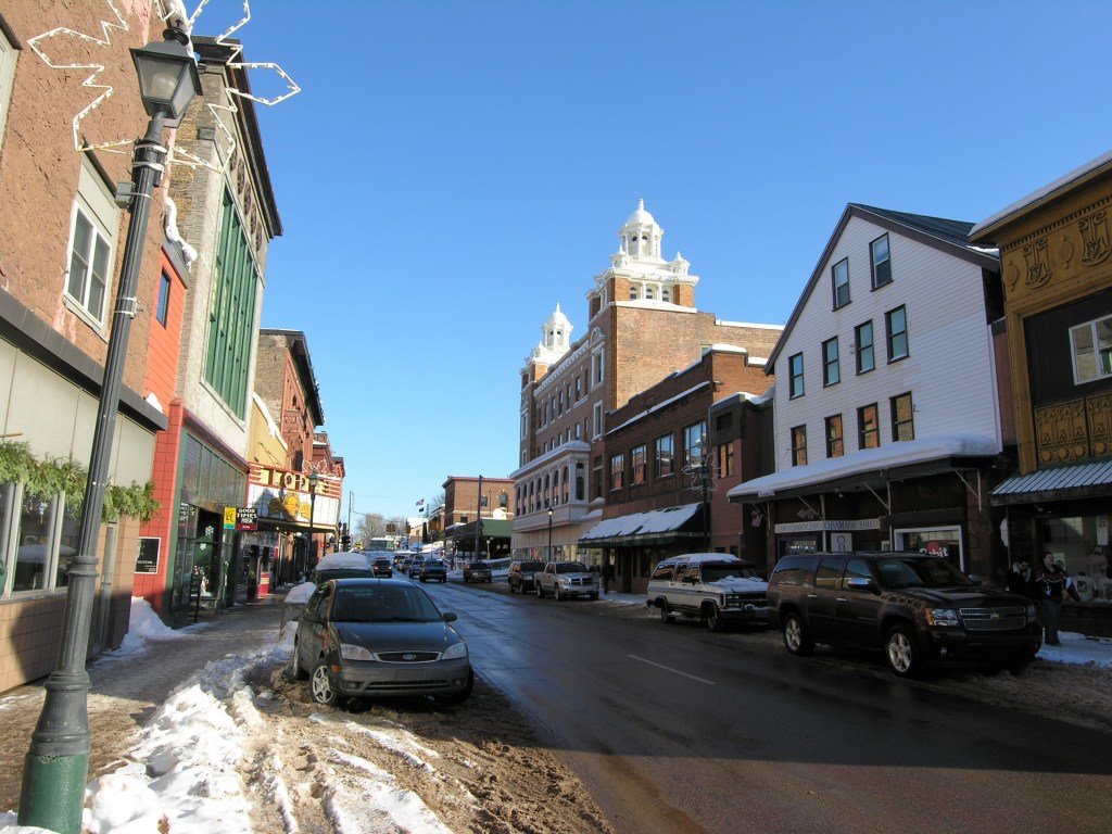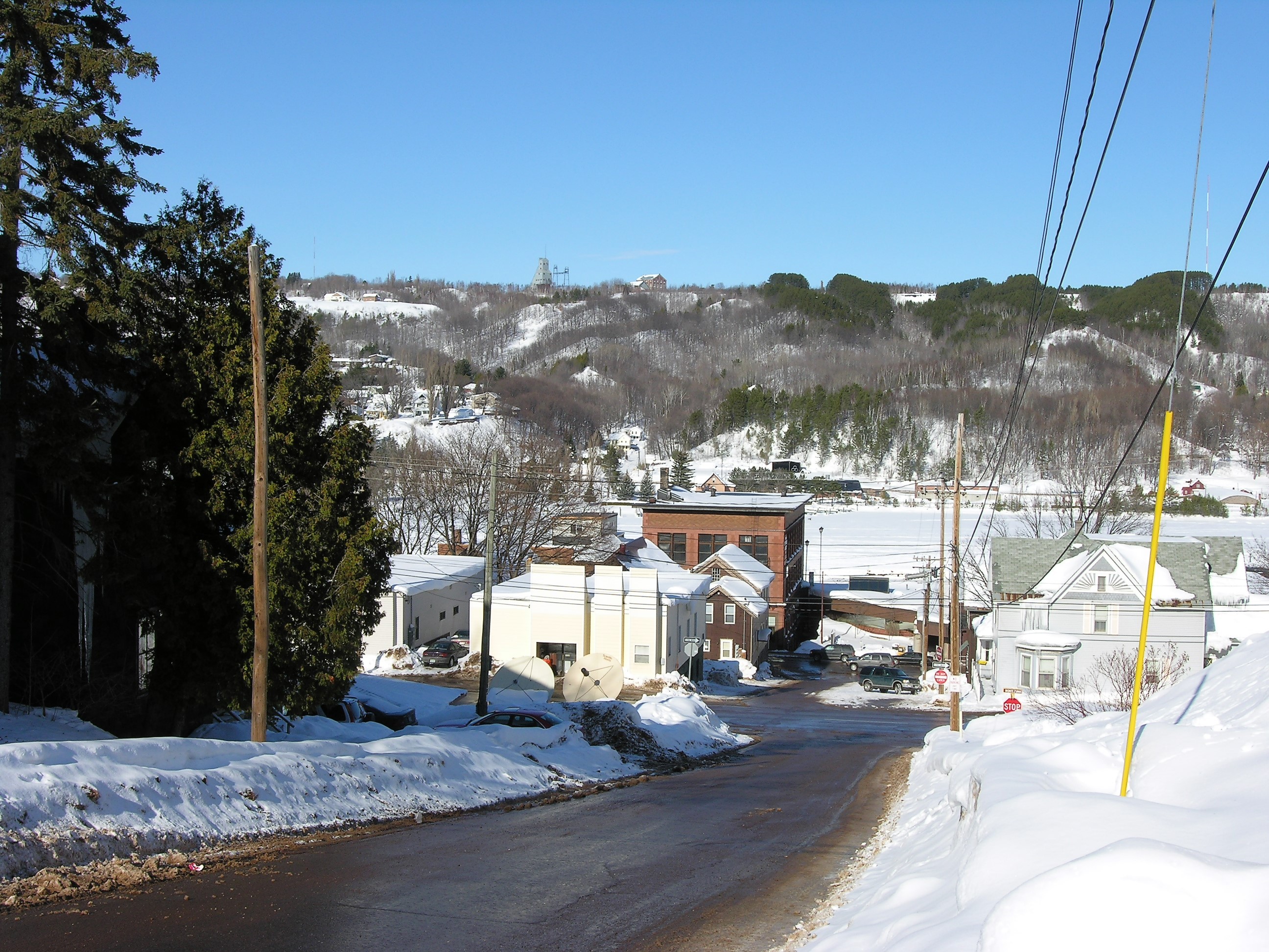 Houghton’s downtown district consists of a series of streets along a hillside parallel to the Keweenaw Waterway. The Houghton County Courthouse stands on Houghton Avenue, two parallel streets above Shelden Avenue. Since each successive street runs 20 feet higher than its predecessor, the Houghton County Courthouse towers above the city.