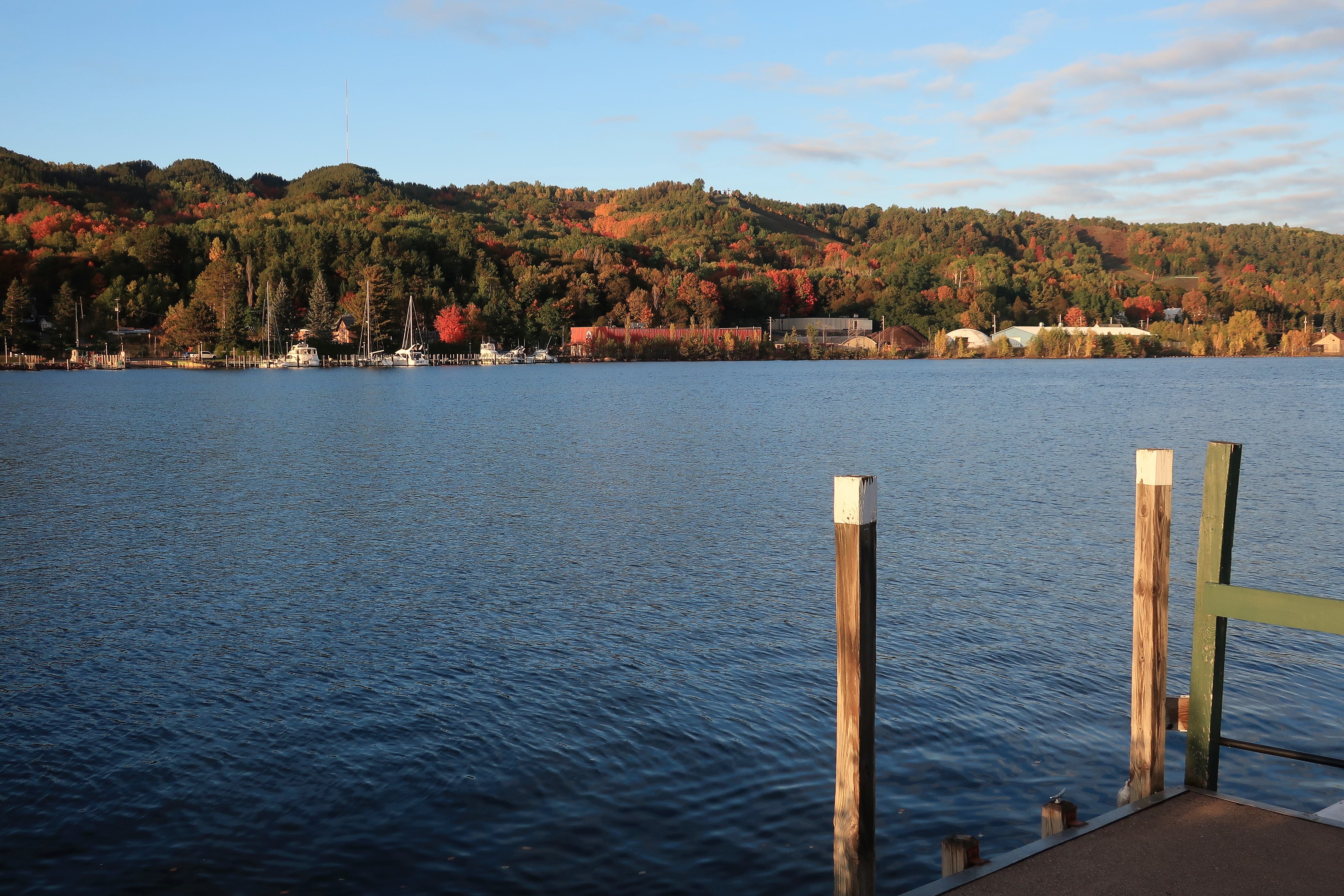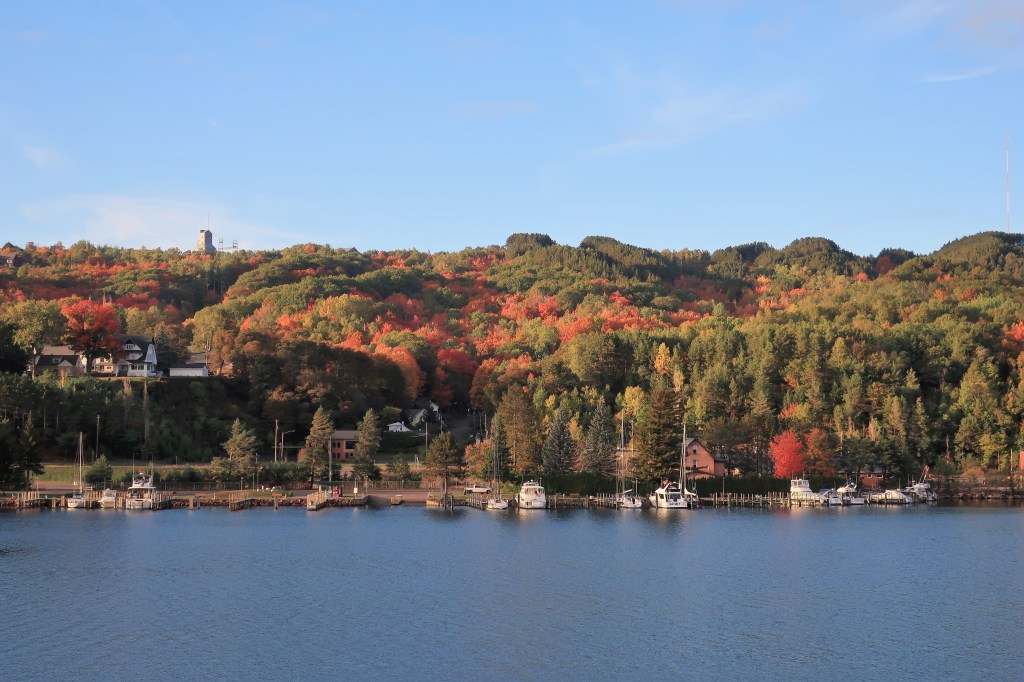 The winter vs. autumn photos below contrast Houghton’s snowy February with nearly the same view during October. Both images look down toward the Keweenaw Waterway from a hillside in downtown Houghton. The Keweenaw Waterway is a partially man-made canal that connects to Lake Superior at either end. The tower of the old Quincy Mine can be seen on the opposite hilltop, on the left side of both photos. While the February snow can be overwhelming, the early October foliage is spectacular.