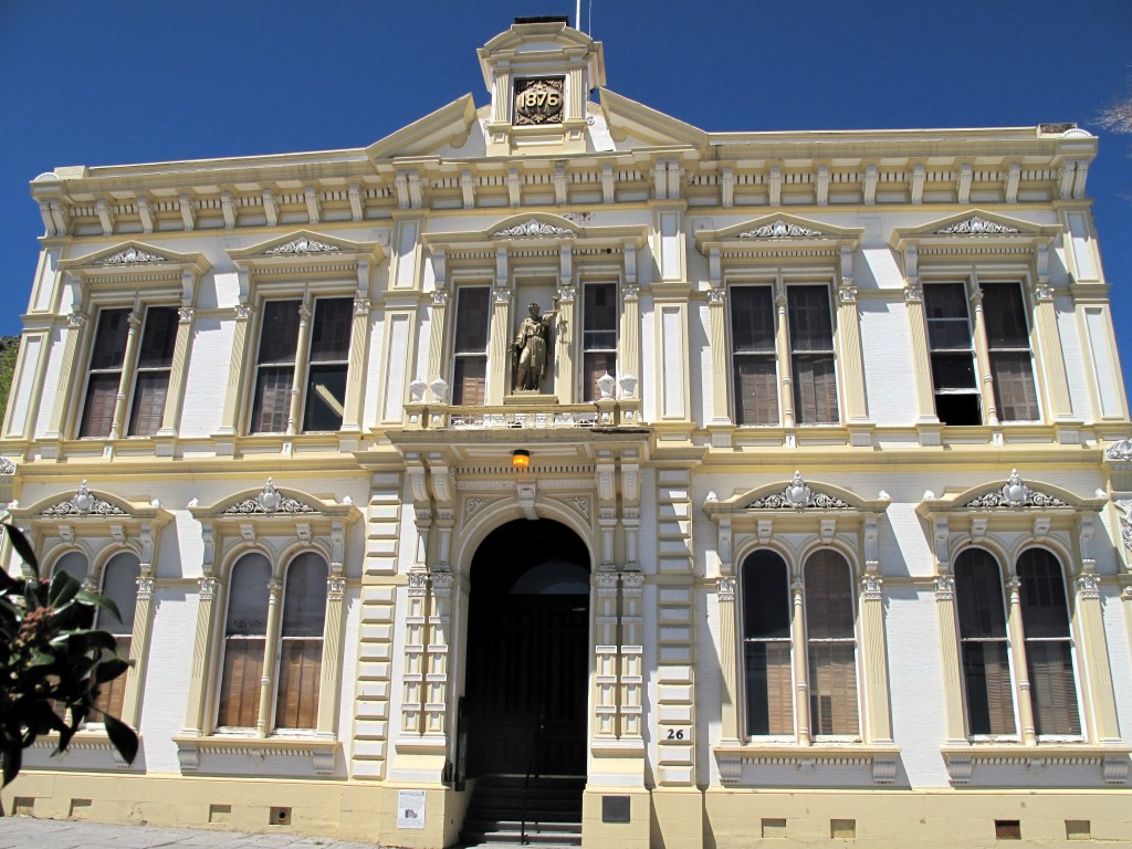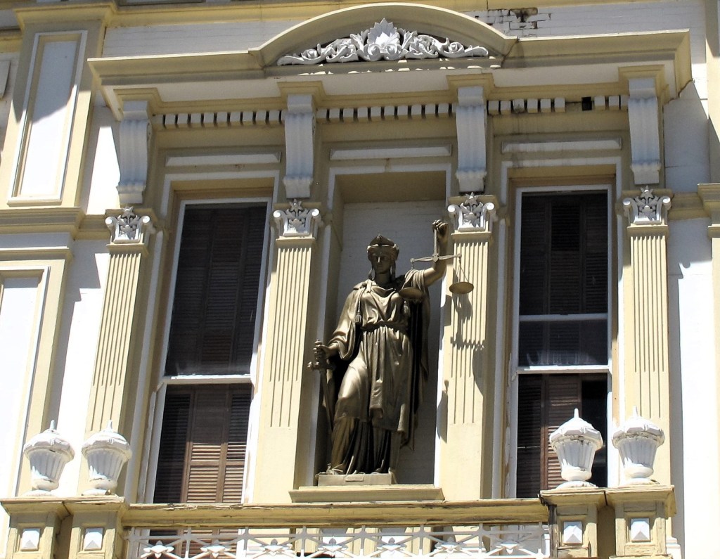 The front of the courthouse is painted white and gold.  Unfortunately, getting a frontal photo is challenging since “C” Street is so narrow.  The historical sign mentions that the statue of Lady Justice above the front door has no blindfold over her eyes.  Only 20 other such Justice statues in the country are blindfold-less.