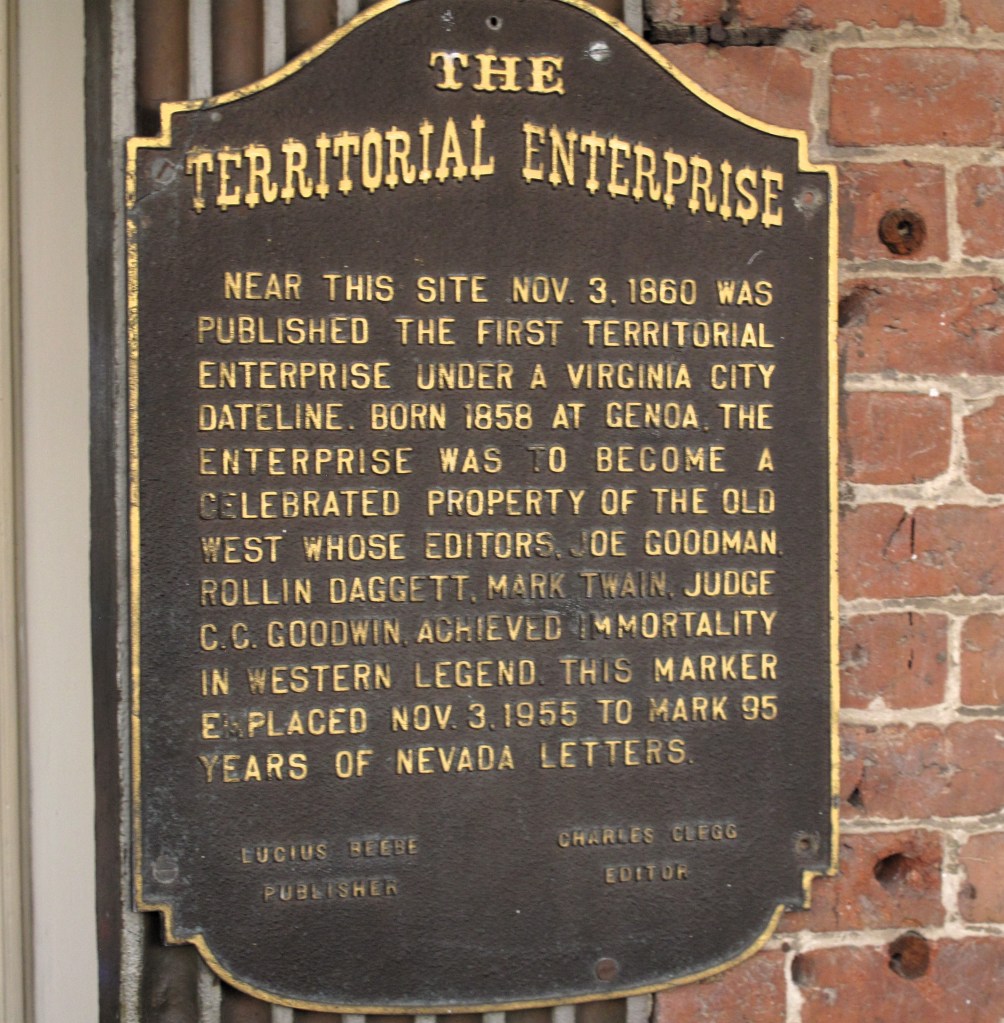 Historical sign explaining the history of the Territorial Enterprise. Mark Twain was one of its writers.