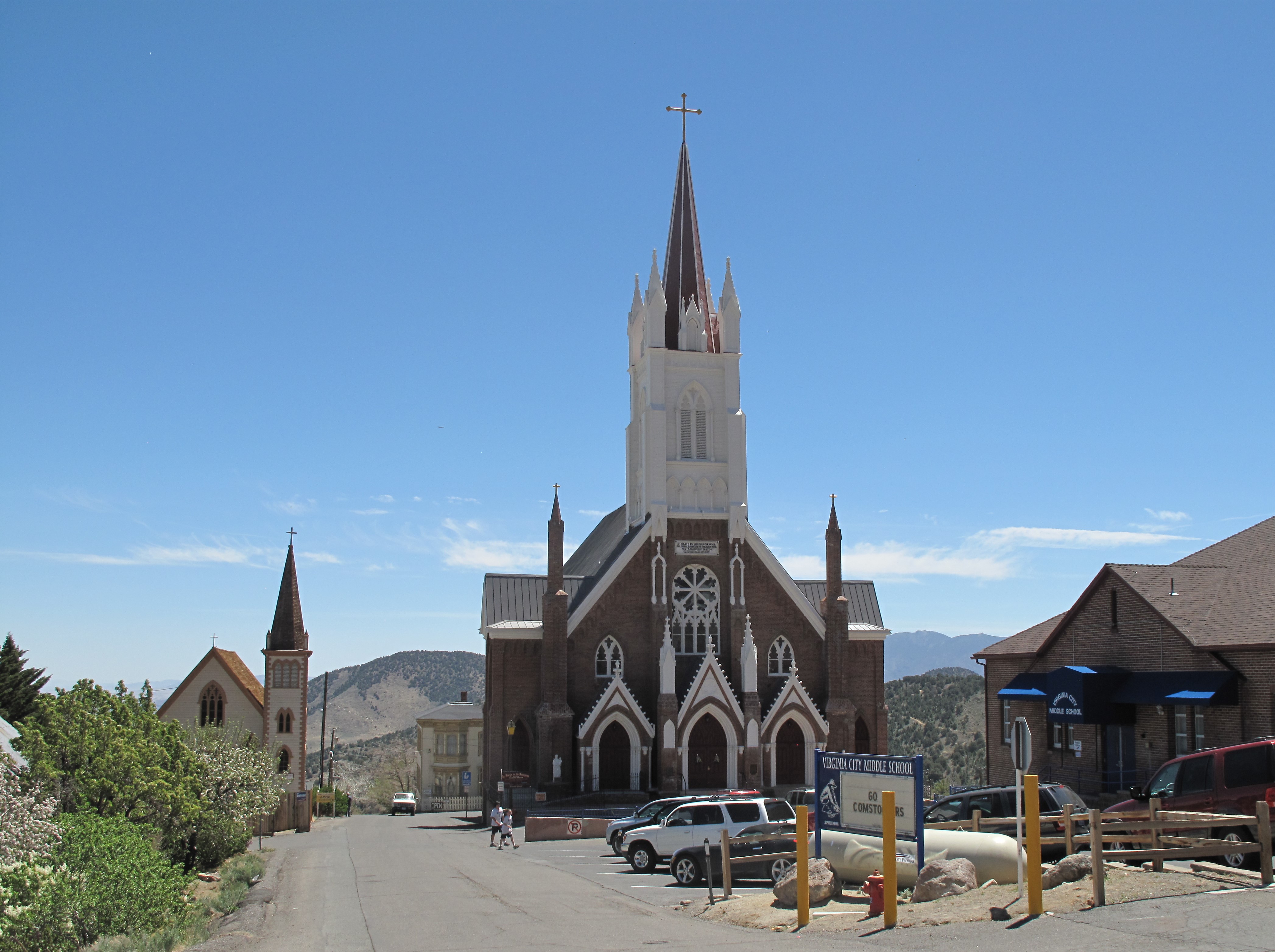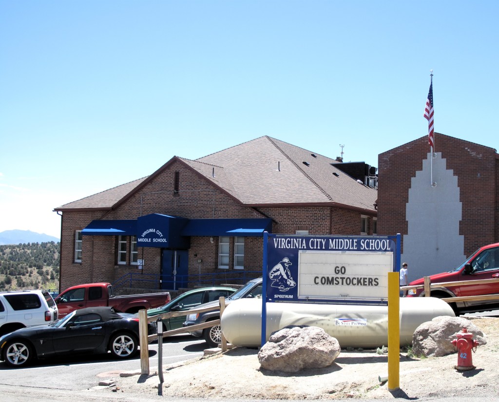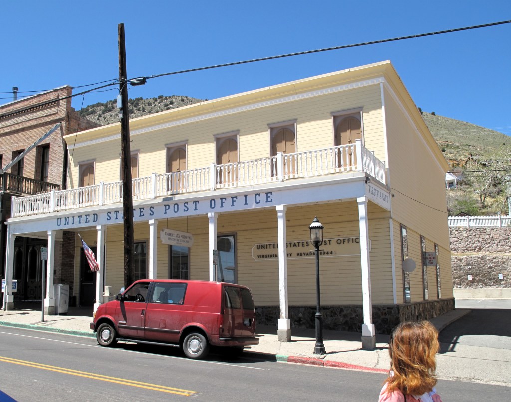 Not every building is associated with the tourist trade. Below: (left) St. Mary in the Mountains Catholic Church (still in use as a church); (center) Virginia City Middle School (Go Comstockers!); (right) United States Post Office, Virginia City, NV 89440.